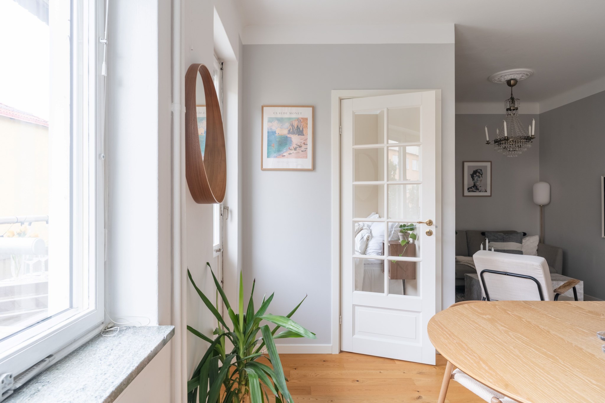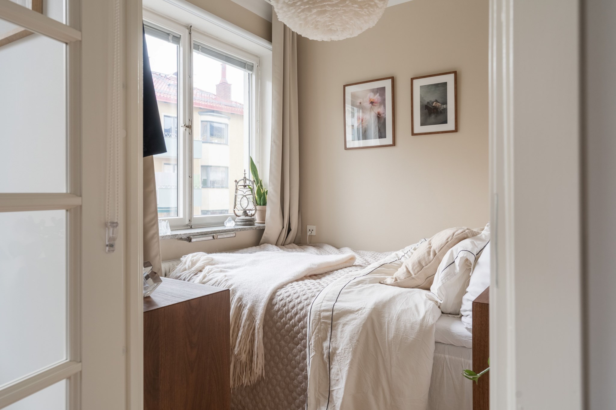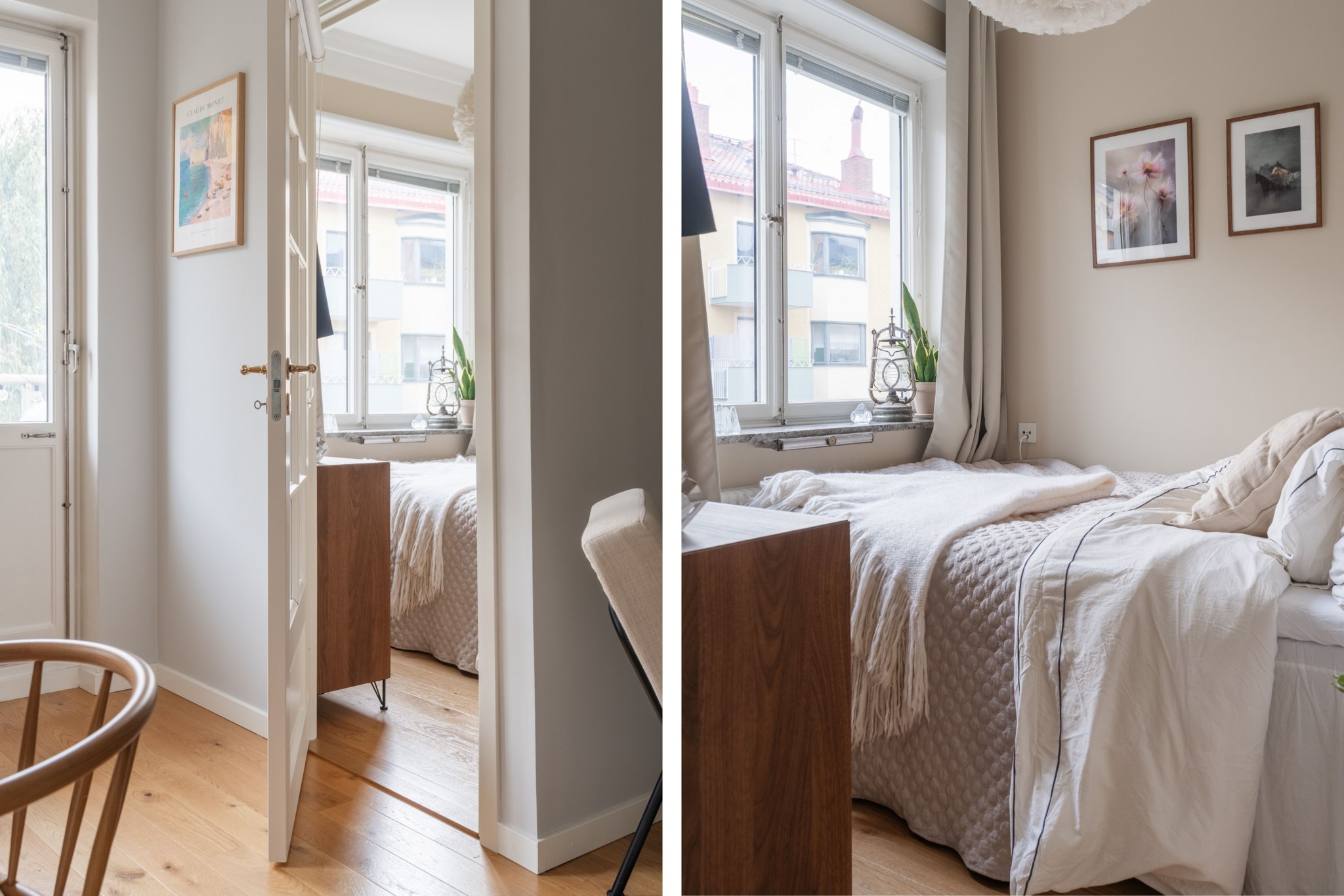Rogivande sovrum som nås via en charmig dörr med spröjs. Rummet har ett naturligt, fint ljusinsläpp och plats för en större säng samt exempelvis garderob eller annan förvaringsmöbel. Ljusmålade ytskikt och vackert, ljust golv.