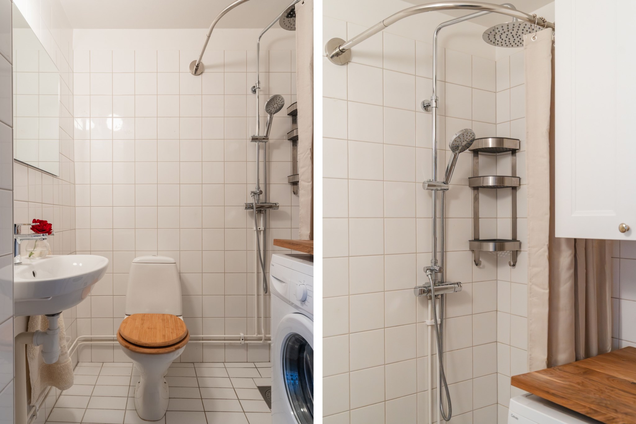 Badrum försett med ljust kakel och ljust klinkergolv. Badrummet är inrett med WC, handfat, spegel, badrumsskåp, tvättmaskin samt dusch.