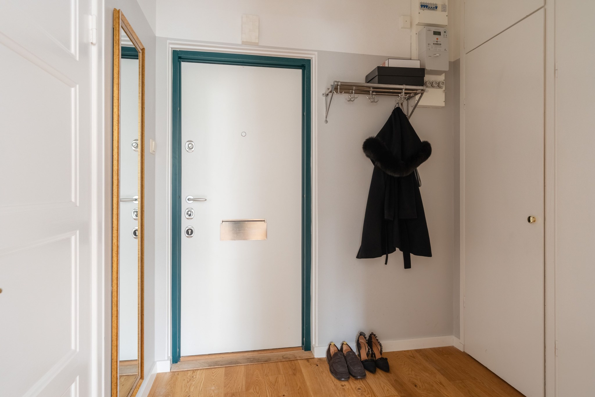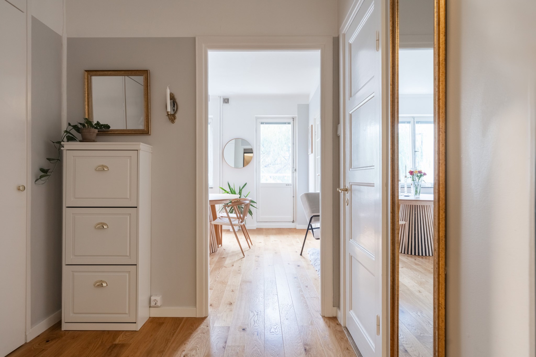 Rymlig och välkomnande hall med lättillgänglig avhängning av ytterkläder och skor direkt innanför ytterdörren. Här finns även plats för möblering med exempelvis byrå eller sideboard vilket ger möjlighet till ytterligare förvaringsmöjligheter. Ljusmålade ytskikt och vackra, ljusa golv.