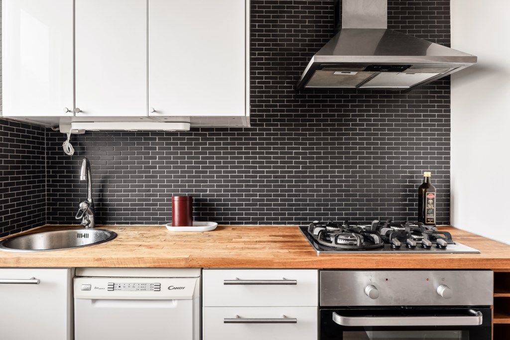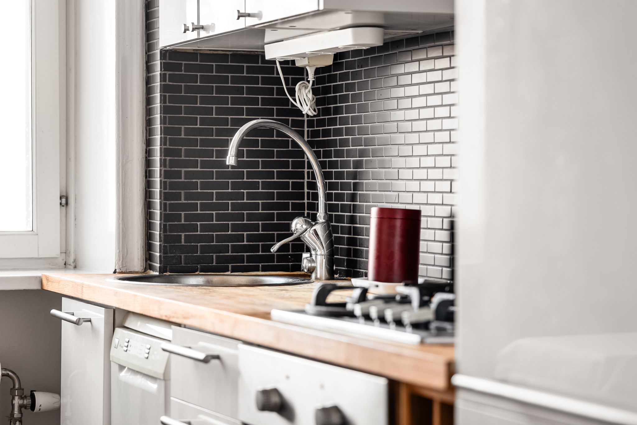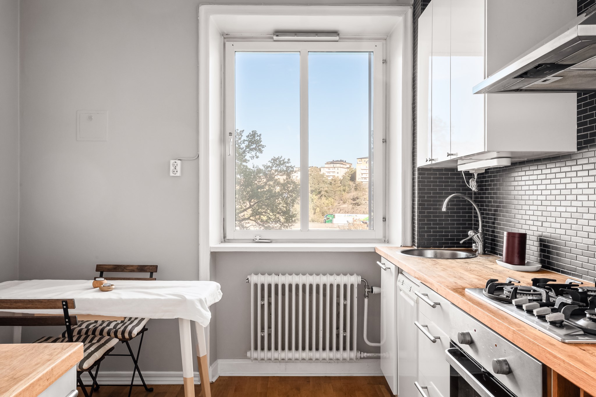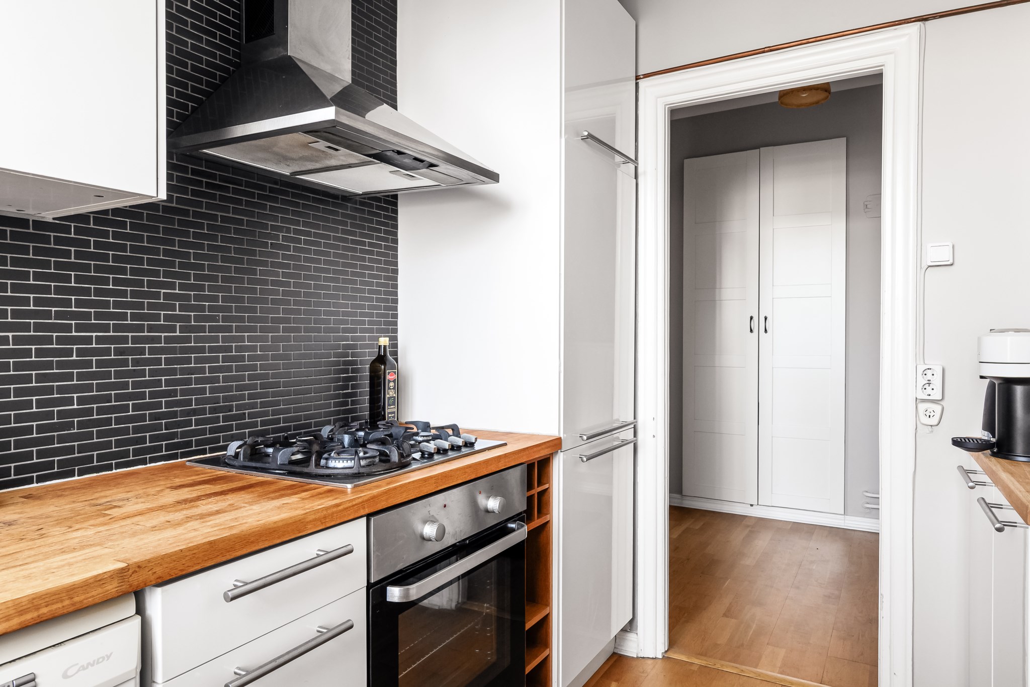 Ljust kök med fint ljusinsläpp från fönster och matplats placerad intill. Inredningen består av ljusa köksluckor, mörk kaklad väggpanel och en bänkskiva i trä som ger en varm kontrast till de ljusa tonerna. Den maskinella utrustningen omfattar kyl/frys, gasspis, fläkt, ugn och diskmaskin. Målade ytskikt och ljust golv.