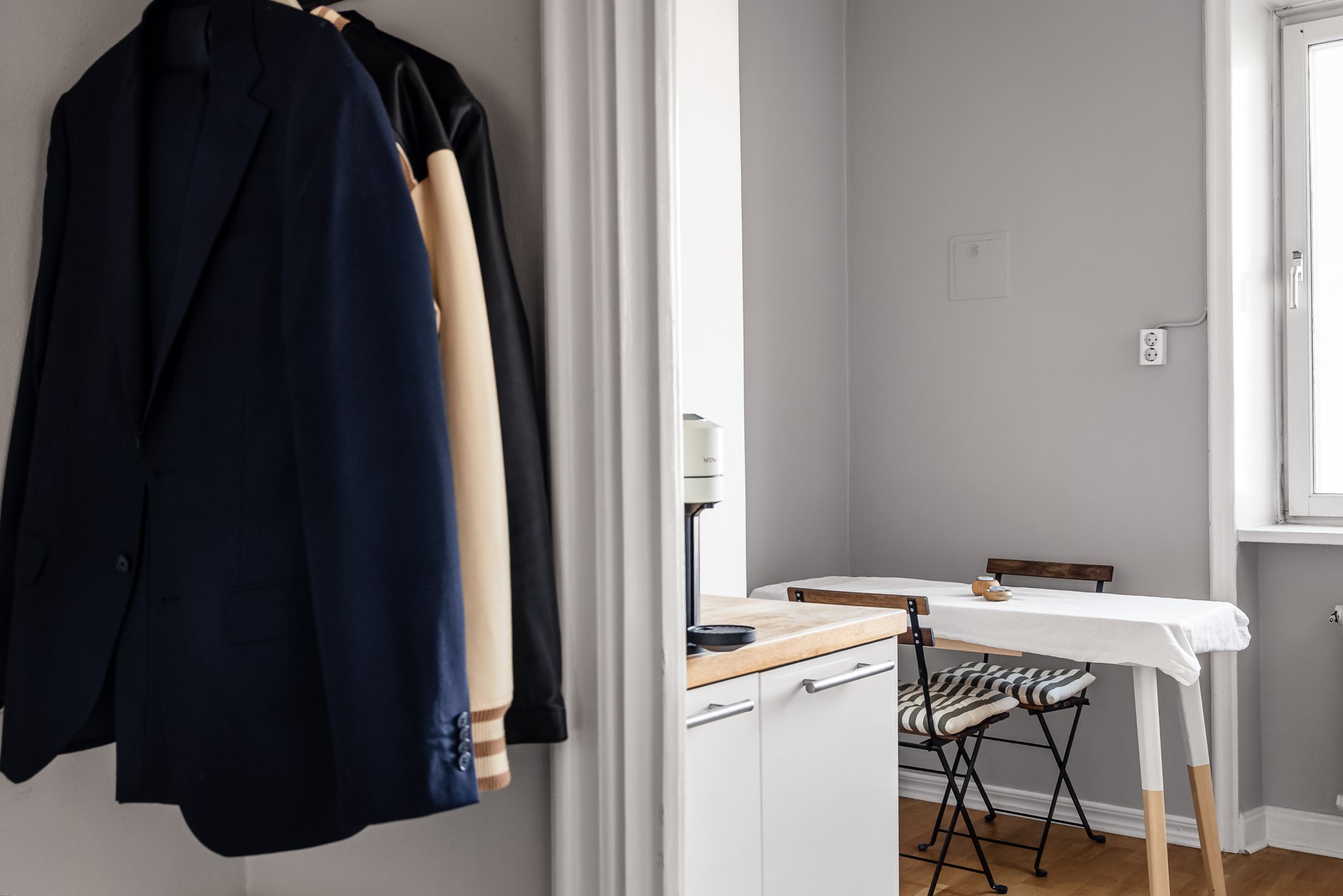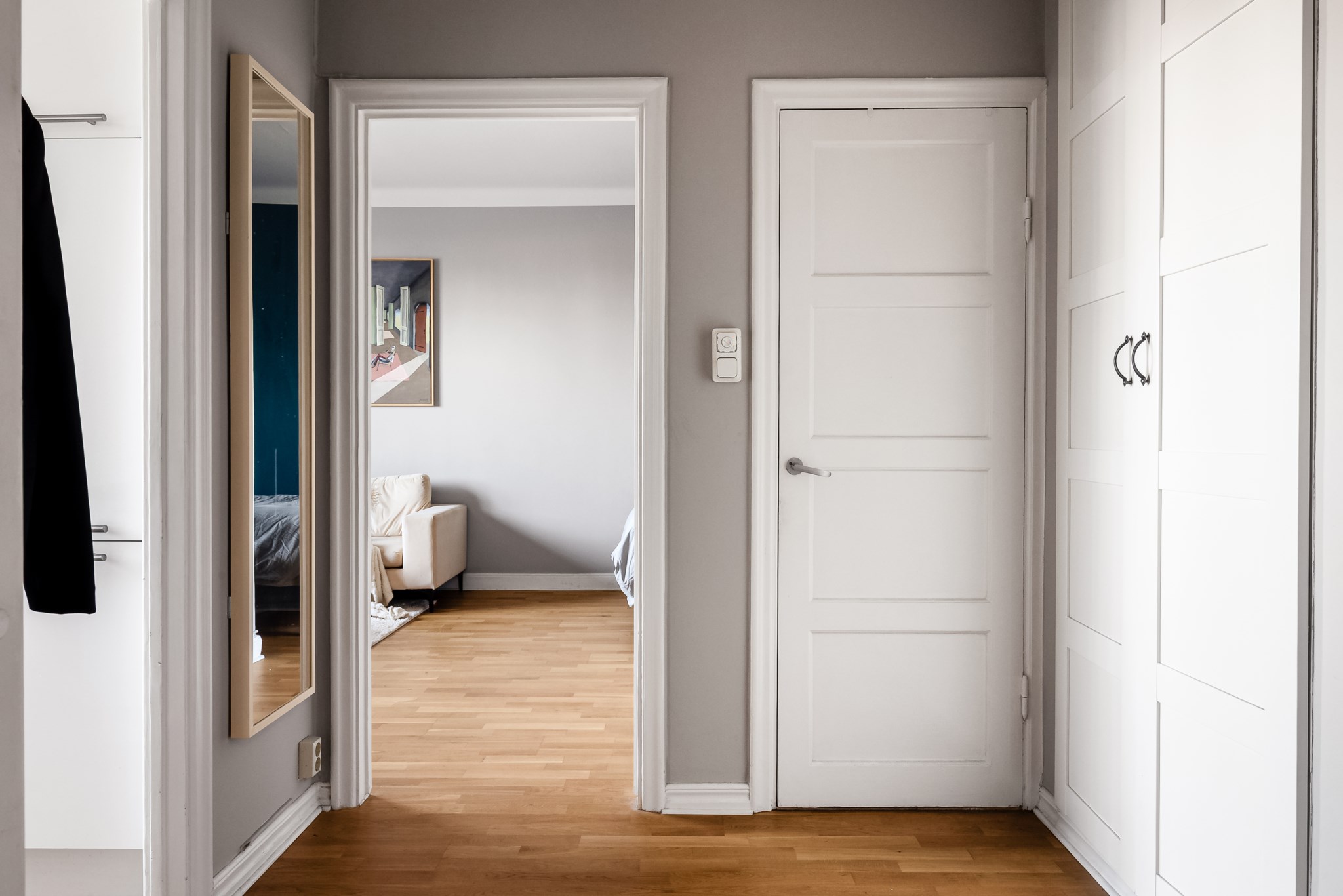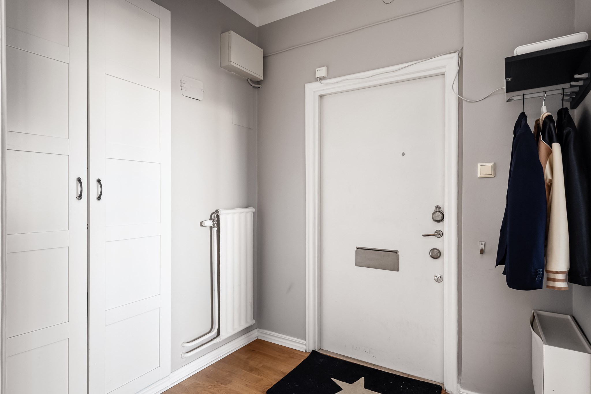 Rymlig och välkomnande hall med målade ytskikt och ljust golv. Här finns goda förvaringsmöjligheter i garderober samt plats för hatthylla för smidig avhängning av ytterkläder och skor.