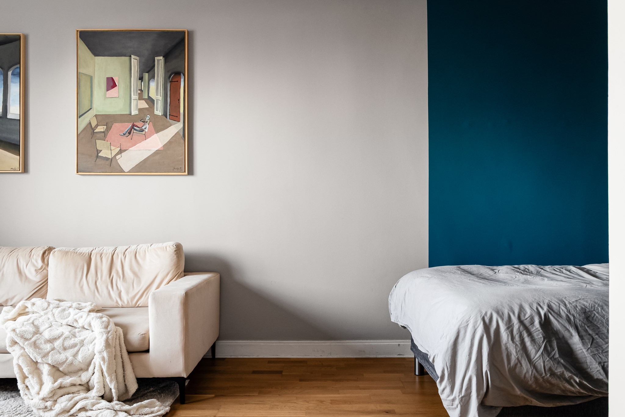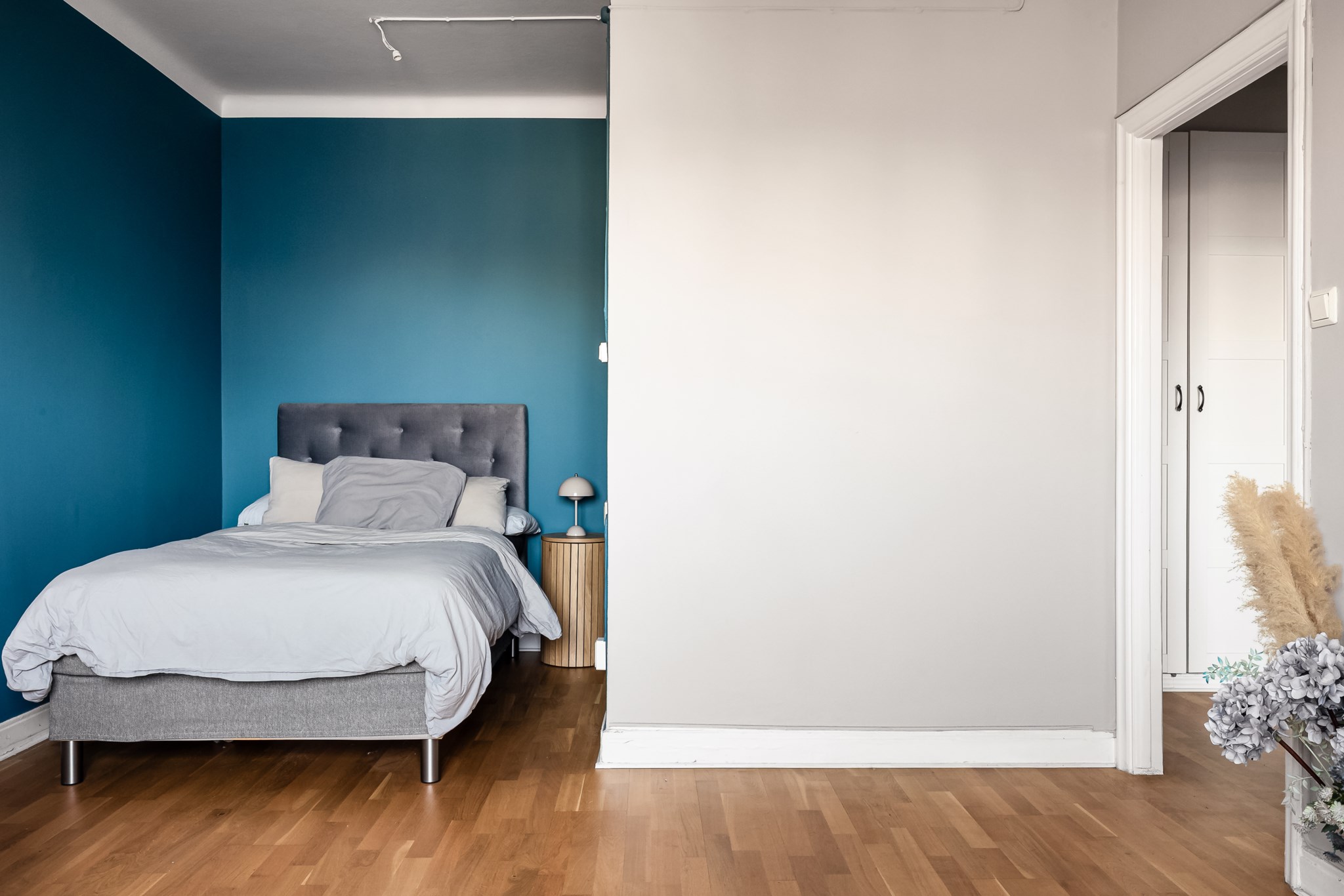 Trivsamt vardagsrum med målade ytskikt och ljust golv. Det stora fönsterpartiet i insynsskyddat läge ger ett vackert ljusinsläpp och skapar en lugn och behaglig atmosfär. Här finns gott om plats för soffa, soffbord och annan personlig inredning som kan anpassas efter behov och smak. En sovalkov erbjuder dessutom en naturlig och avskild plats för säng.
