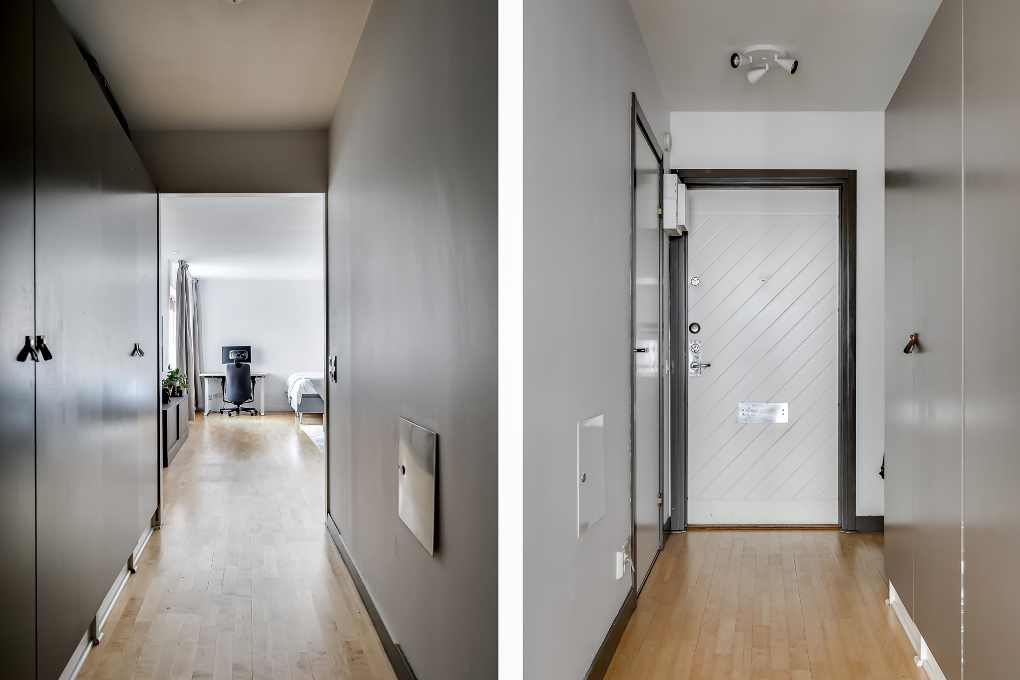 Välkomnande hall med gott om plats för avhängning direkt vid entrén. Här möts du av ljusa väggar, ett ljust golv som och bra förvaringsmöjligheter i form av generösa garderober som gör att hallen känns både praktisk och lättmöblerad.