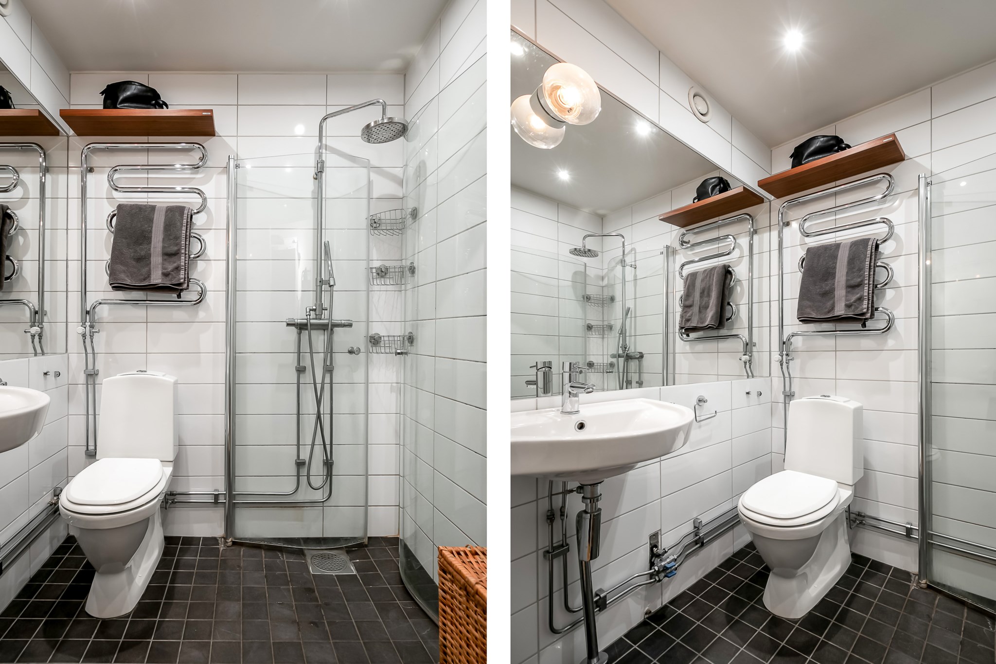 Fräscht och välplanerat badrum med vitt kakel och stilrent grått klinkergolv. Här finns WC, dusch, handfat, handdukstork, en stor spegel och golvvärme för extra komfort.