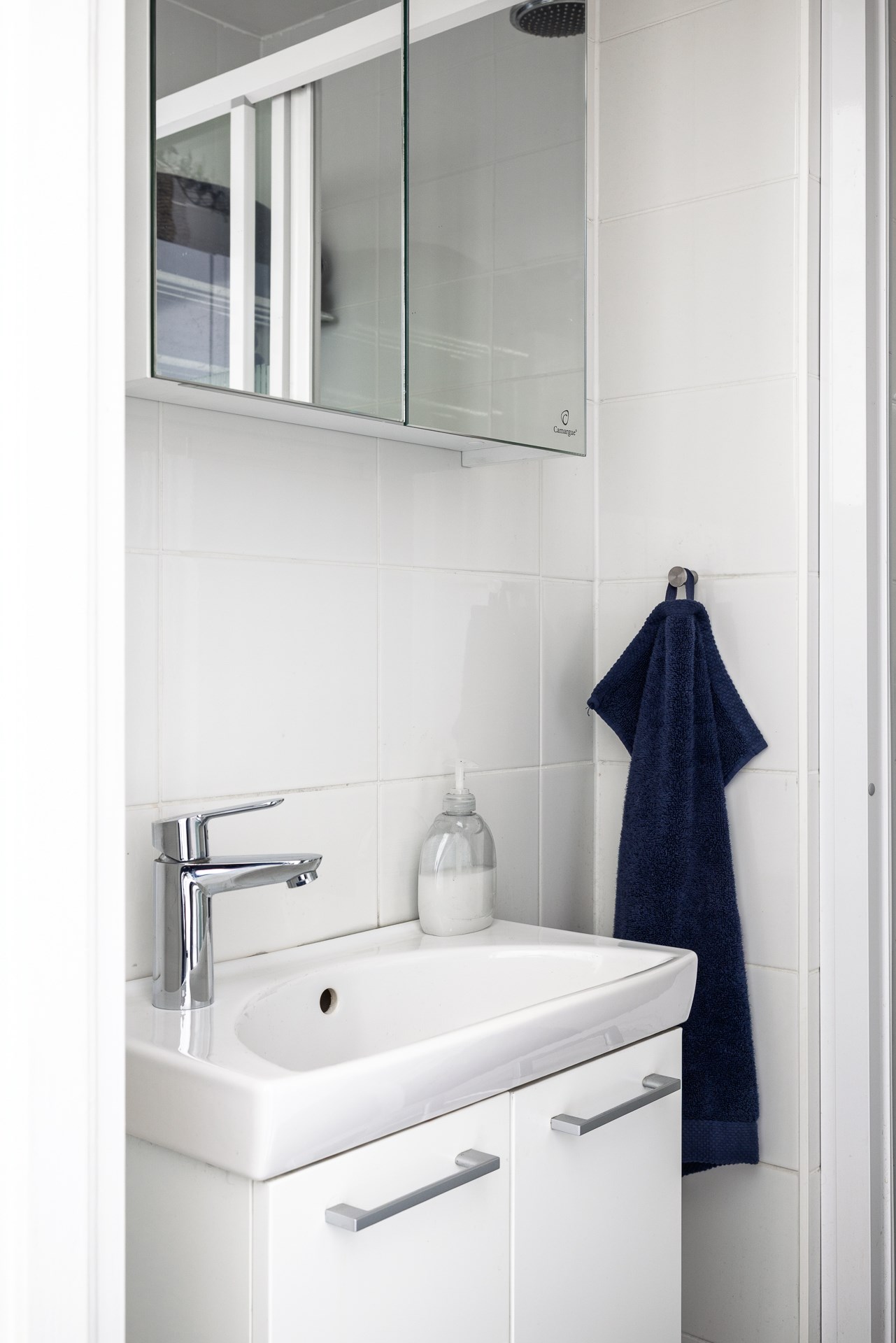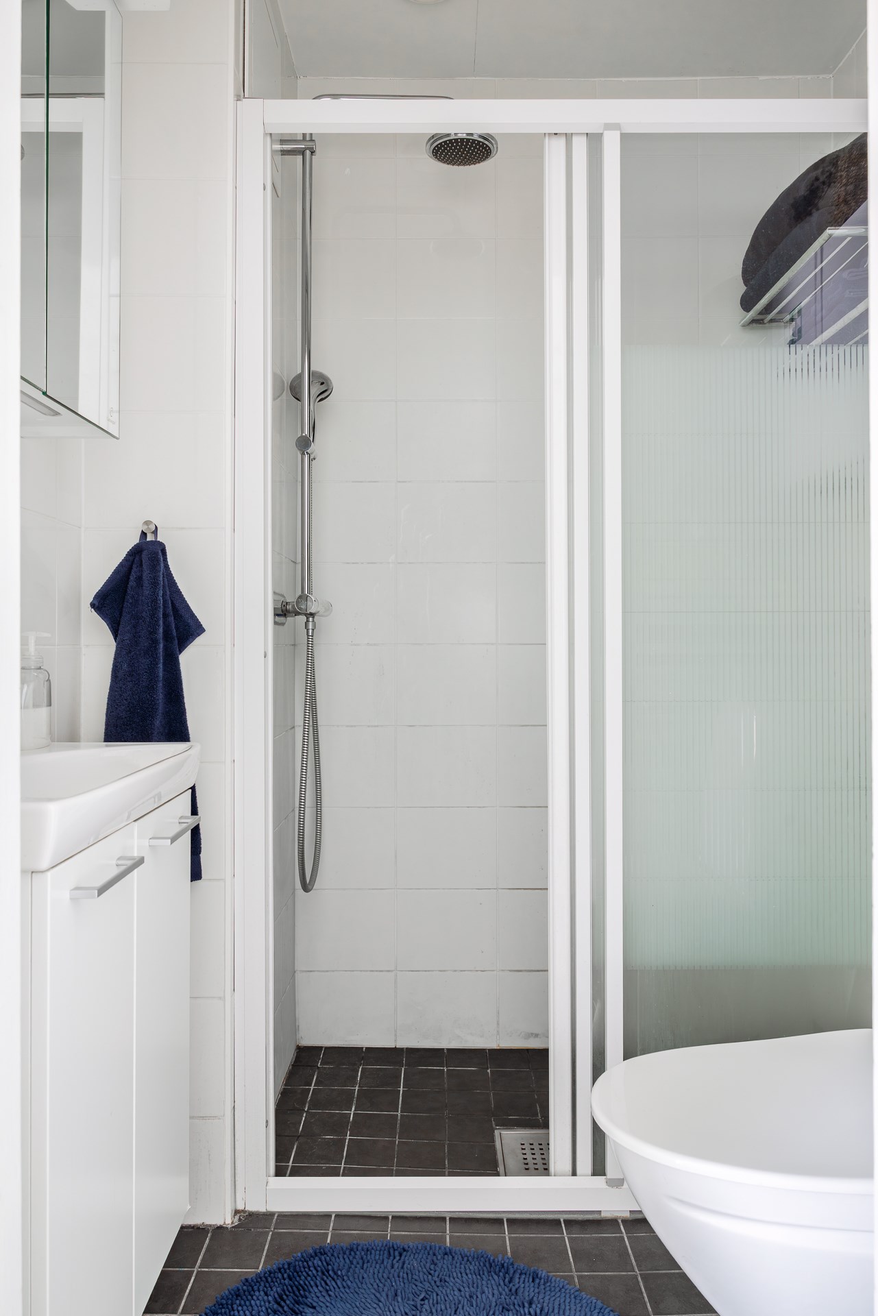 Badrummet är helkaklat och inrett med duschvägg, wc och handfat. Väggarna är klädda med vitt kakel som ger ett tidlöst och fräscht intryck, och golvet är belagt med klinker i neutral ton som skapar en harmonisk helhet.