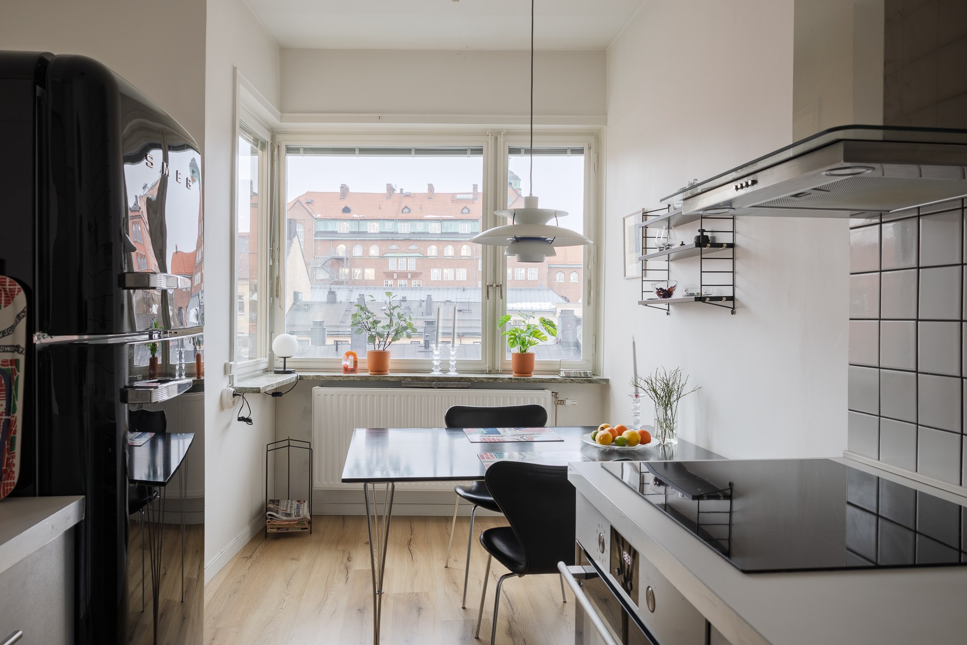Matrummet präglas av ett fantastiskt hörnfönsterparti som omfamnar matplatsen och ger ett generöst ljusinsläpp samt fin utsikt över takåsarna. Här skapas en trivsam och inbjudande miljö för måltider