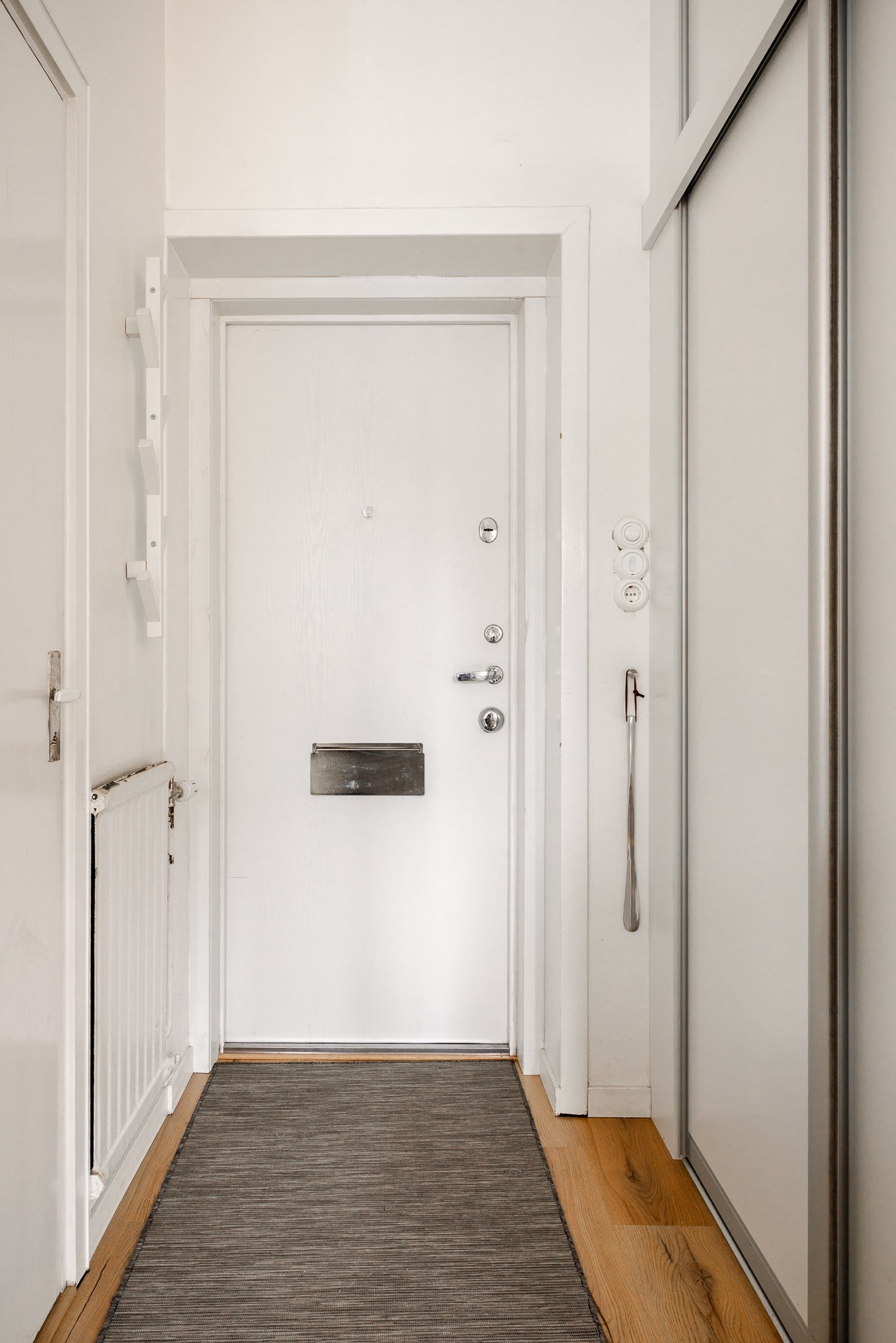 Entré in till lägenheten görs in i en rymlig hall med en stor och inbyggd garderober. Gott om plats för ytterkläder, skor och förvaring. Lägenheten är försedd med säkerhetsdörr.