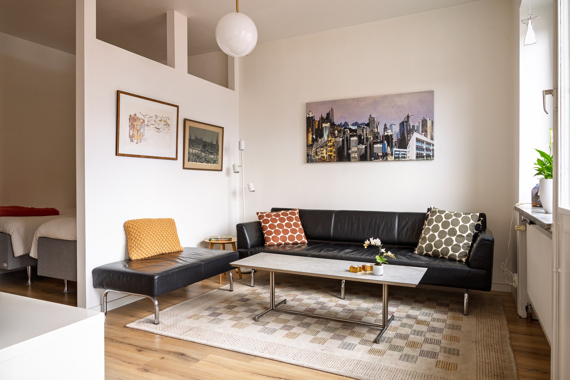 Vardagsrummet är ett rymligt och lättmöblerat sällskapsrum med vacker ekmönster laminatgolv. Ett brett fönsterparti med balkongdörr ger fint ljusinsläpp och leder ut till lägenhetens balkong, där man kan njuta av kvällsdrinken med sjöglimt och utsikt över hustaken och Stigberget. I den inre delen av rummet finns en avskild sovdel som avdelats med vägg, vilket skapar en mer privat och rofylld plats för sängen utan att ta yta från rummets sociala delar.