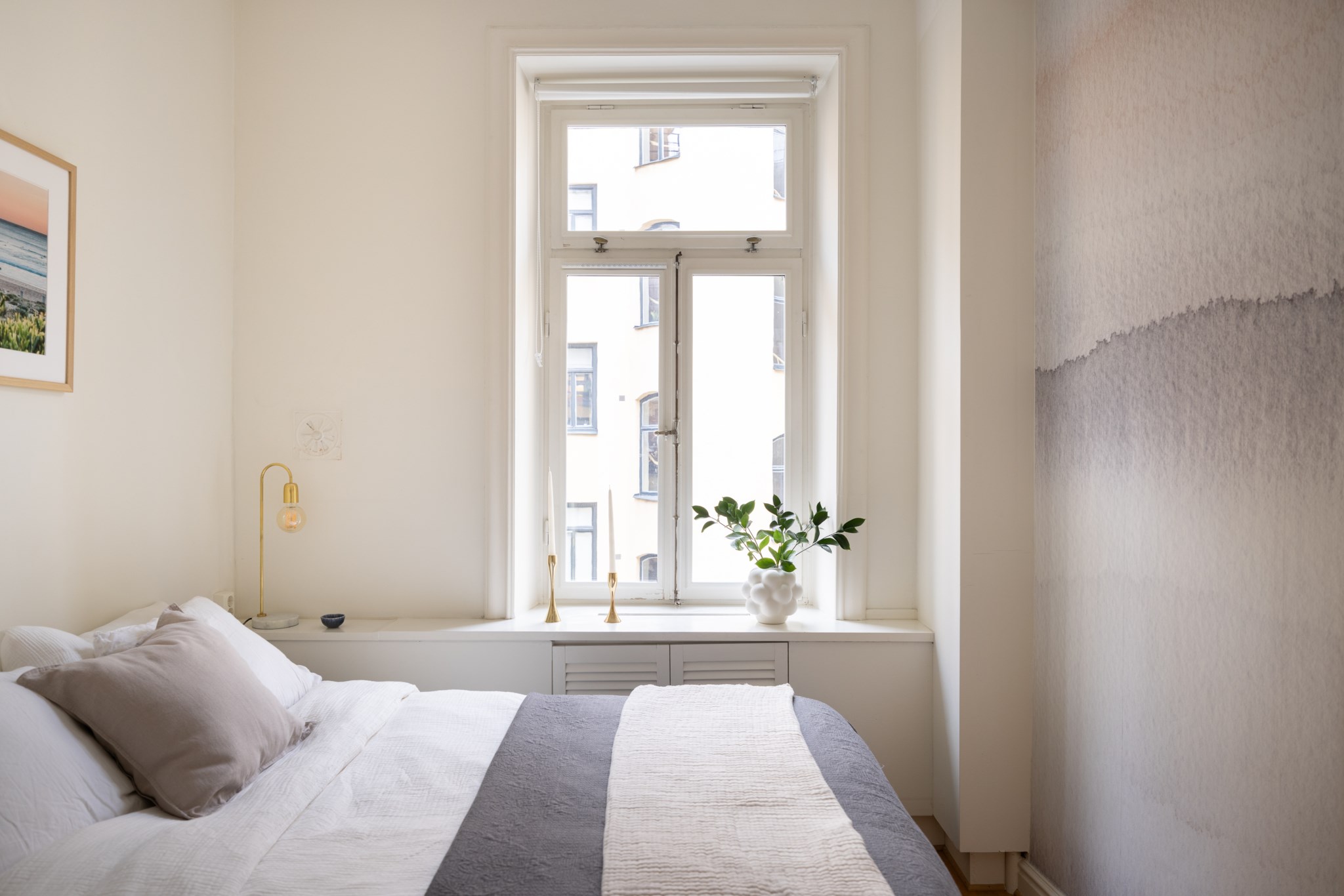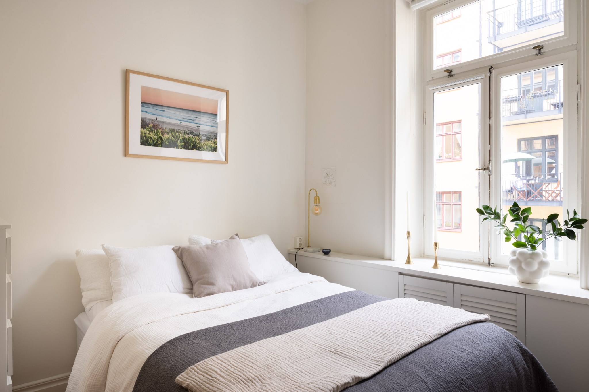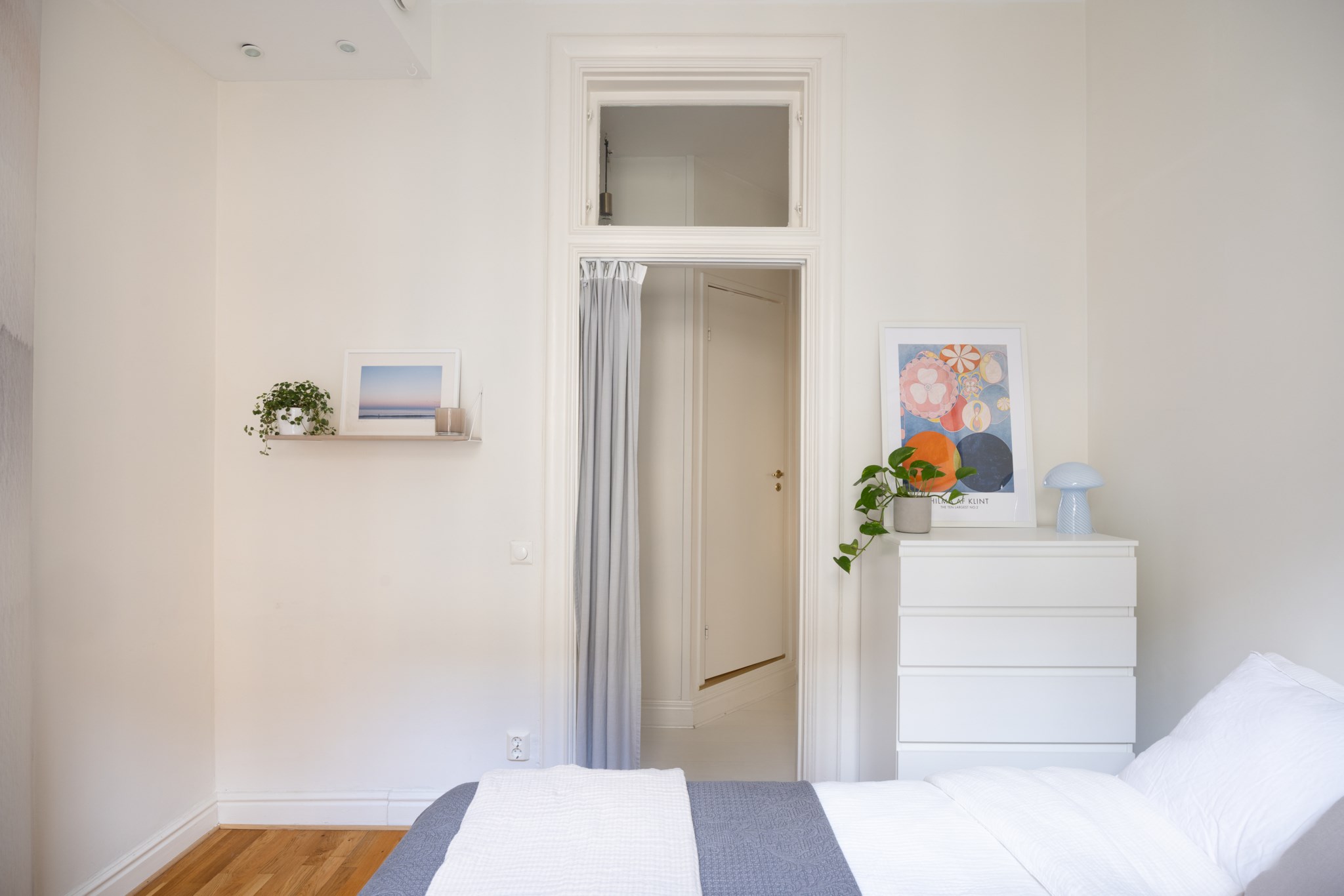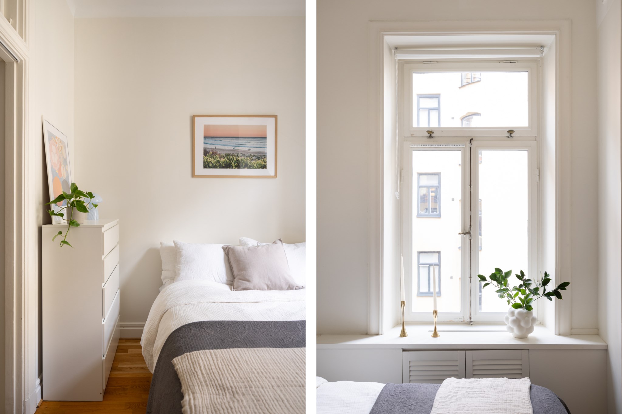 Mysigt sovrum med plats för säng, sängbord och mindre möblemang efter önskemål. Smakfulla ytskikt bestående av ljusa väggar och ljust trägolv.