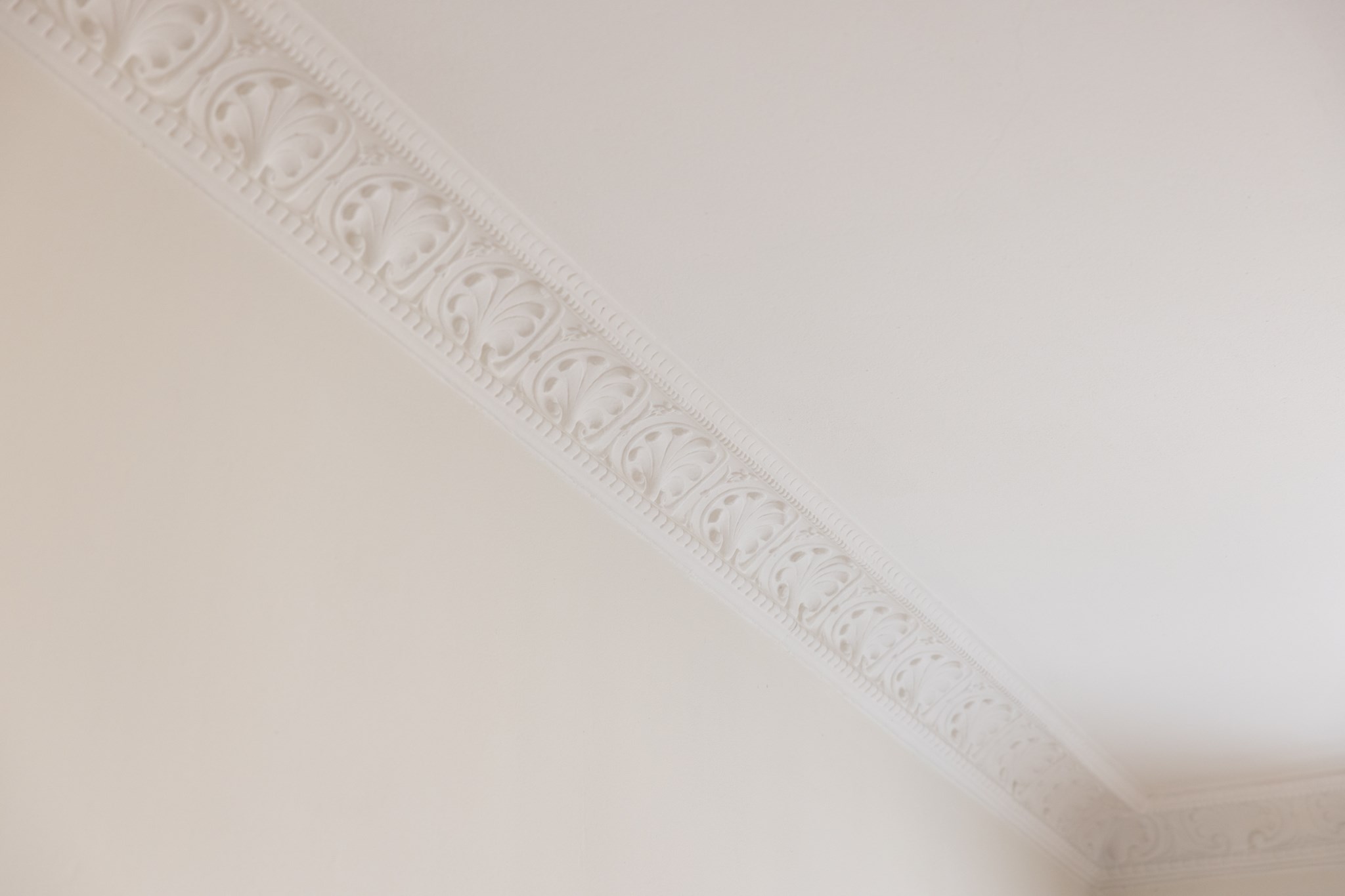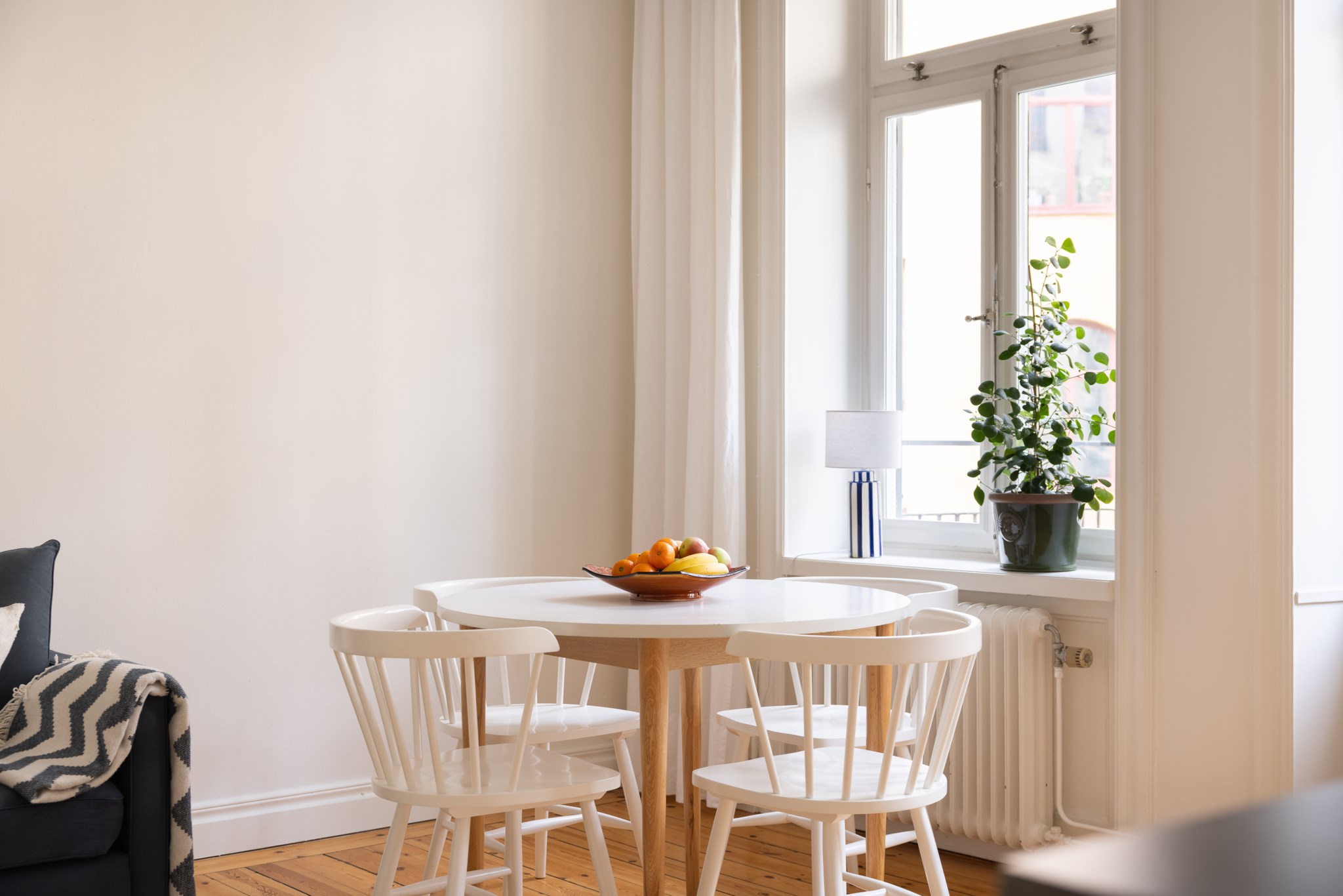 Luftigt vardagsrum med generöst ljusinsläpp via stort fönster. Här inryms soffa, soffbord, TV-möbel, matbord och annat möblemang efter smak och behov. Smakfulla ytskikt bestående av ljusa väggar och ljust trägolv. Taket pryds av vackra stuckaturer.