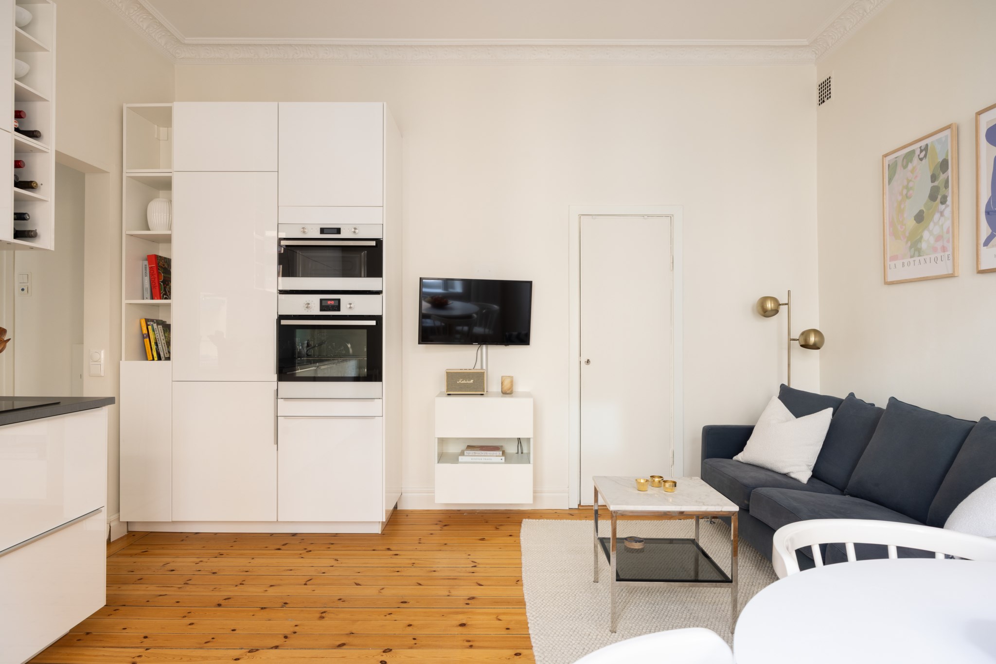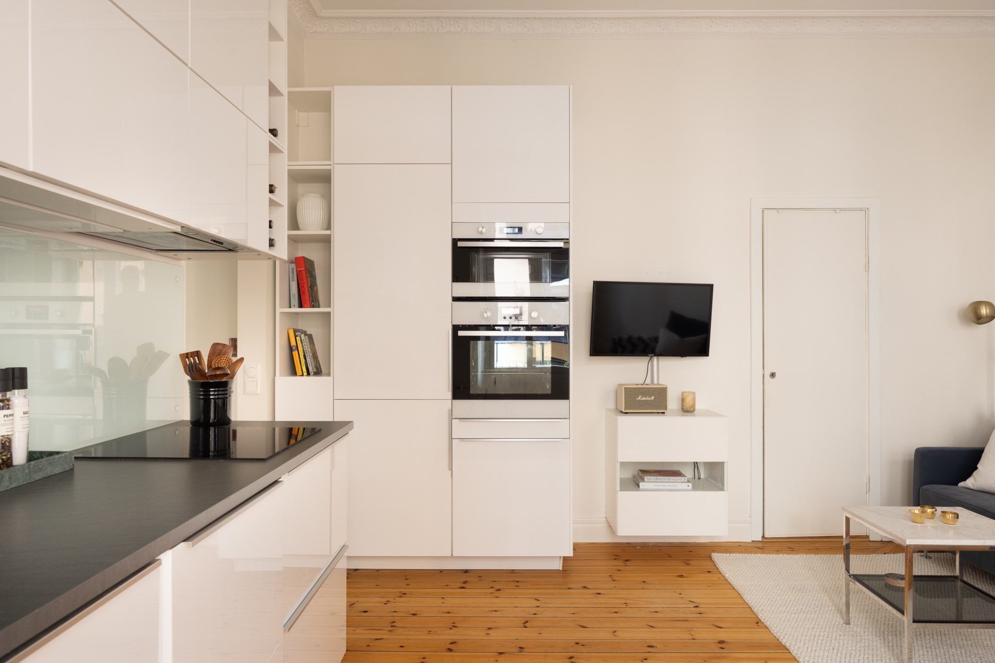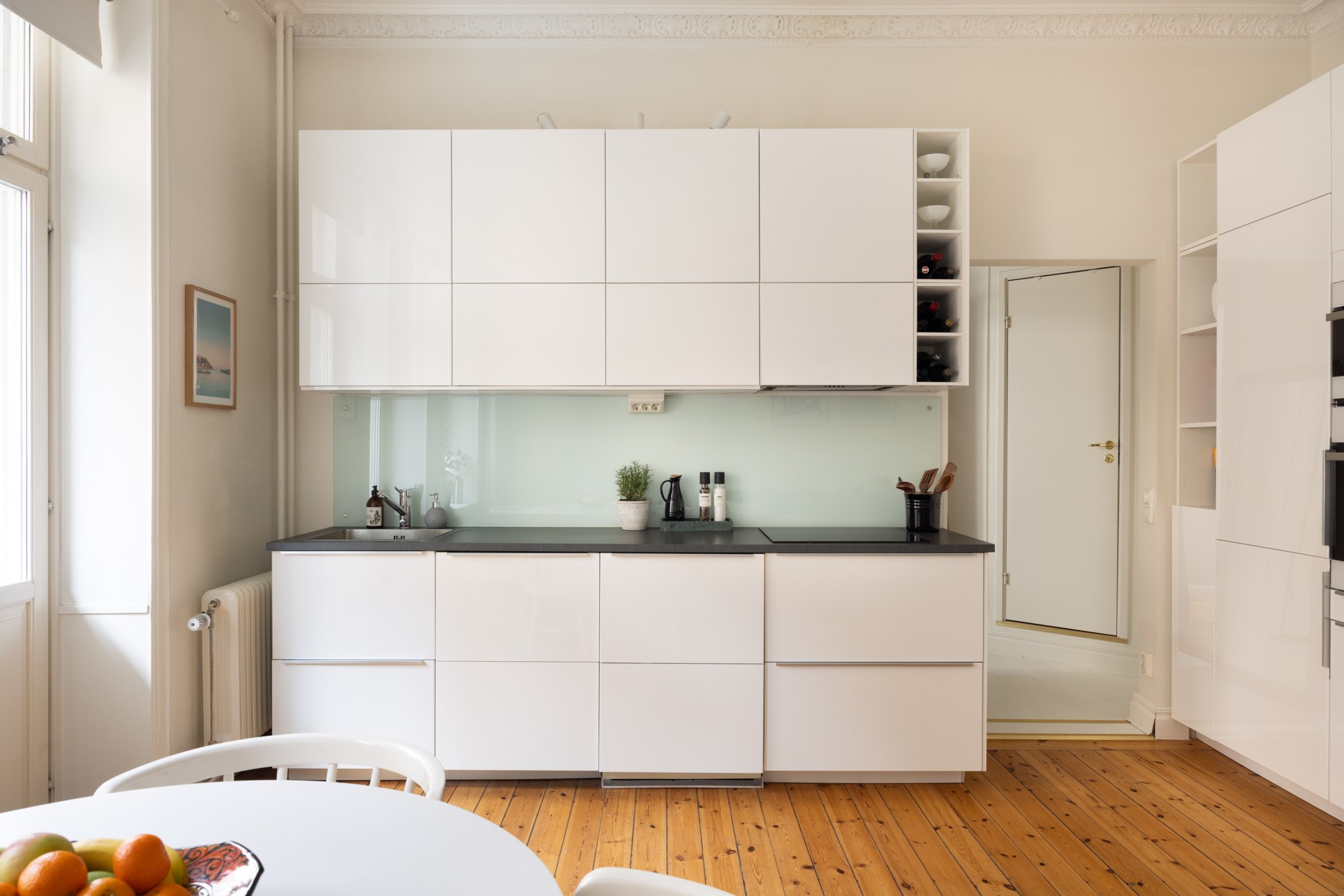 Köket är socialt placerat intill vardagsrummet. Ytskikten består av ljusa väggar och ljust trägolv. Tidlösa materialval bestående av ljusa köksluckor och mörk bänkskiva. Köket är utrusta med diskho, häll, fläkt, inbyggd ugn och micro, diskmaskin samt kyl och frys. Här finns även en integrerad kombinerad tvätt- och torkmaskin. Taket pryds av vackra stuckaturer.
