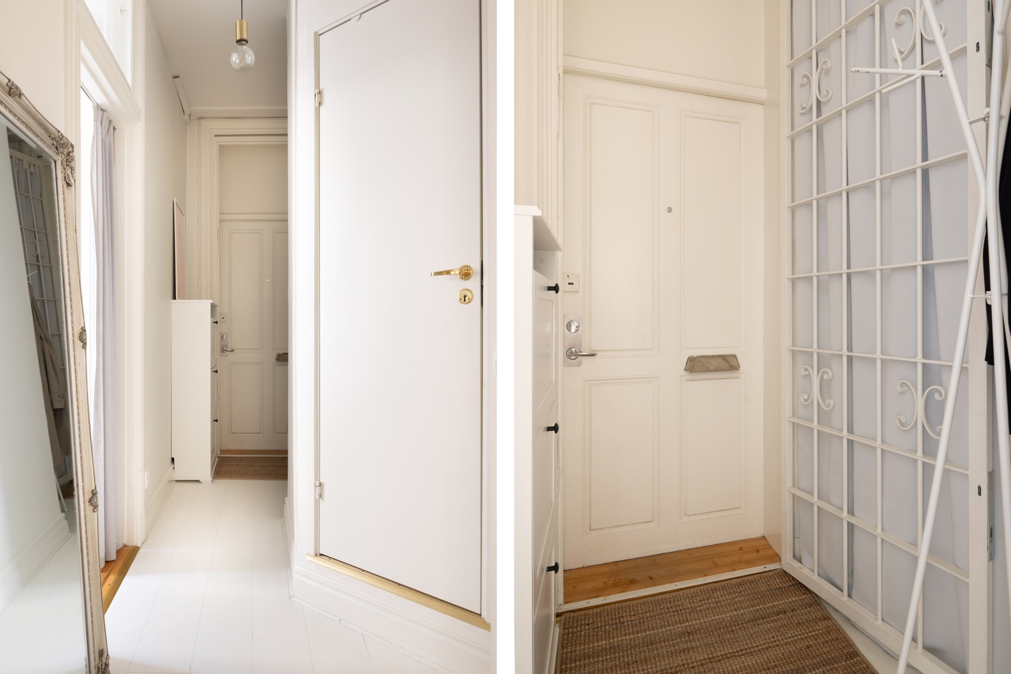 Välkomnande hall med gott om plats för avhängning och skoställ. Här möts du av tidlösa ytskikt bestående av ljusa väggar och ljust golv. Här finns ett säkerhetsgaller.