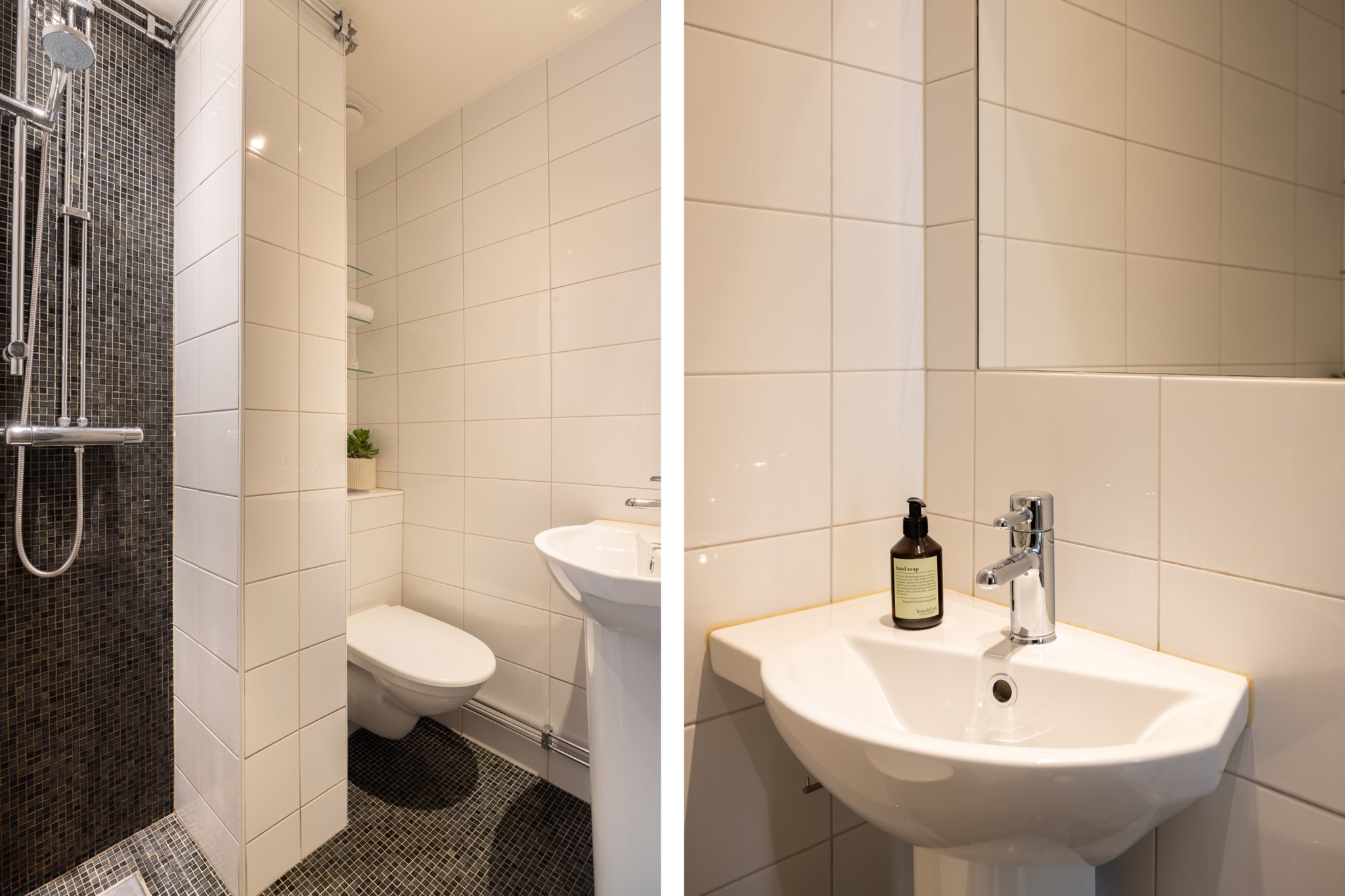 Inbjudande badrum med moderna materialval bestående av ljust kakel och mörkt klinker. Badrummet är utrustat med WC, handfat, spegel, och dusch.