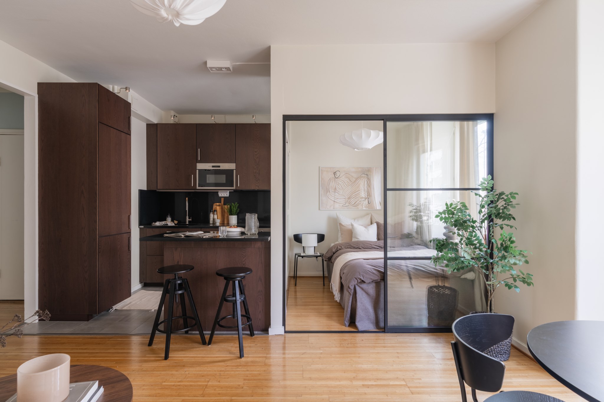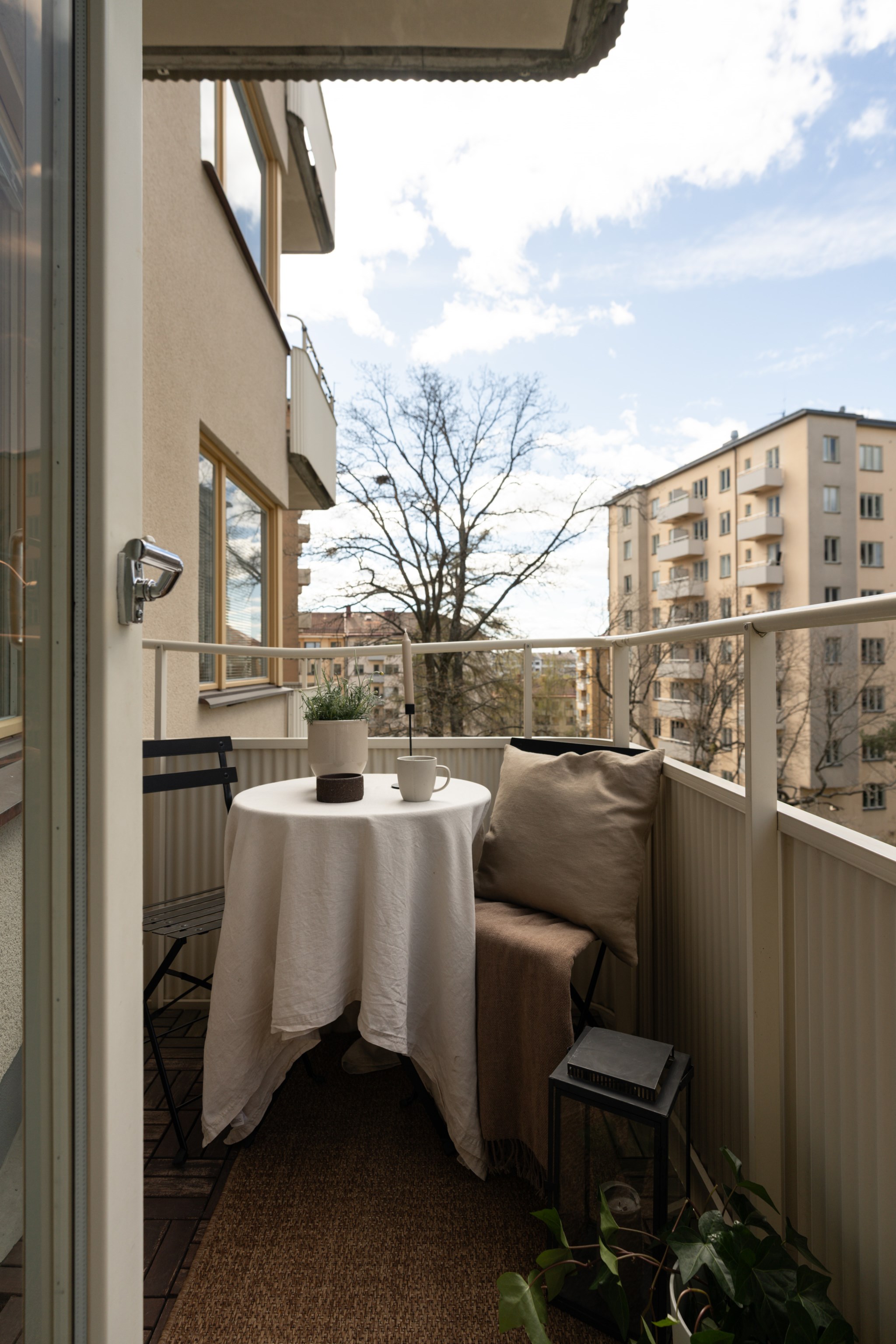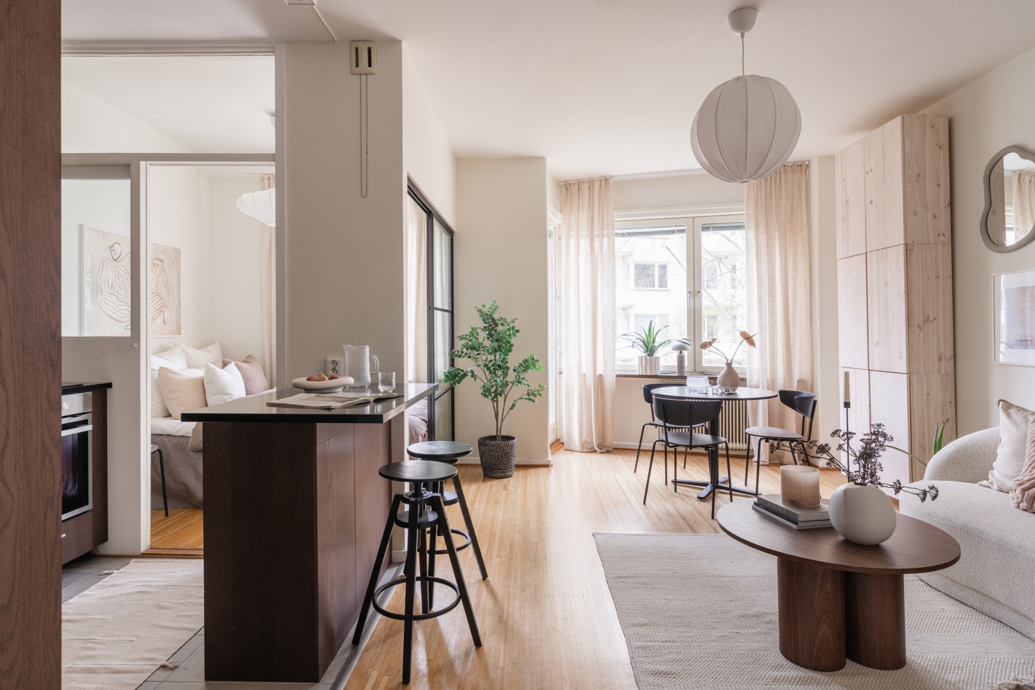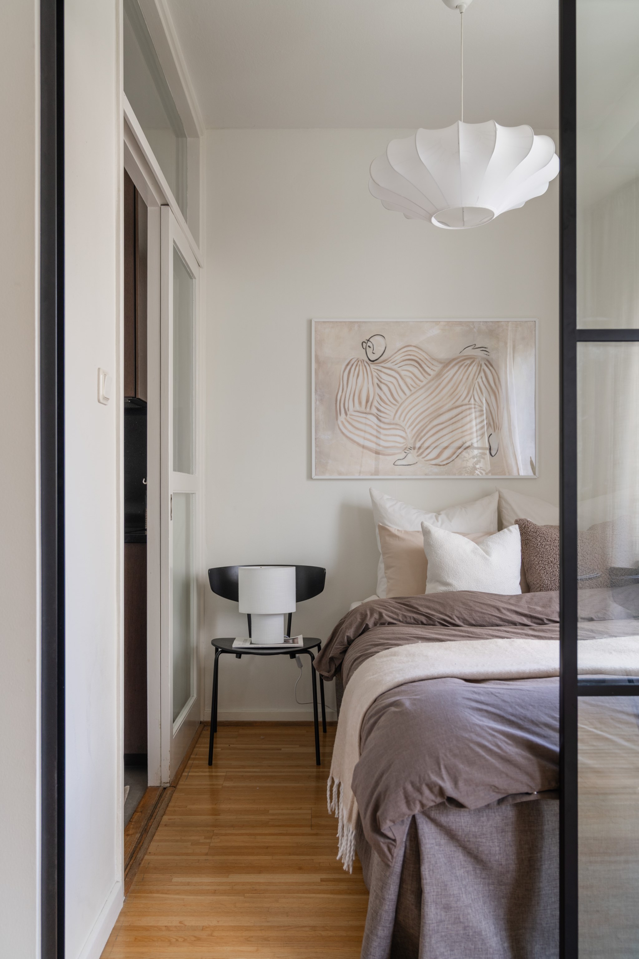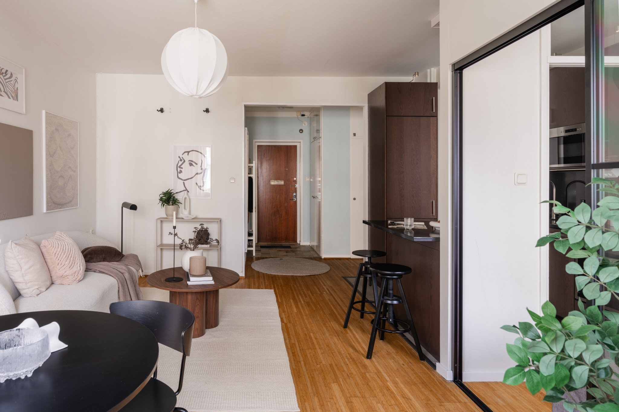 Lägenheten har en öppen och social planlösning mellan kök och vardagsrum som skapar en luftig känsla och goda möbleringsmöjligheter här har man också bevarat funkischarmen med skjutdörrspartier/snickerier fönster och balkong. De stora fönsterpartierna släpper in rikligt med ljus och förstärker den redan generösa rymden. Från vardagsrummet når du balkongen – en perfekt plats för morgonkaffet eller avkoppling.