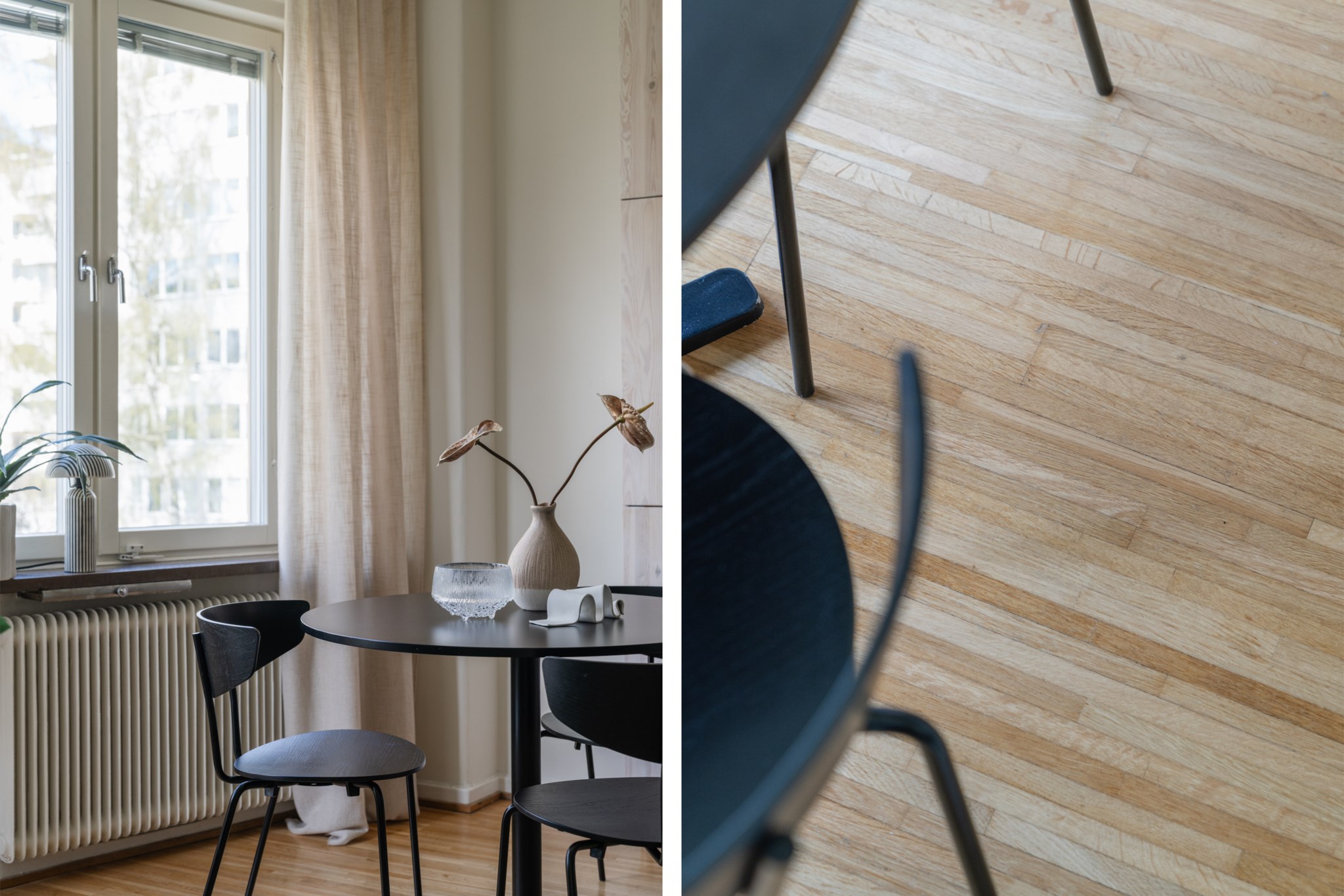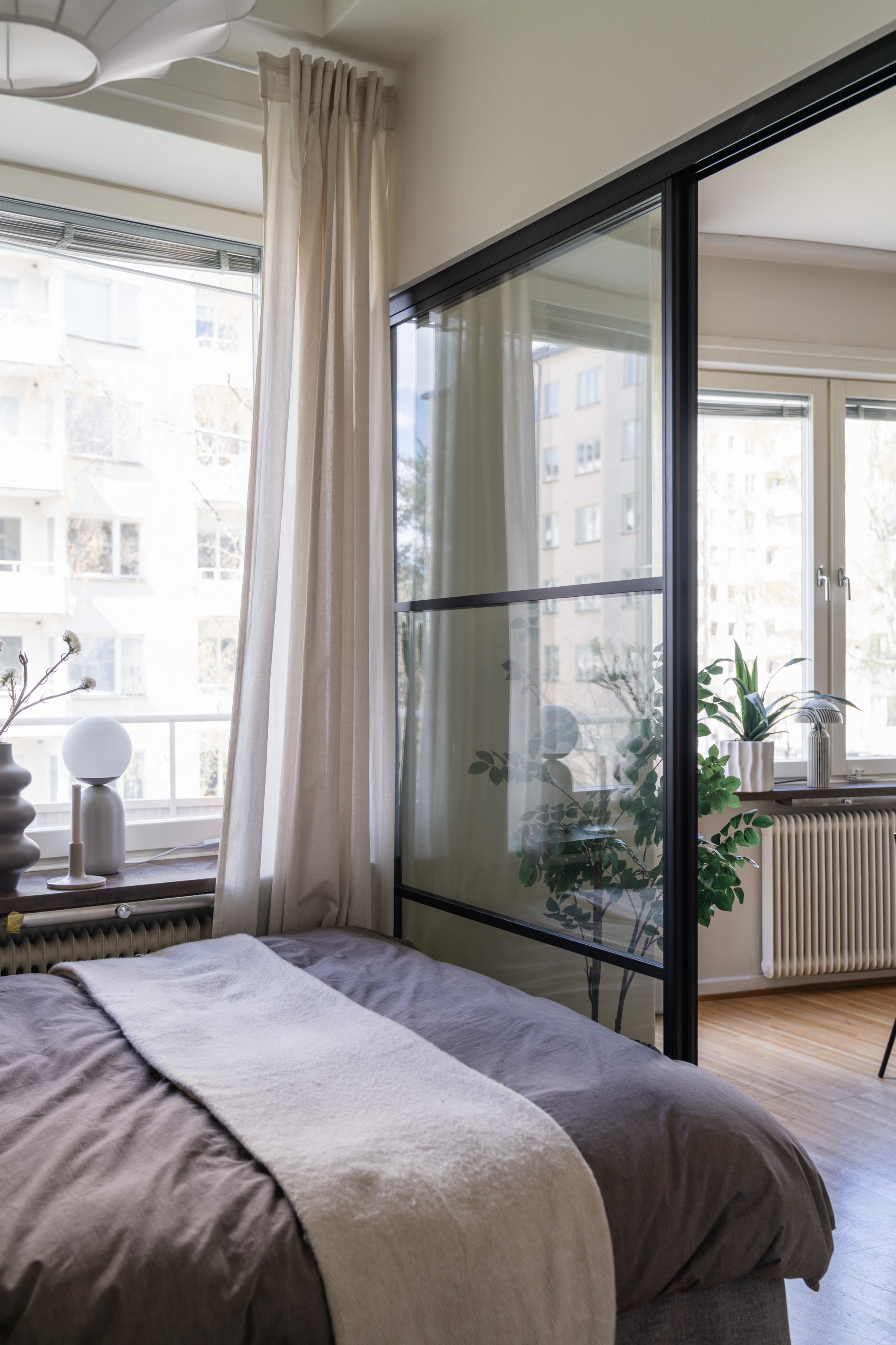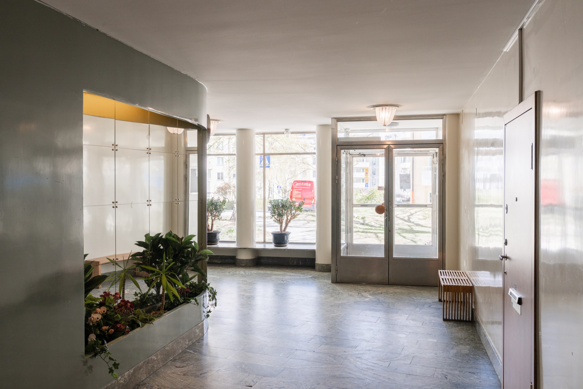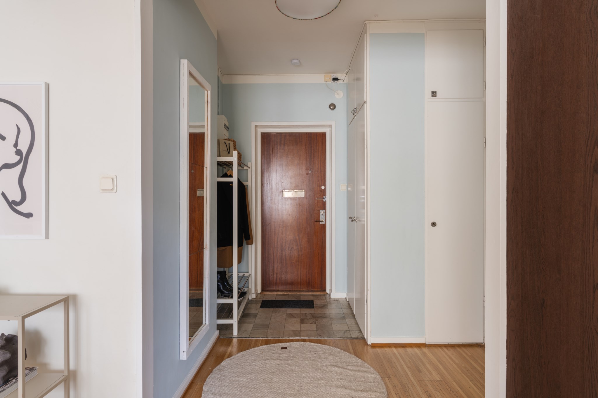 Lägenheten har en öppen och social planlösning mellan kök och vardagsrum som skapar en luftig känsla och goda möbleringsmöjligheter här har man också bevarat funkischarmen med skjutdörrspartier/snickerier fönster och balkong. De stora fönsterpartierna släpper in rikligt med ljus och förstärker den redan generösa rymden. Från vardagsrummet når du balkongen – en perfekt plats för morgonkaffet eller avkoppling.