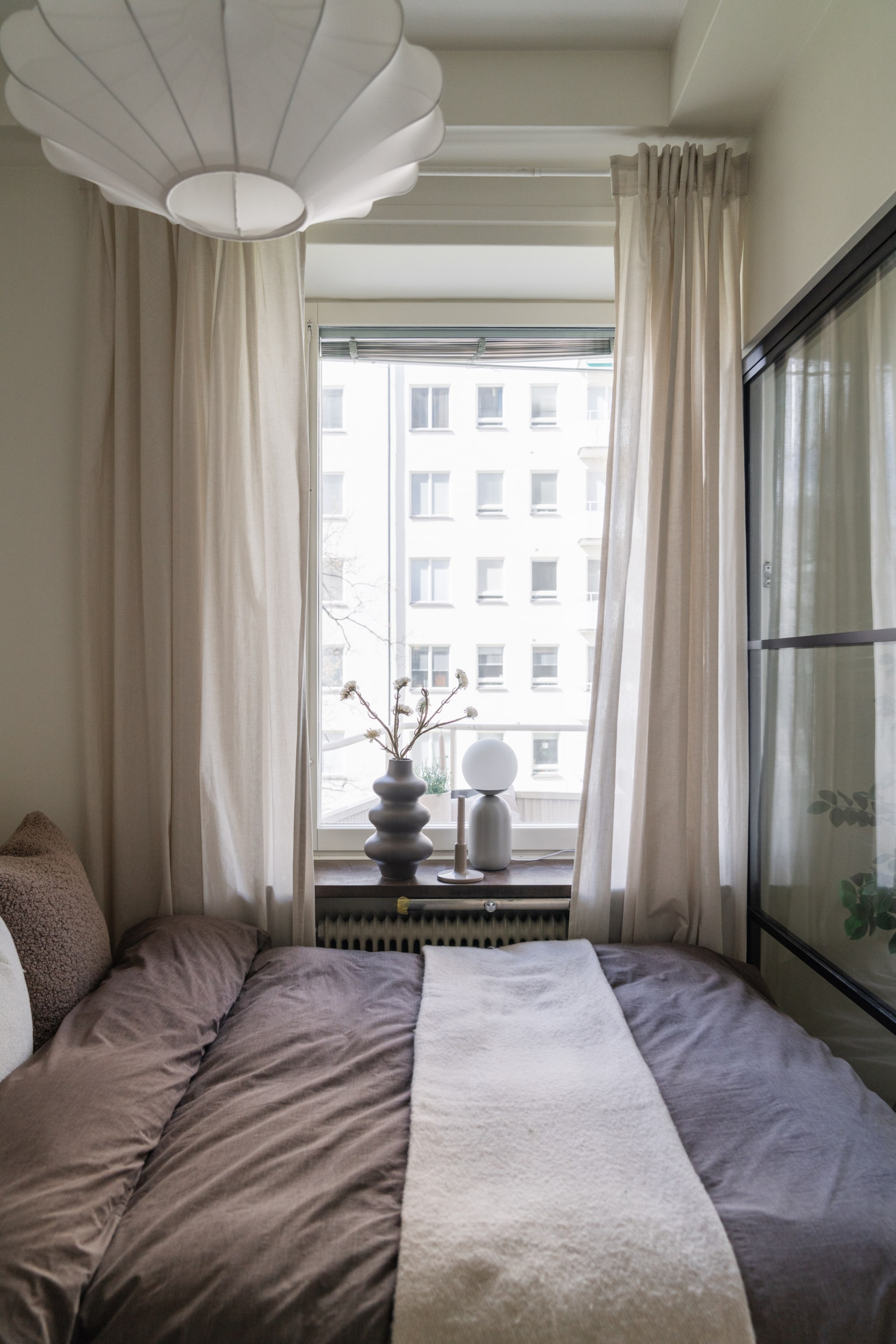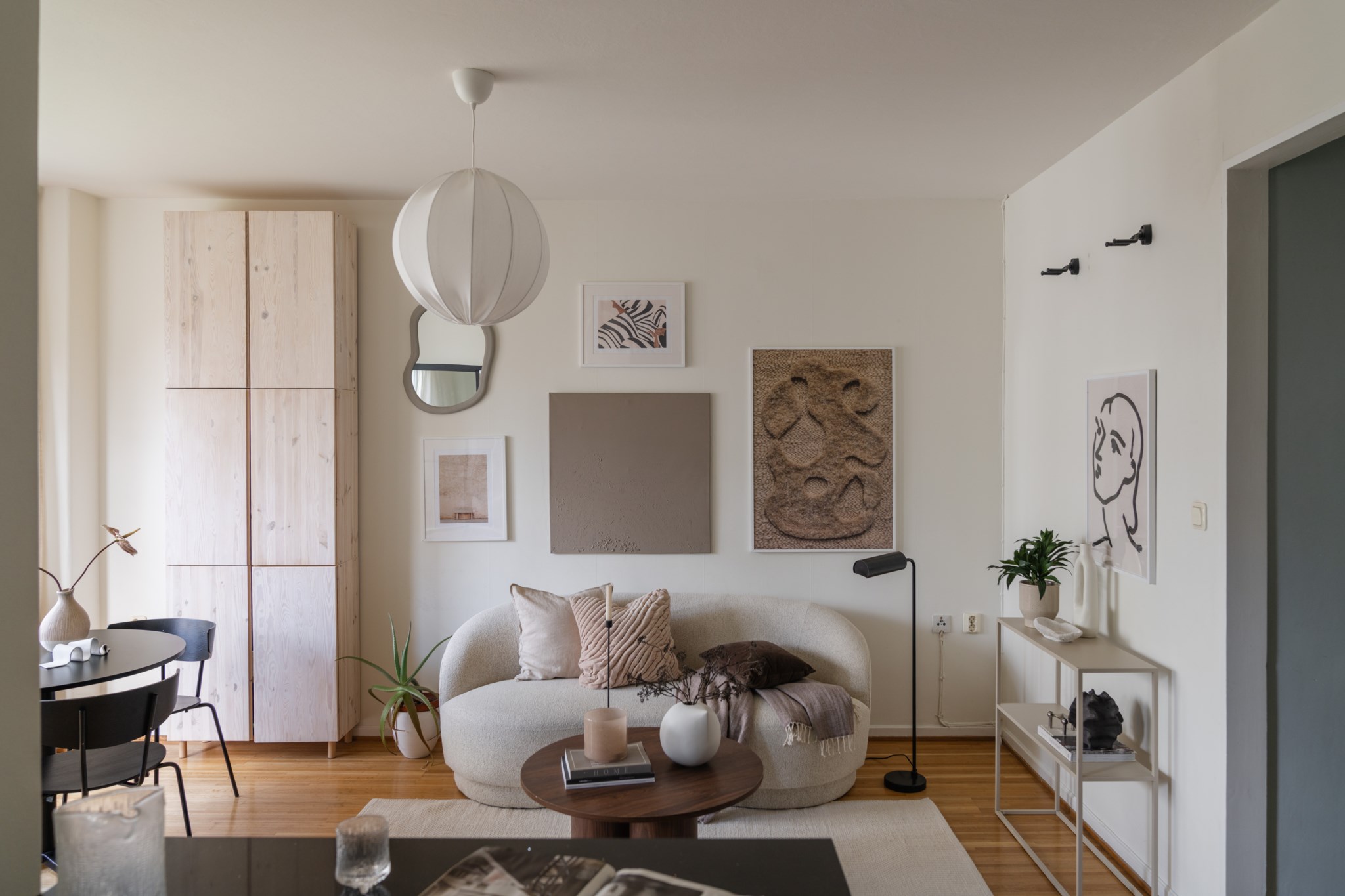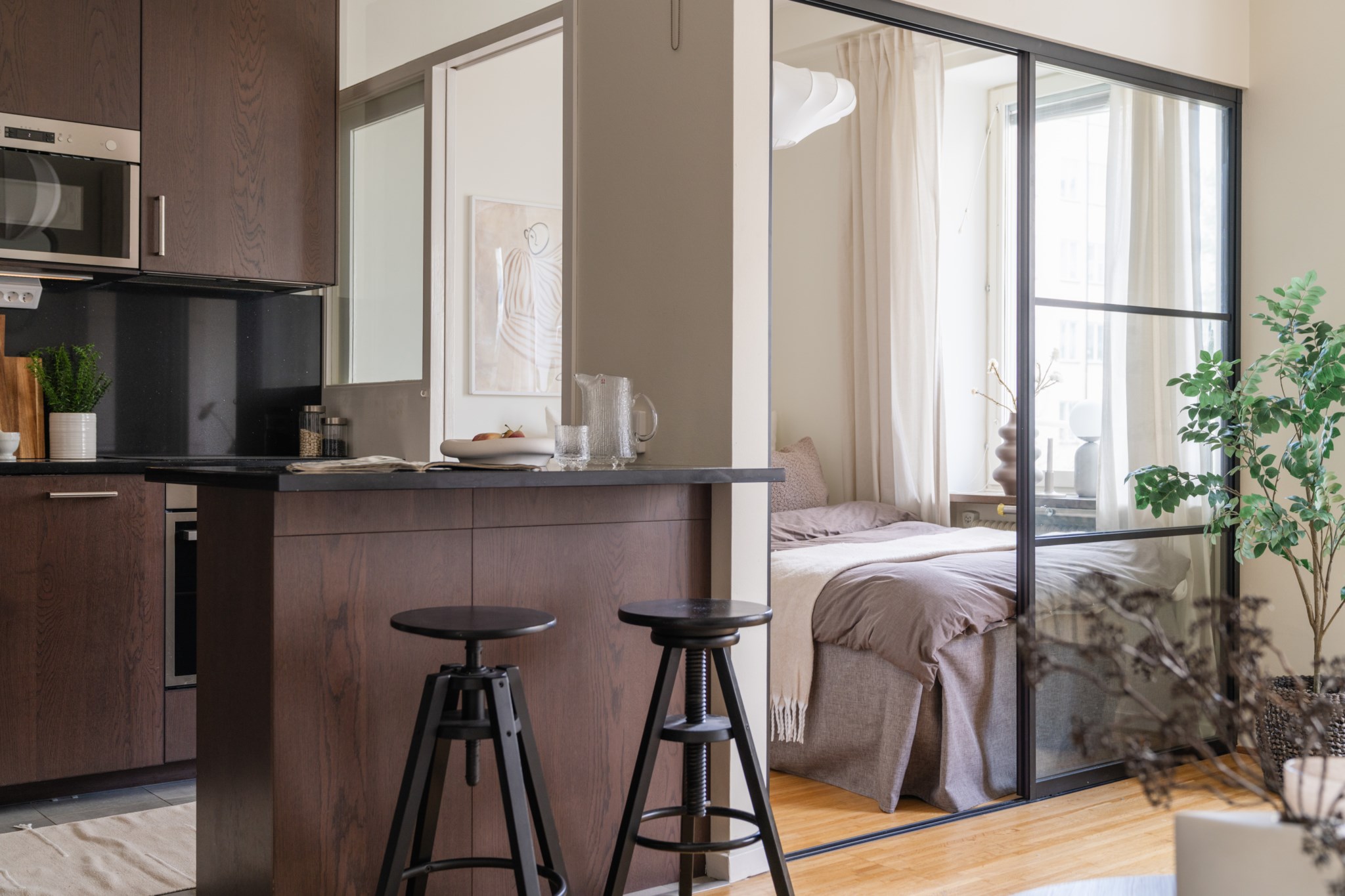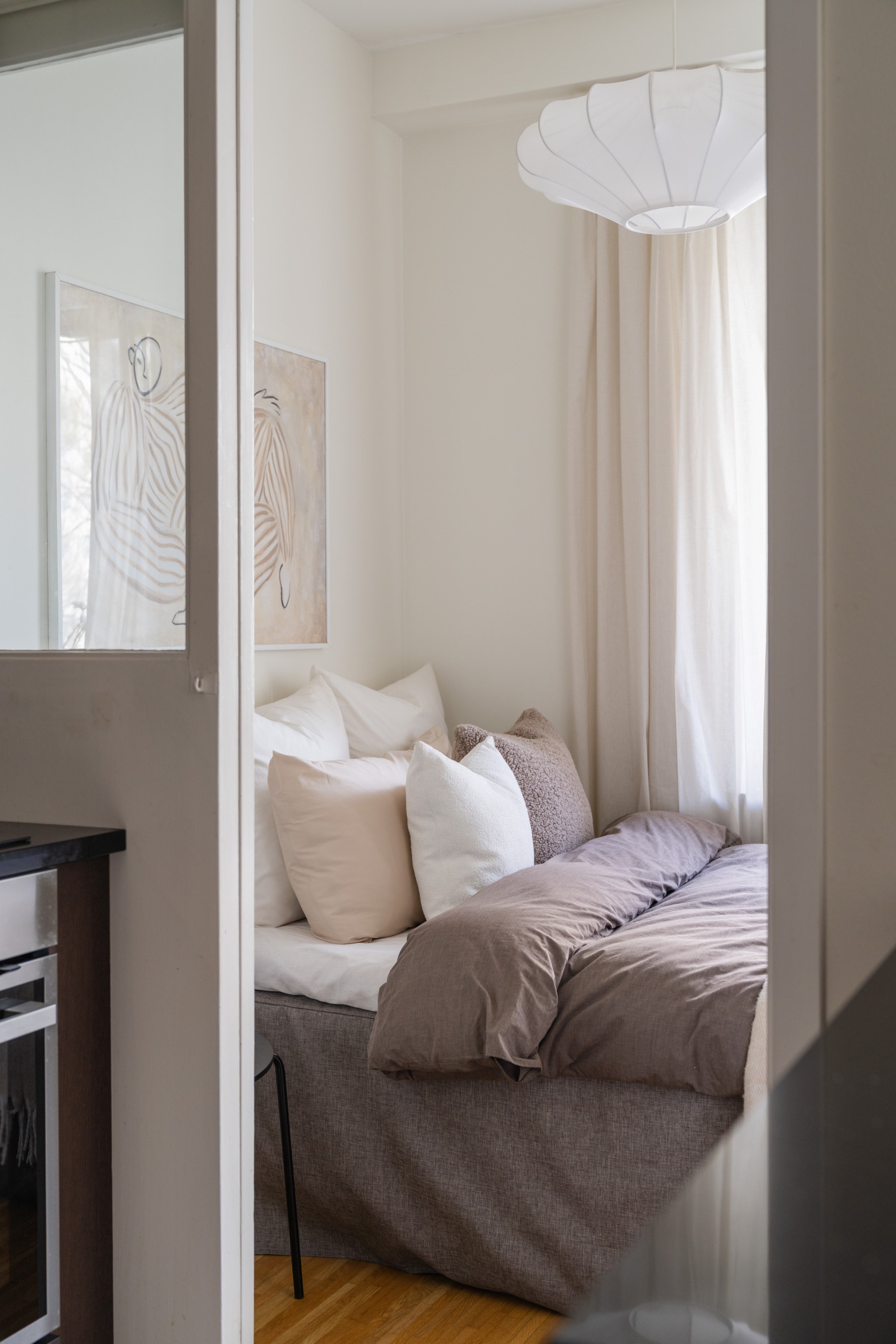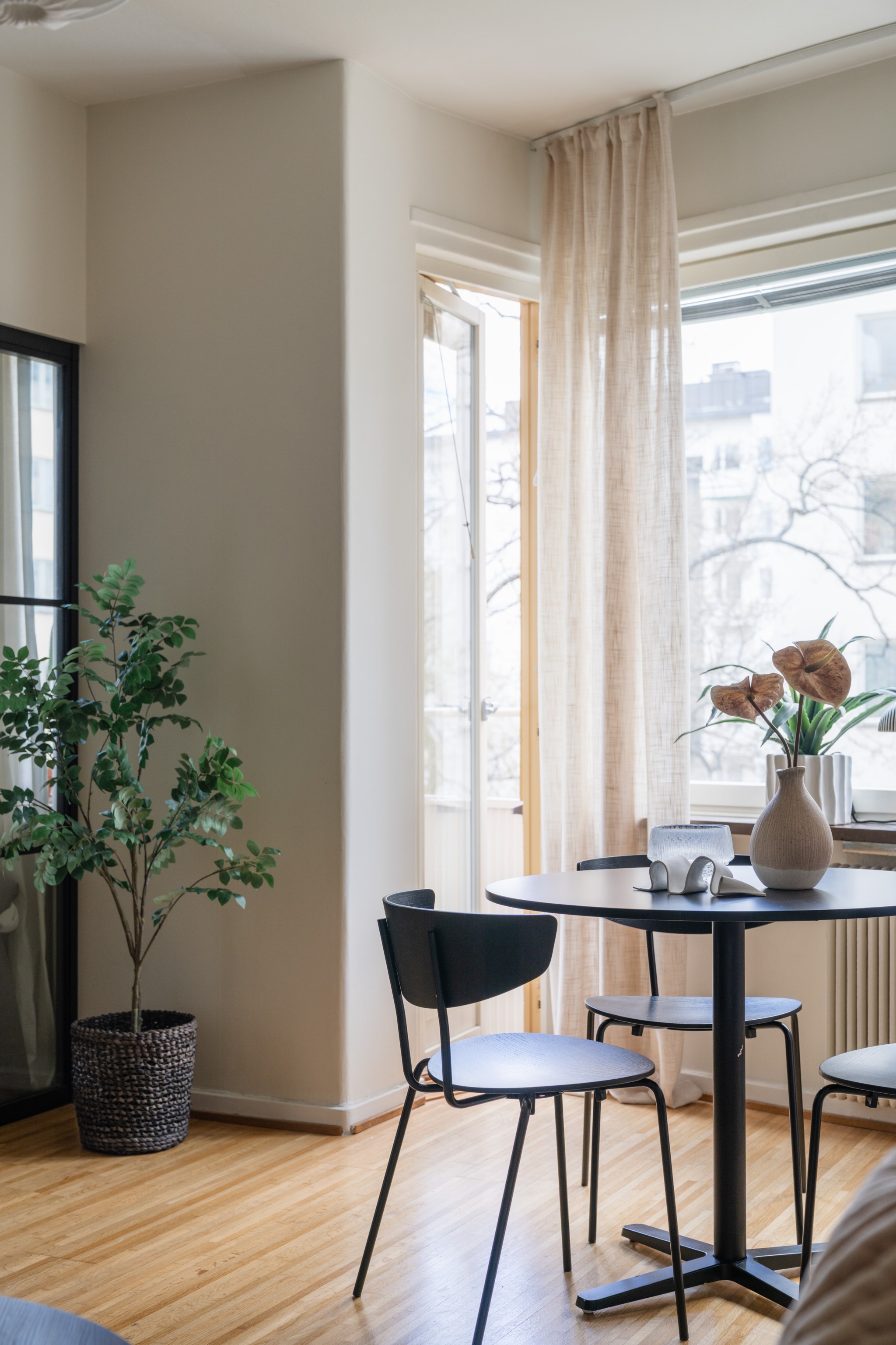 Lägenheten har en öppen och social planlösning mellan kök och vardagsrum som skapar en luftig känsla och goda möbleringsmöjligheter här har man också bevarat funkischarmen med skjutdörrspartier/snickerier fönster och balkong. De stora fönsterpartierna släpper in rikligt med ljus och förstärker den redan generösa rymden. Från vardagsrummet når du balkongen – en perfekt plats för morgonkaffet eller avkoppling.