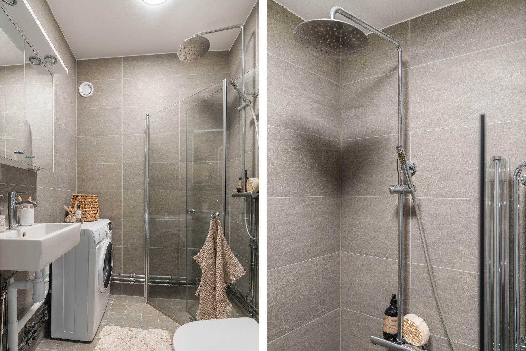Badrummet är totalrenoverat i smakfull stil och erbjuder moderna materialval samt en fräsch och tidlös känsla.