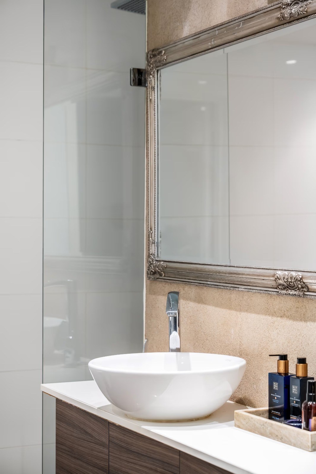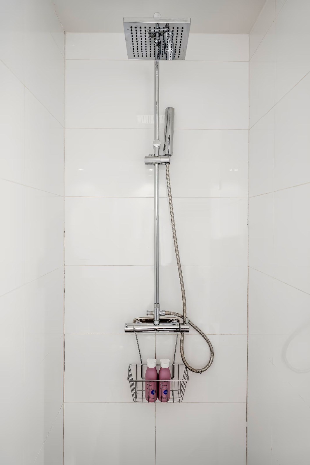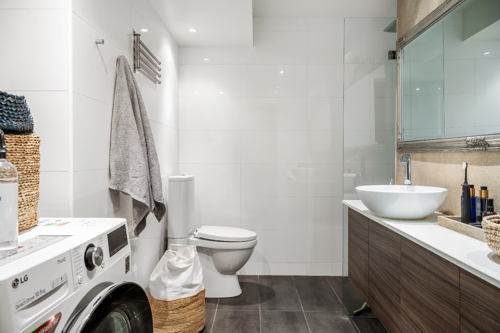 Stilrent och rymligt badrum med dusch, wc och kommod med god förvaring. Utrustat med tvättmaskin och praktiska arbetsytor. Helkaklade ytor i ljusa toner ger en fräsch och modern känsla. -