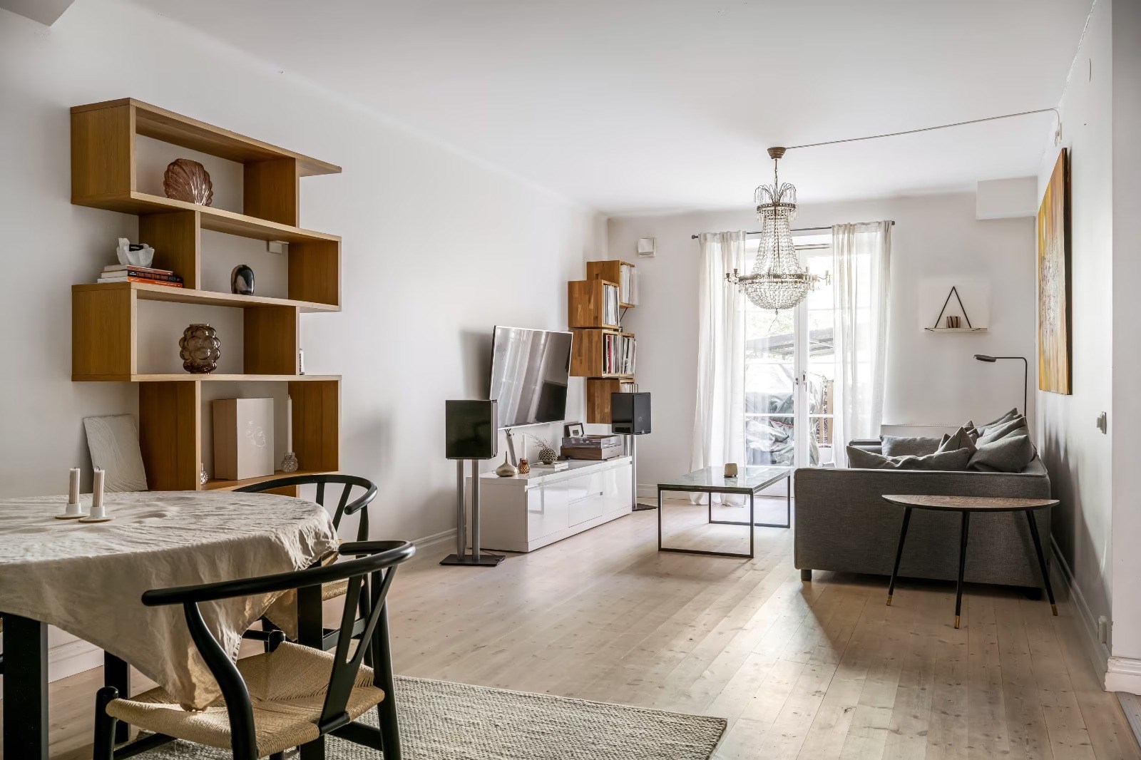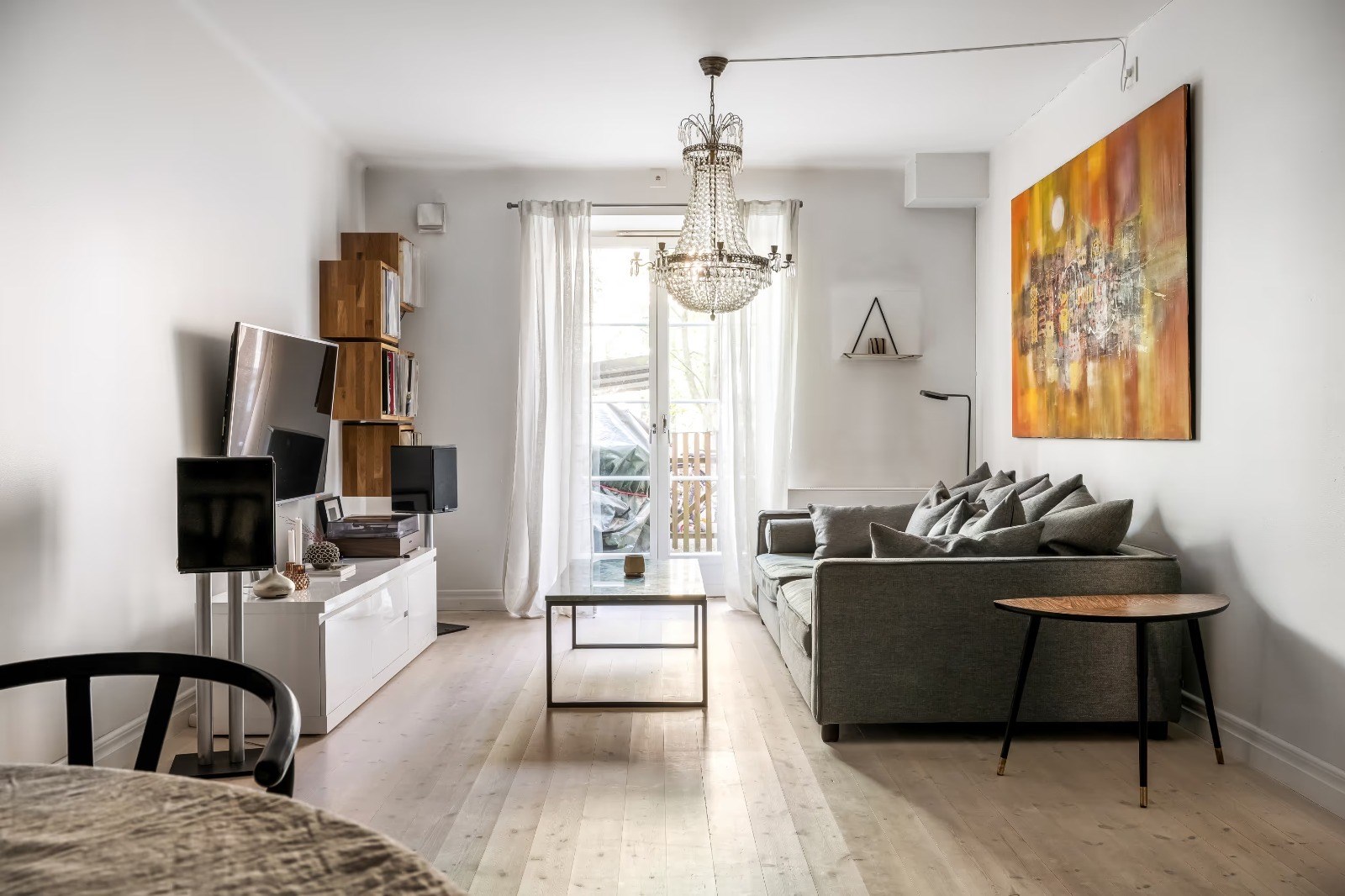 Ljust och rymligt vardagsrum med fint ljusinsläpp och plats för både soffgrupp och övrig möblering. Social yta med generösa ytor för umgänge.
