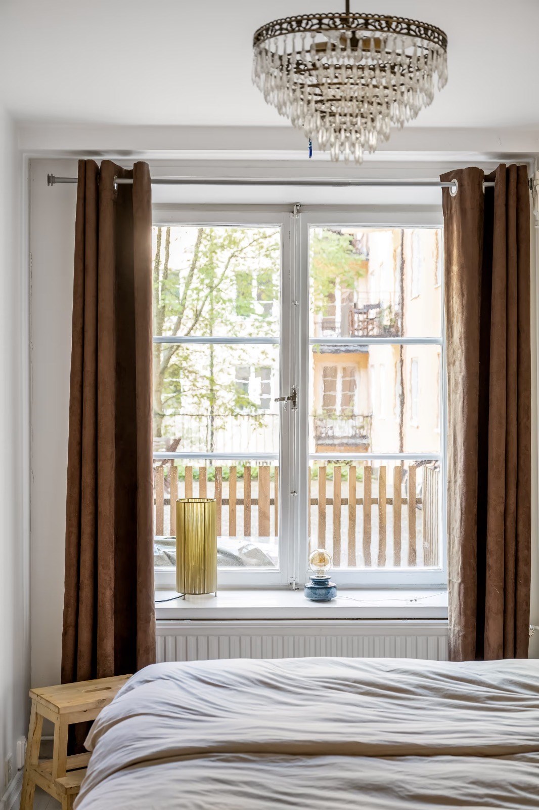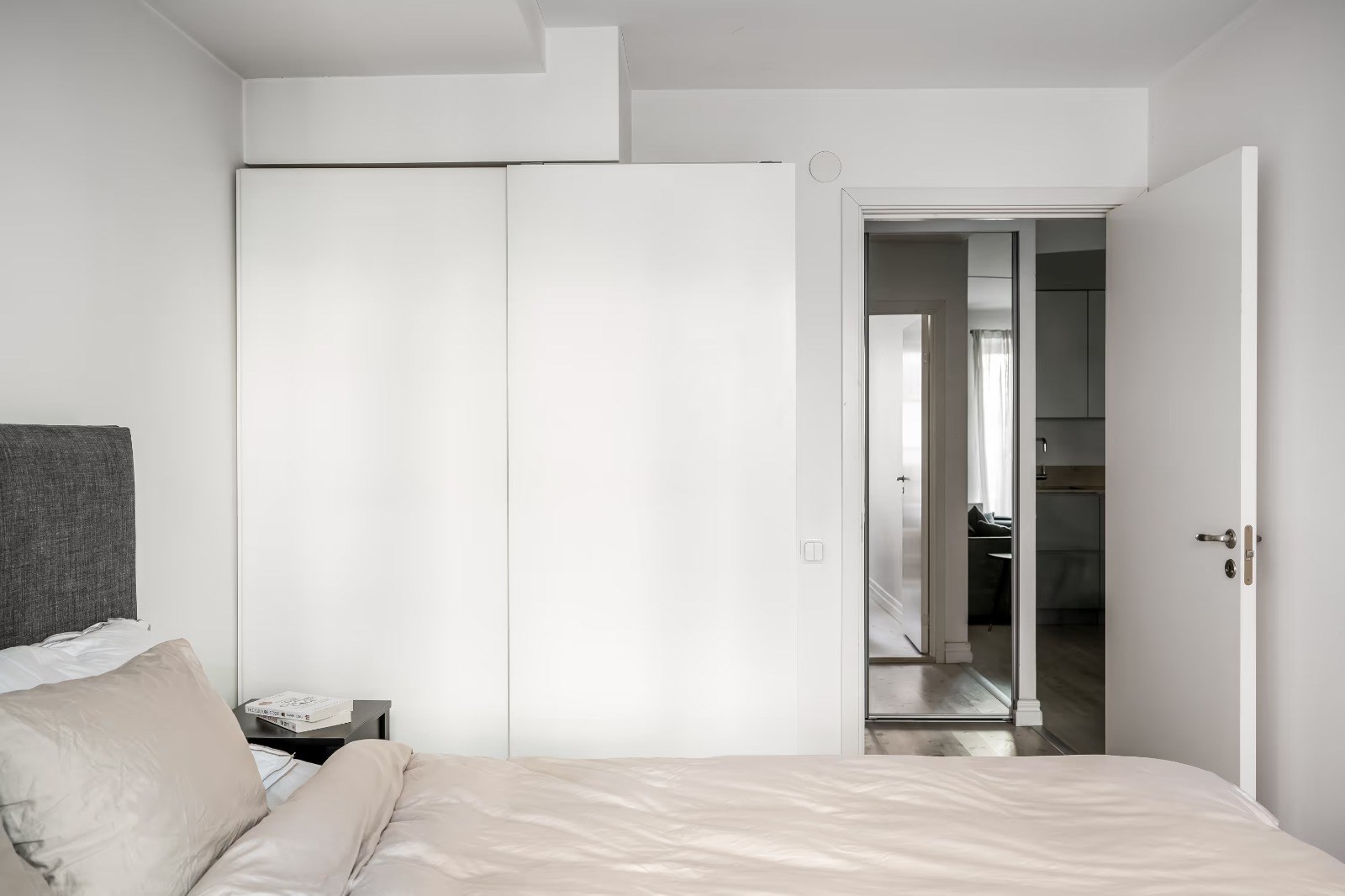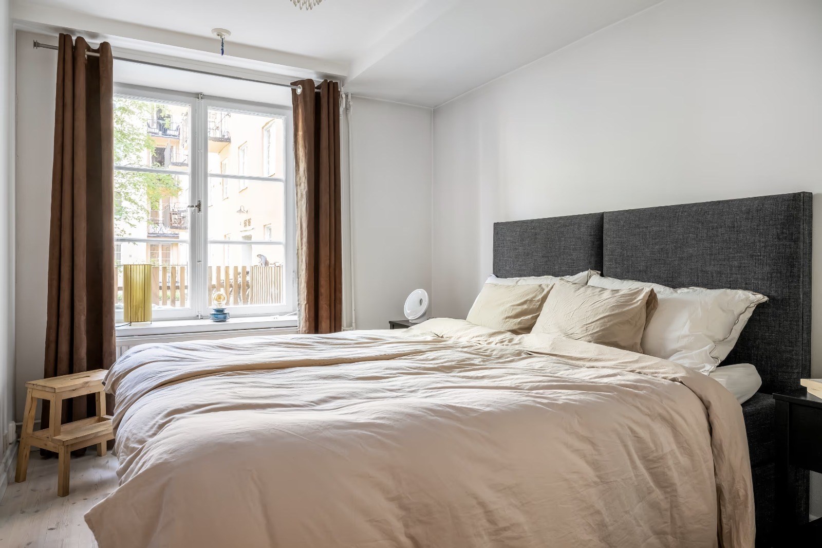 Ljust och harmoniskt sovrum med fönster mot lugn innergård. Plats för dubbelsäng och god förvaring i garderober. Stilrena ytskikt i ljusa toner skapar en rogivande känsla.