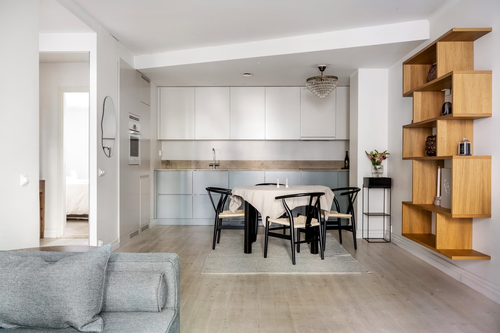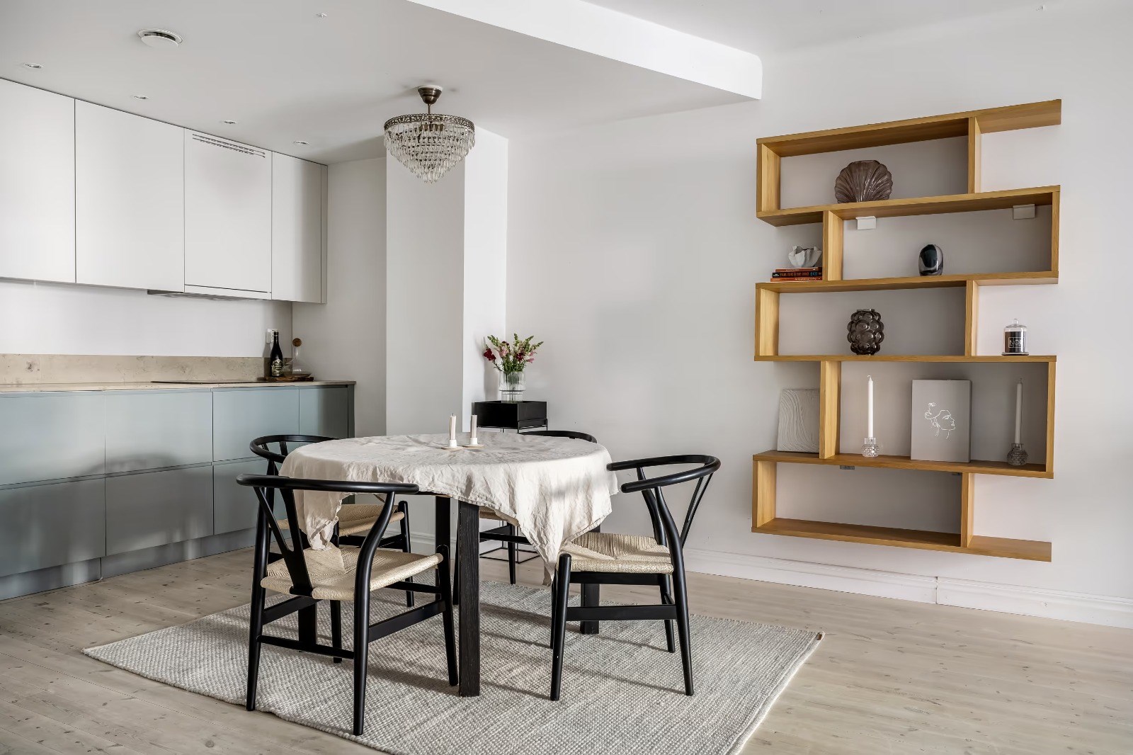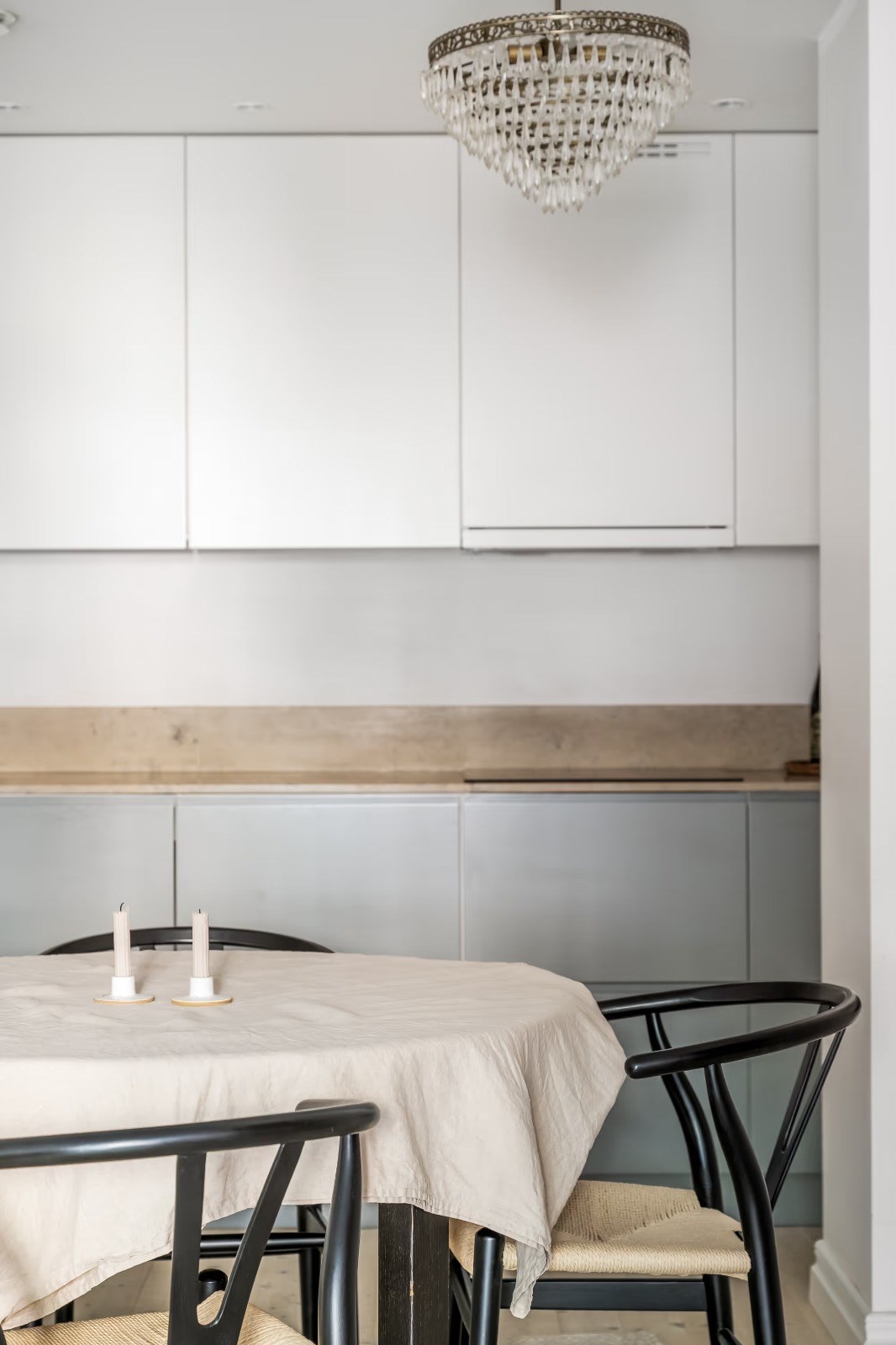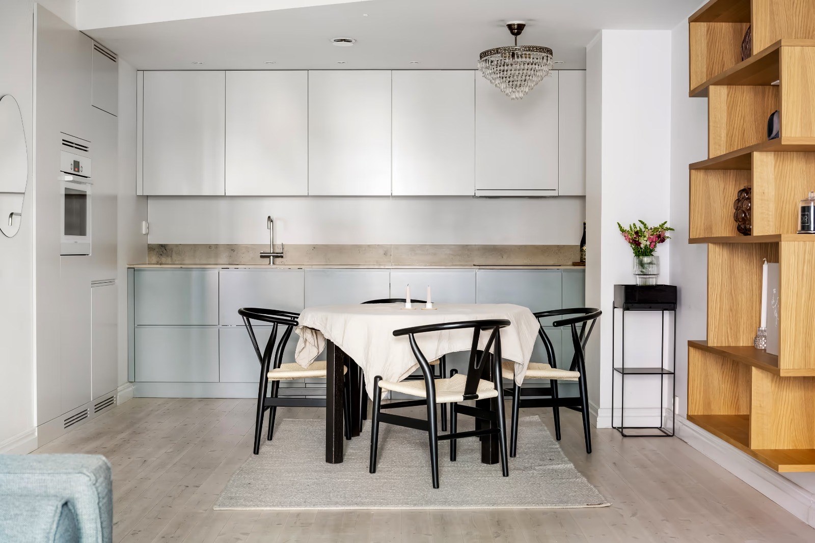 Stilrent och välplanerat kök med goda arbetsytor och förvaring. Plats för matbord och öppen känsla mot vardagsrummet som bjuder in till sociala tillställningar.