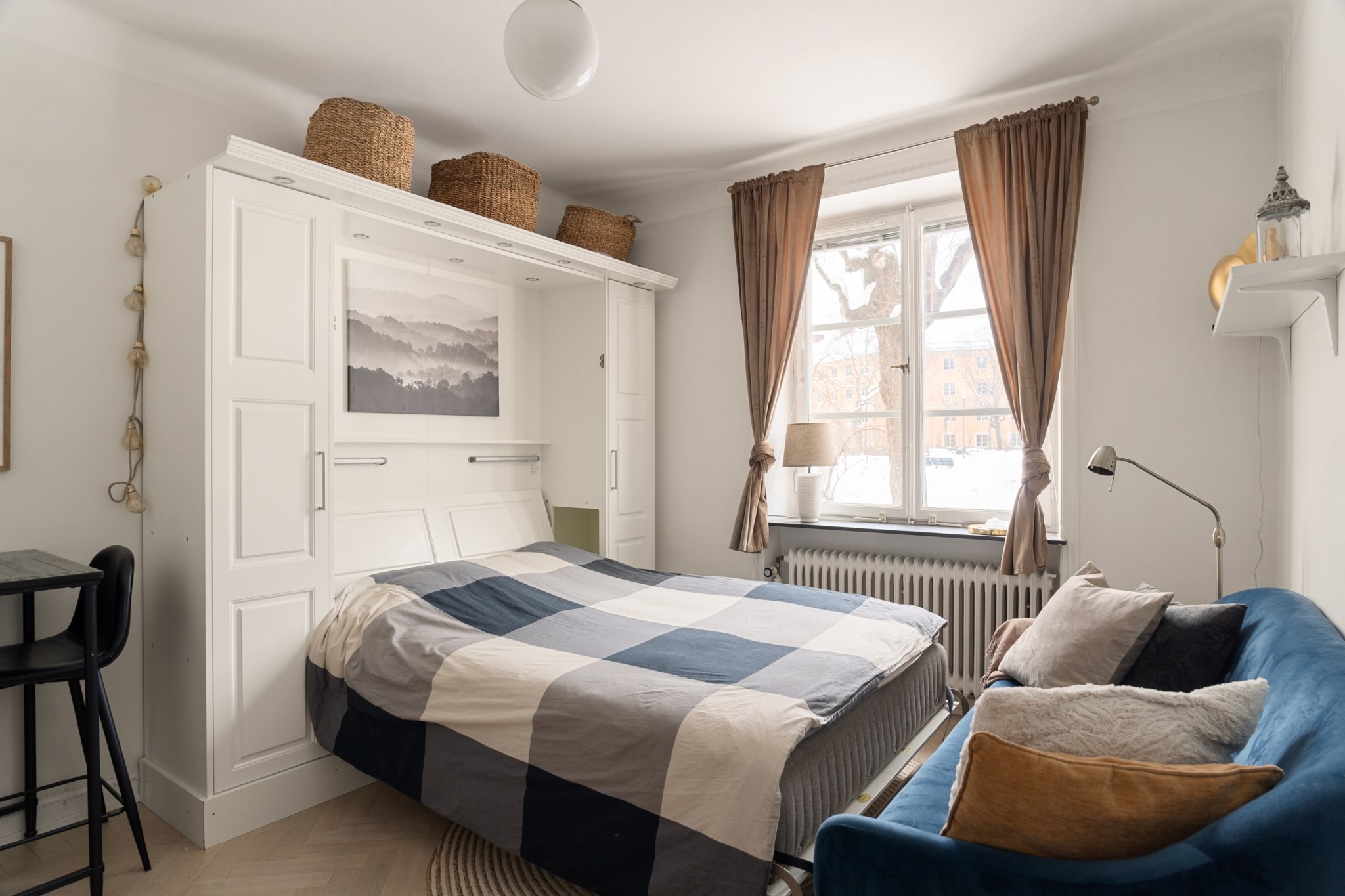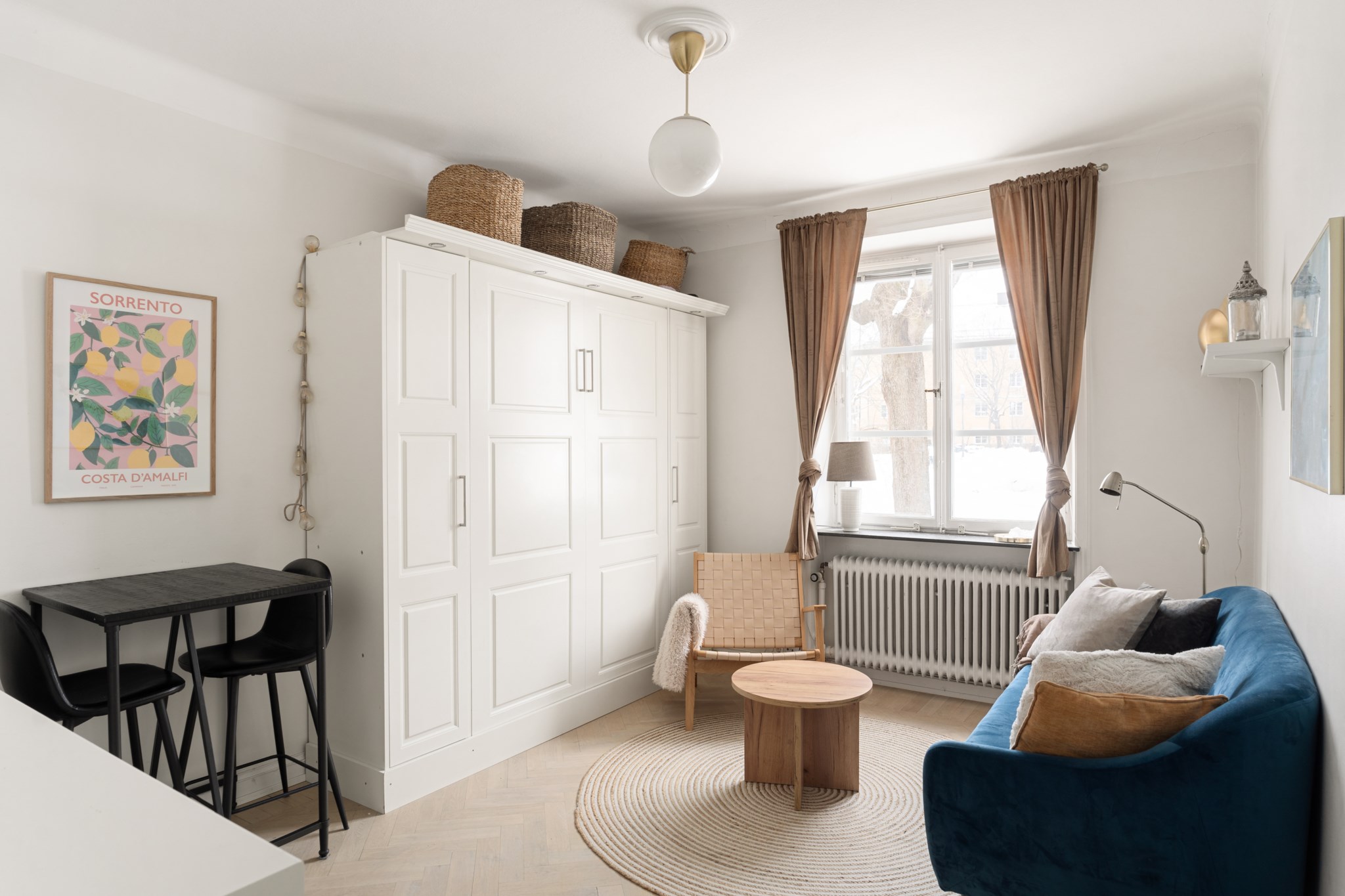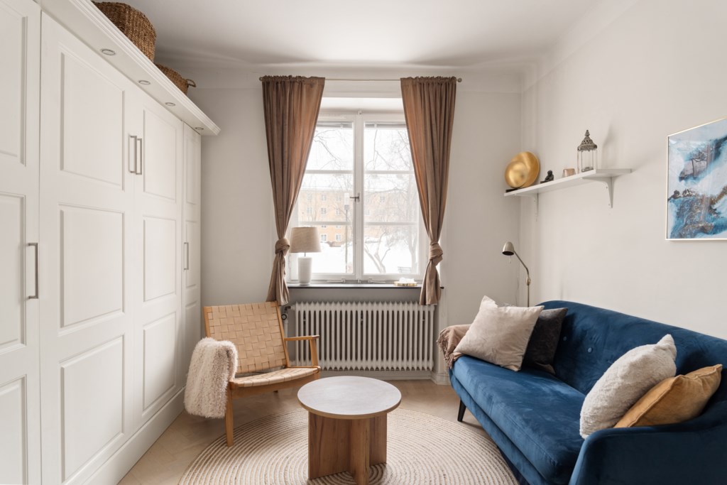 Trivsamt allrum med vacker, ljus fiskbensparkett och vita väggar. Den smarta och kompakta planlösningen nyttjar ytan optimalt och erbjuder plats för soffa, loungemöbel, soffbord samt garderob med inbyggd nedfällbar säng. Ett charmigt fönster med spröjs släpper in generöst med dagsljus och bidrar till en luftig känsla.