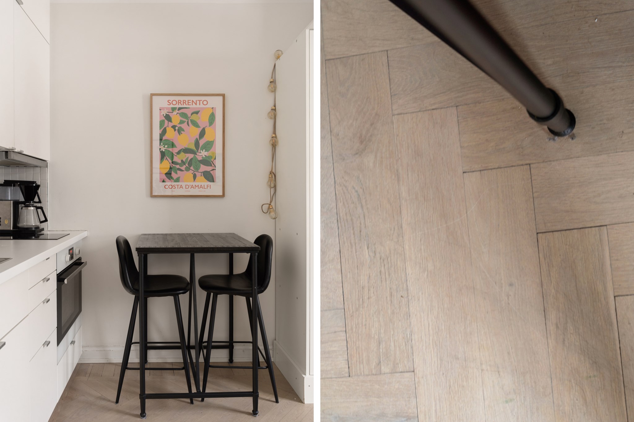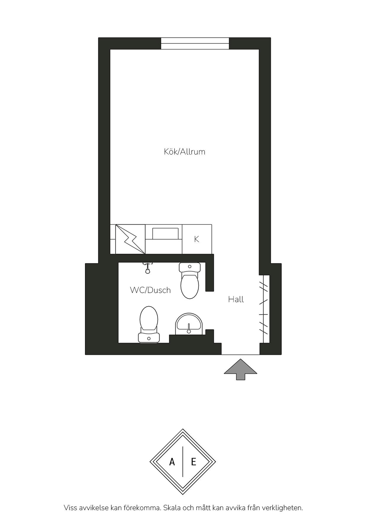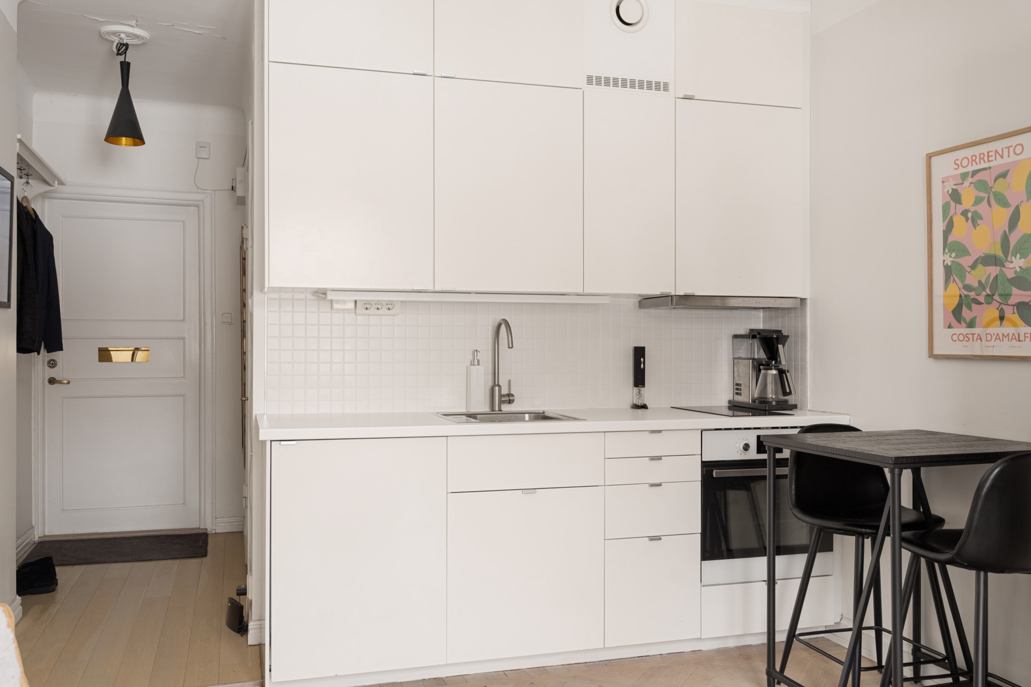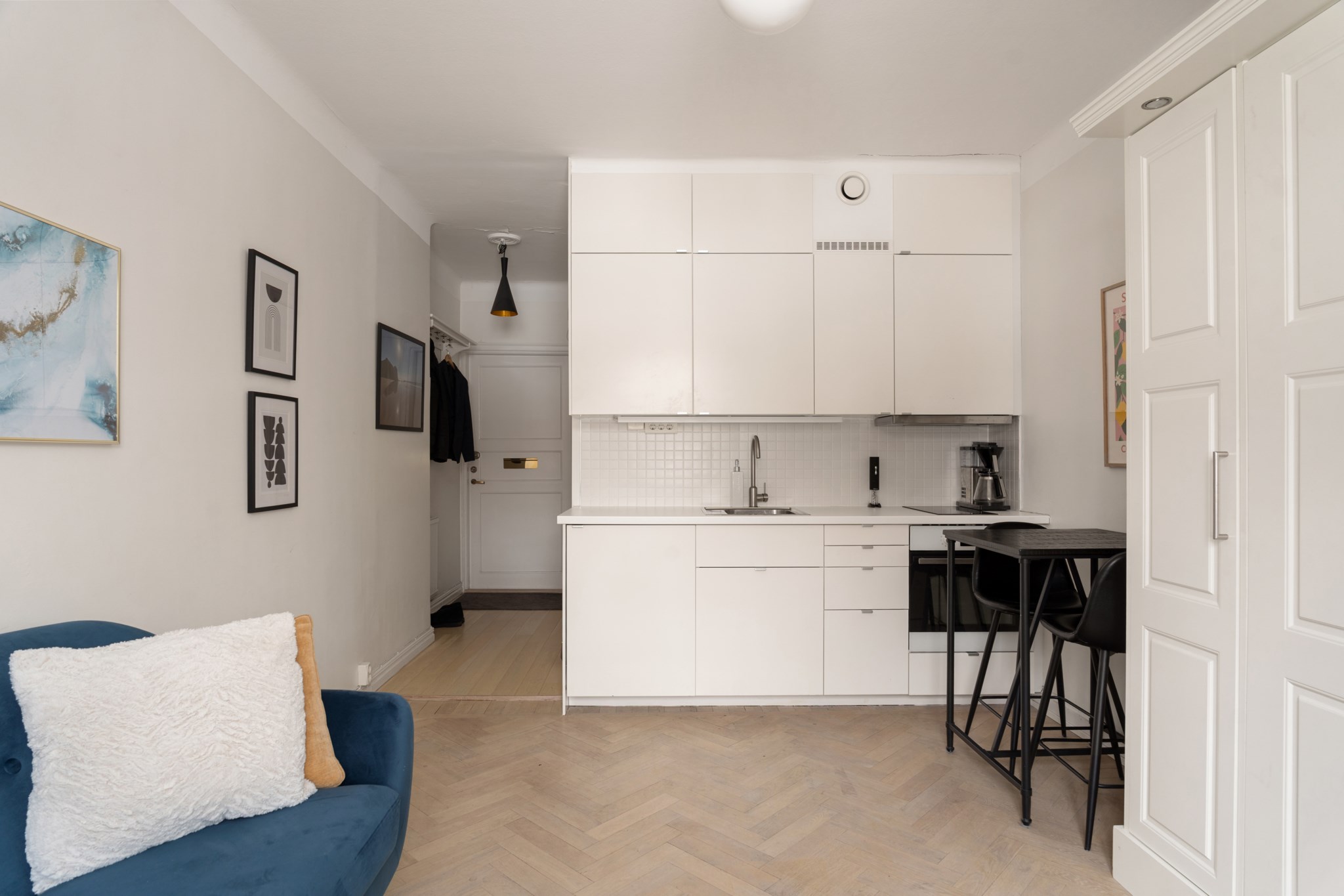 Bostaden erbjuder ett stilrent och välplanerat hem där varje kvadratmeter är omsorgsfullt utnyttjad. Det ljusa köket är funktionellt med vita skåpsluckor, vit bänkskiva och komplett maskinell utrustning i kompakt format, samt plats för ett mindre barbord. Allrummet präglas av ljus fiskbensparkett, vita väggar och ett charmigt spröjsat fönster som släpper in generöst med dagsljus, med smarta lösningar för både sittmöbler och säng. Badrummet är elegant och rymligt med svart klinkergolv, vita kakelväggar, dusch, kommod, spegelskåp, handdukstork och infällda spotlights. Hallen välkomnar med ljusa ytskikt, praktisk avhängning och ett naturligt flöde vidare in i bostaden.