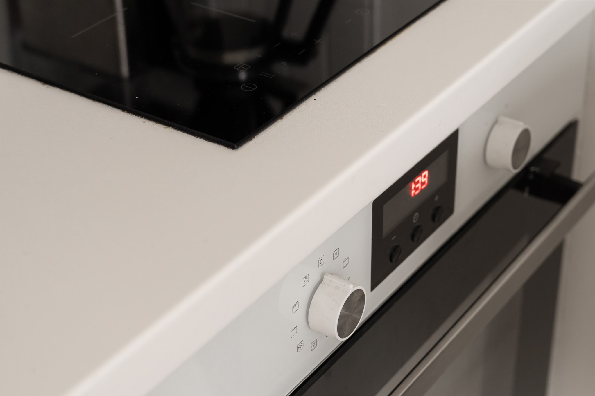 Stilrent och funktionellt kök med vita skåpsluckor. Trots sin storlek är köket välutrustat med vit bänkskiva, vitt stänkskydd, ugn, induktionshäll med två plattor, fläkt, diskho samt mindre kyl. Här finns även plats för ett barbord med två stolar.