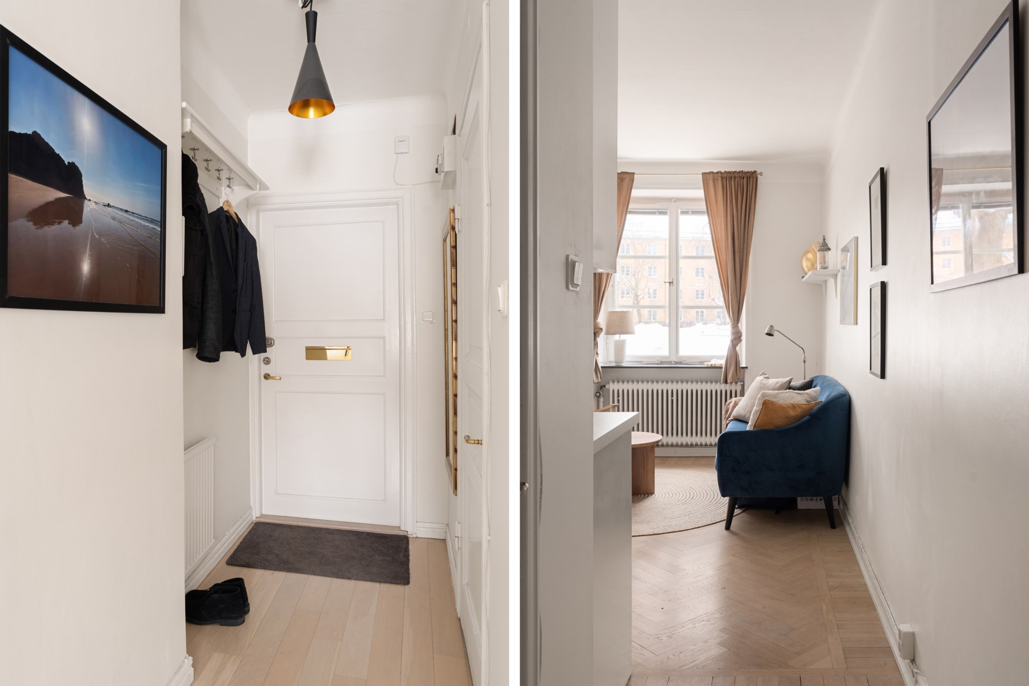 Ljus och inbjudande hall med ljust trägolv och vita väggar som ger ett stilrent första intryck. Här finns praktisk avhängningsmöjlighet direkt innanför dörren. Hallen leder vidare in till bostadens allrum och skapar ett trevligt flöde.