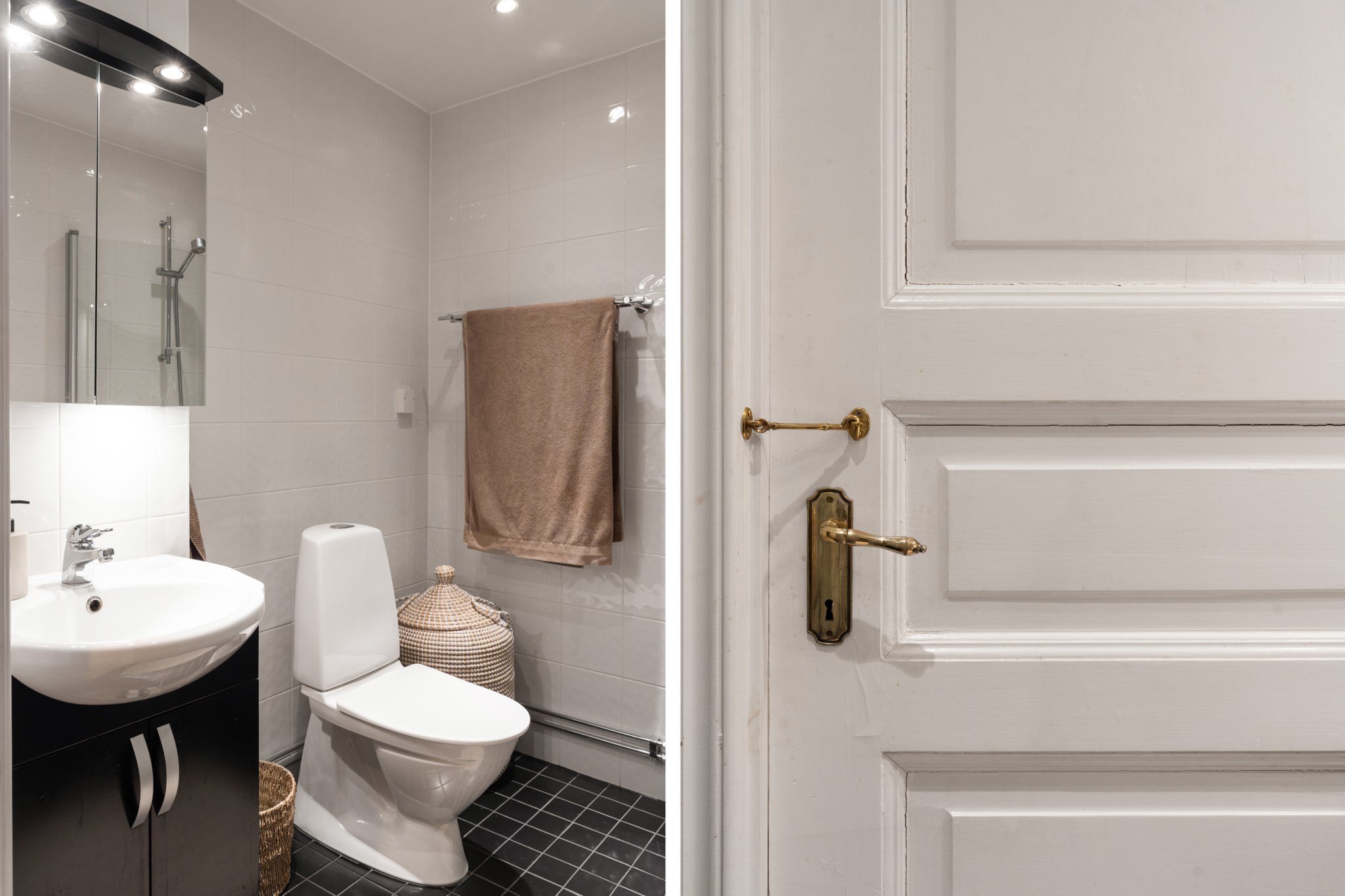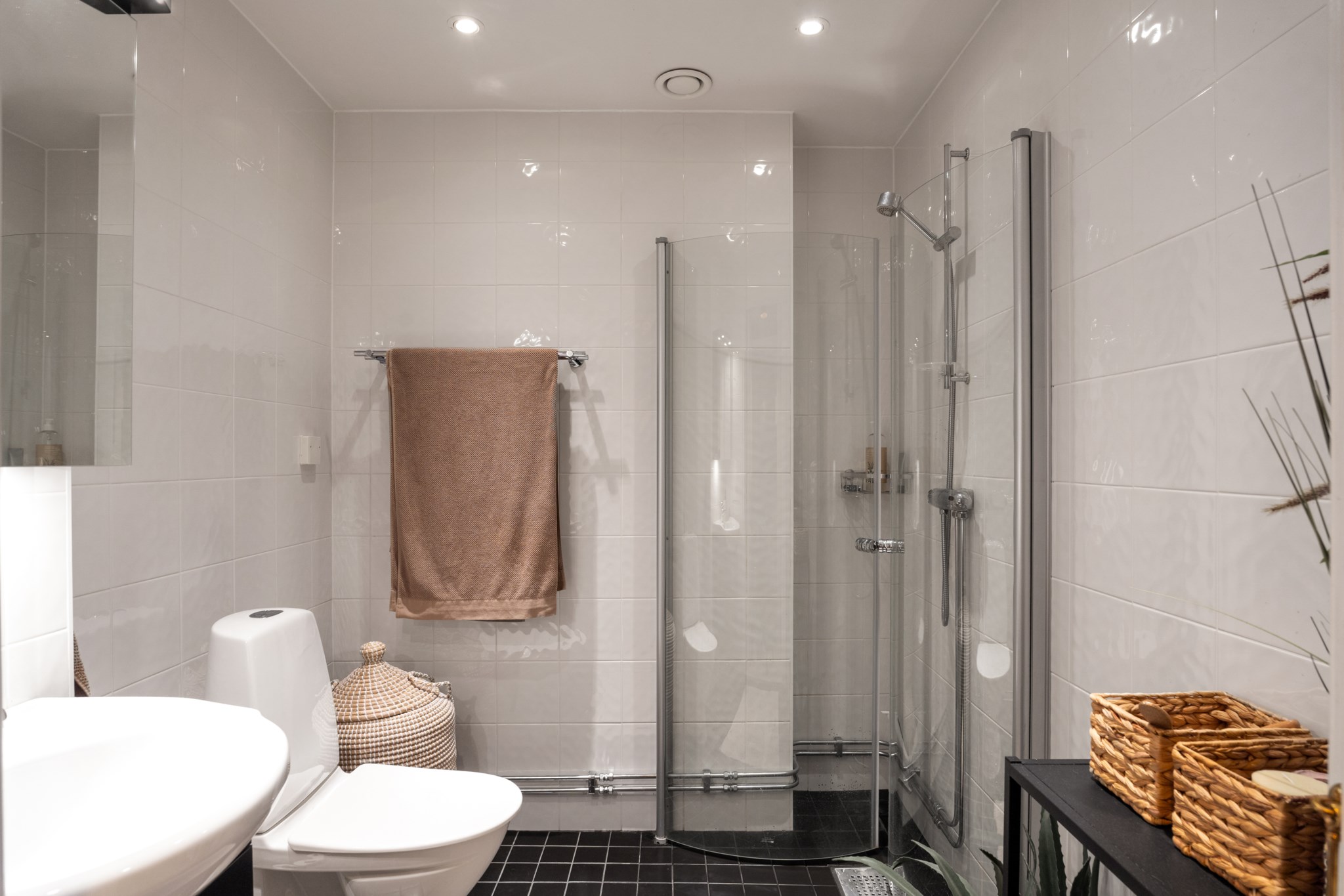 Rymligt och välplanerat badrum med dusch, WC och handfat med kommod samt spegelskåp. Praktisk avställningsbänk ger extra förvaring. Stilrent svart klinkergolv kombineras med vita kakelväggar. Utrustat med handdukstork och infällda spotlights som skapar en behaglig atmosfär.