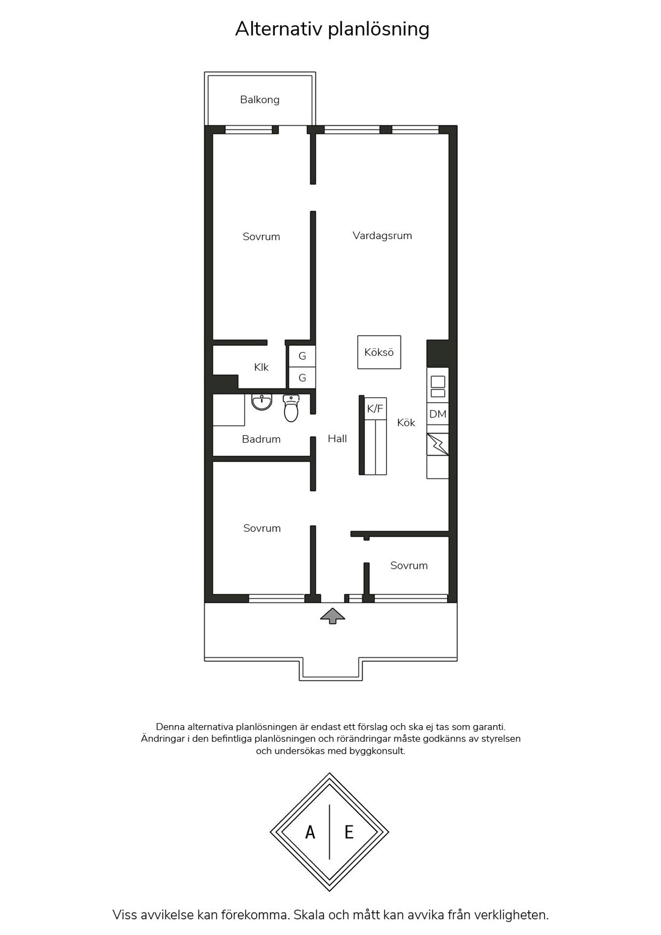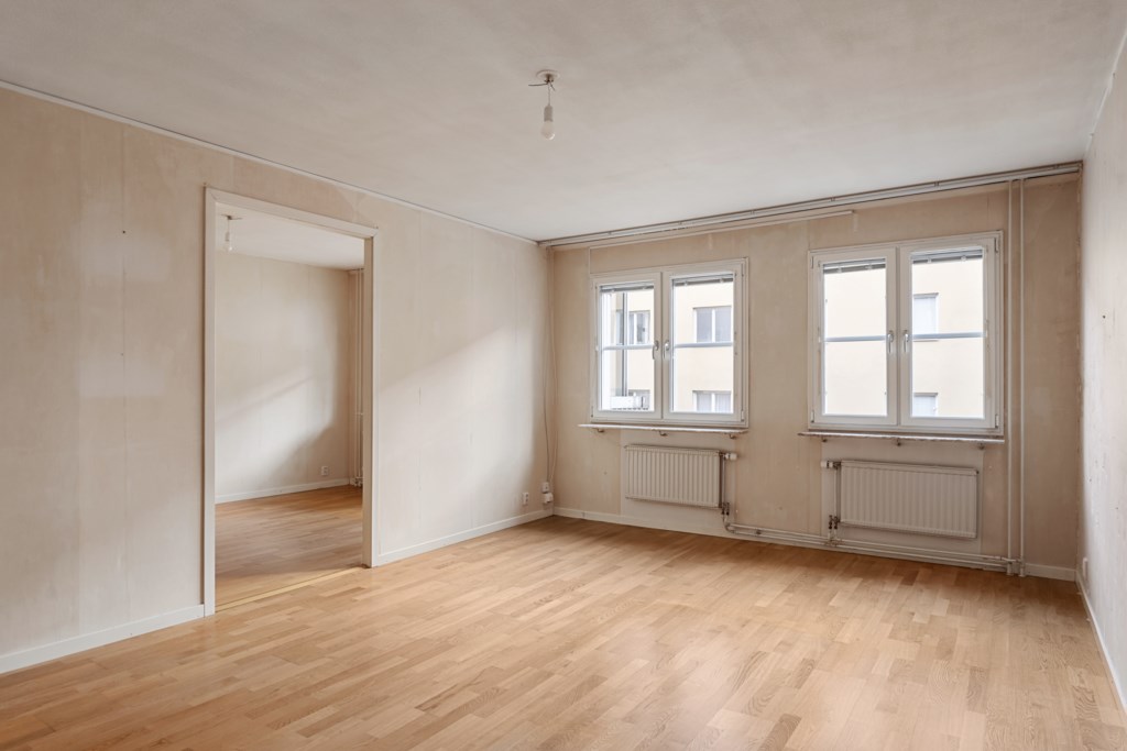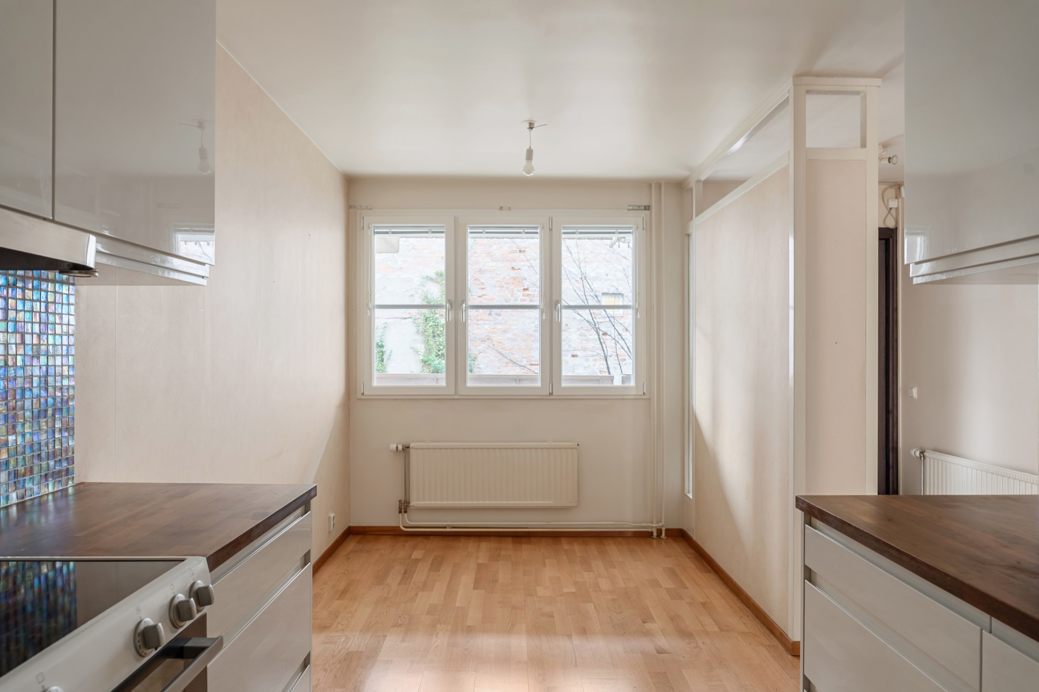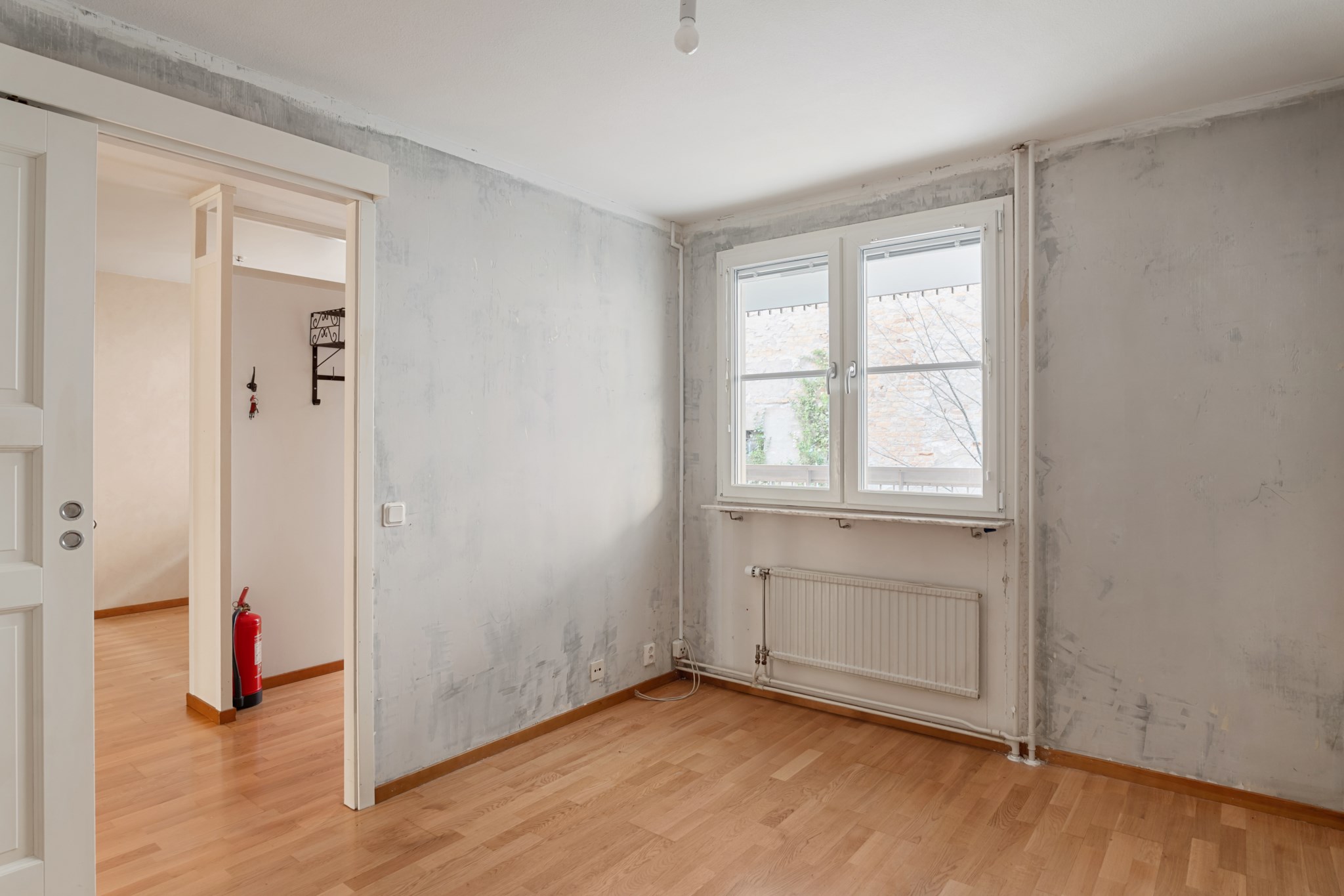 Renoveringschans – ljus och välplanerad 3:a som kan bli en 4:a i stabil förening med pool och garage