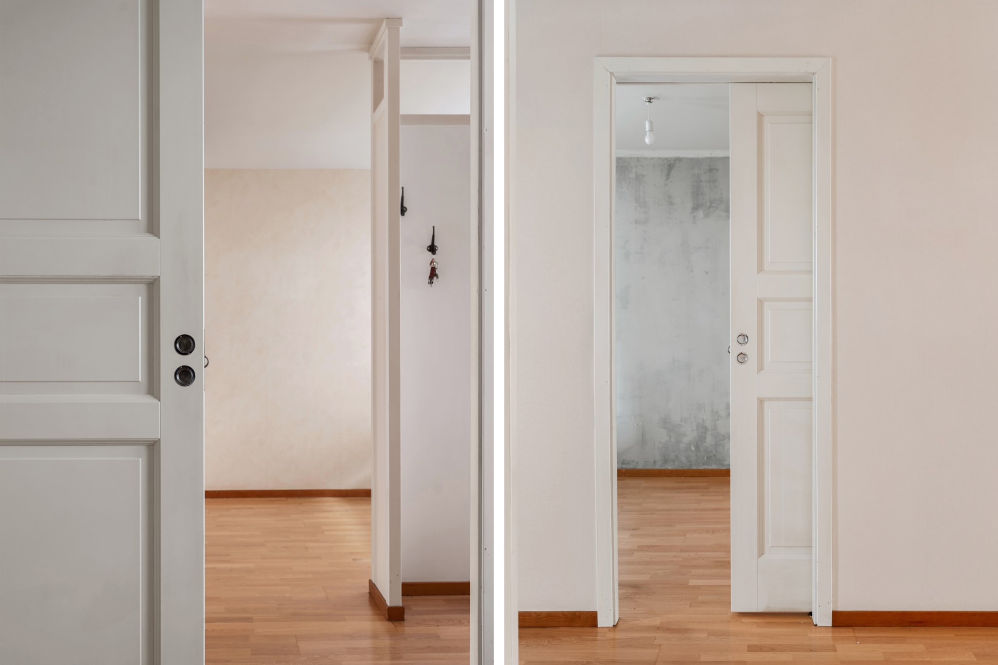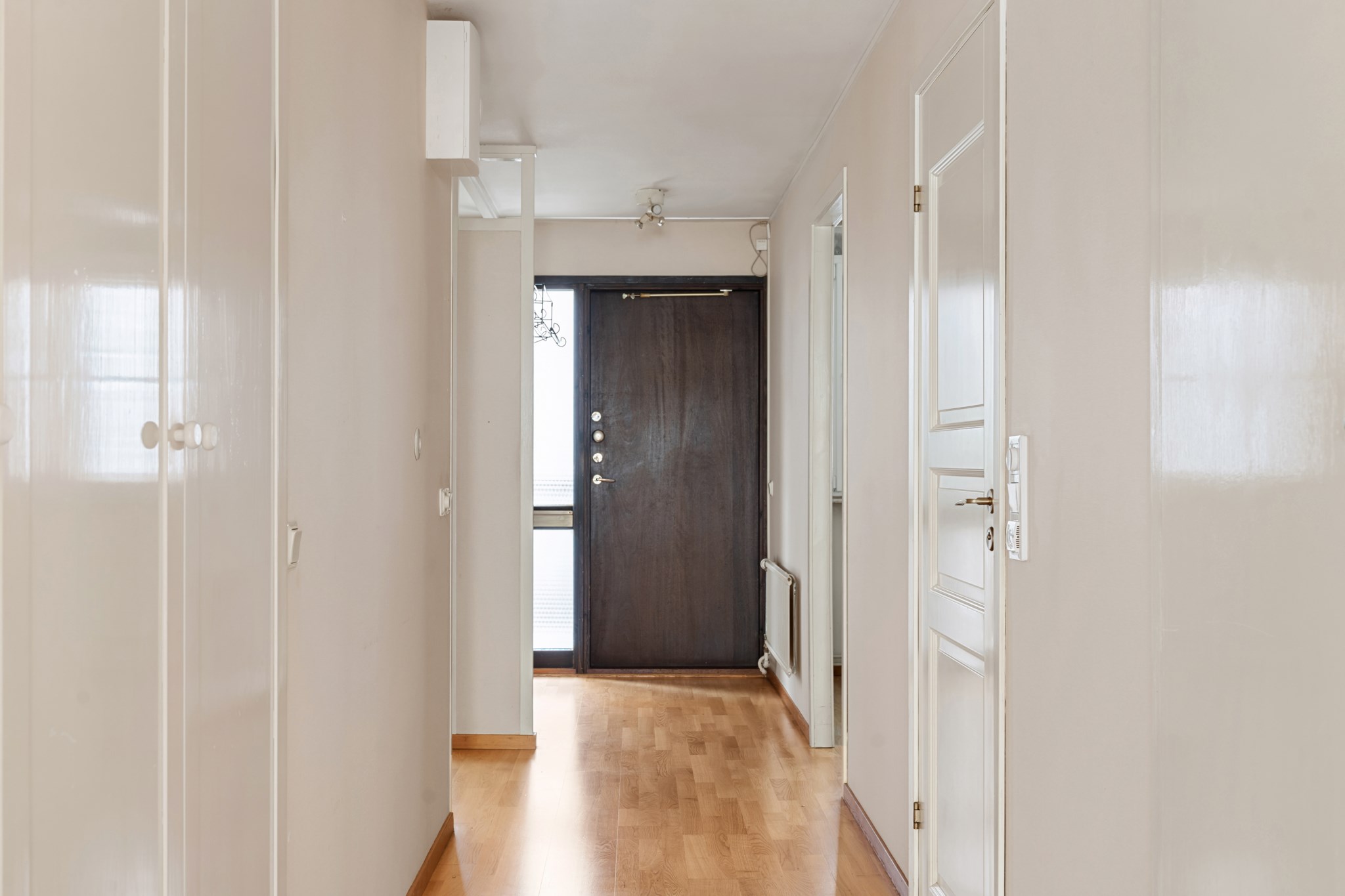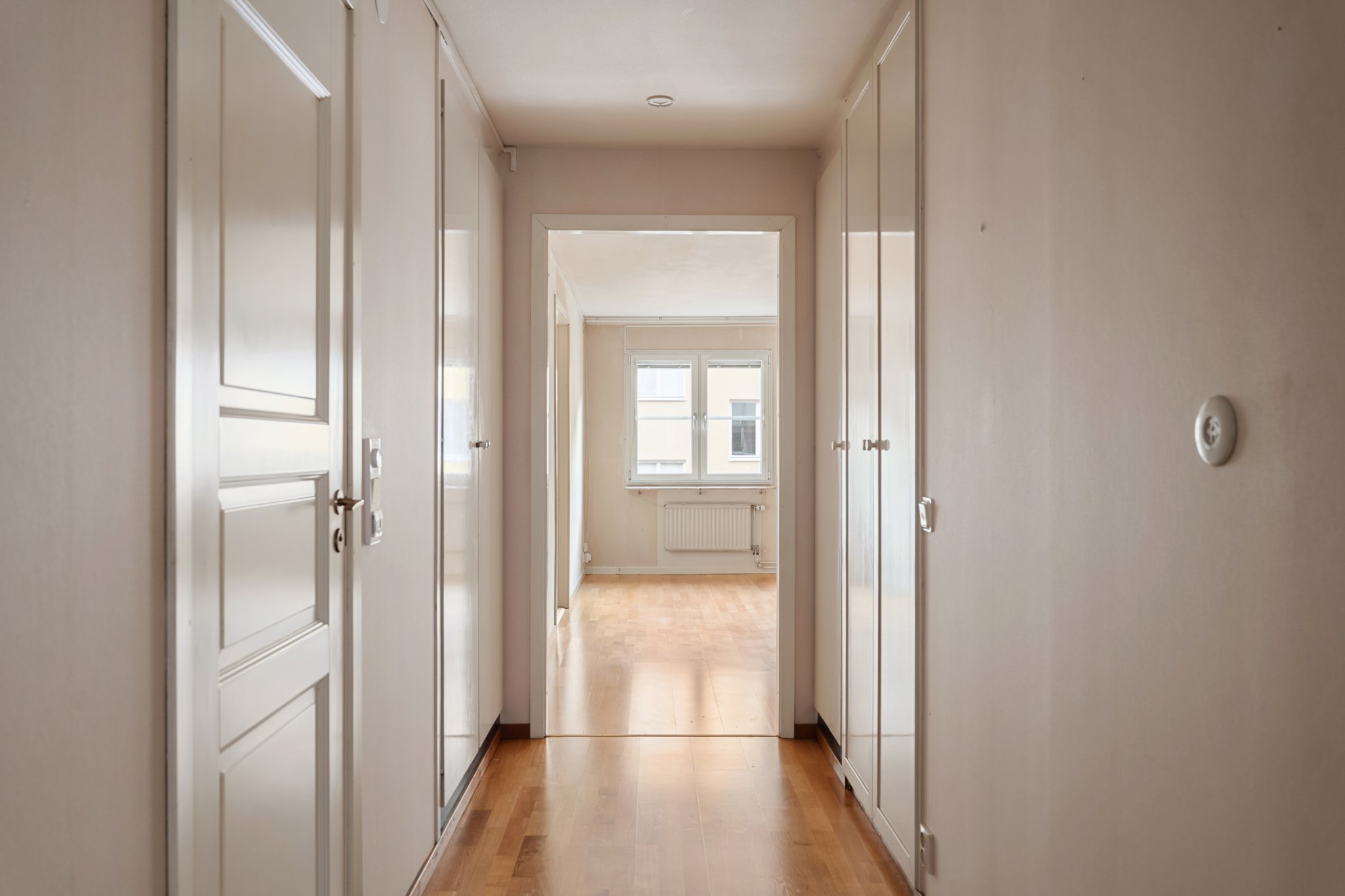 Välkomnande hall med trägolv och ljusa väggar. Direkt innanför dörren finns praktiska avhängningsmöjligheter. Hallen övergår i en korridor som erbjuder gott om förvaring i form av flera garderober och leder vidare in till lägenhetens övriga rum.