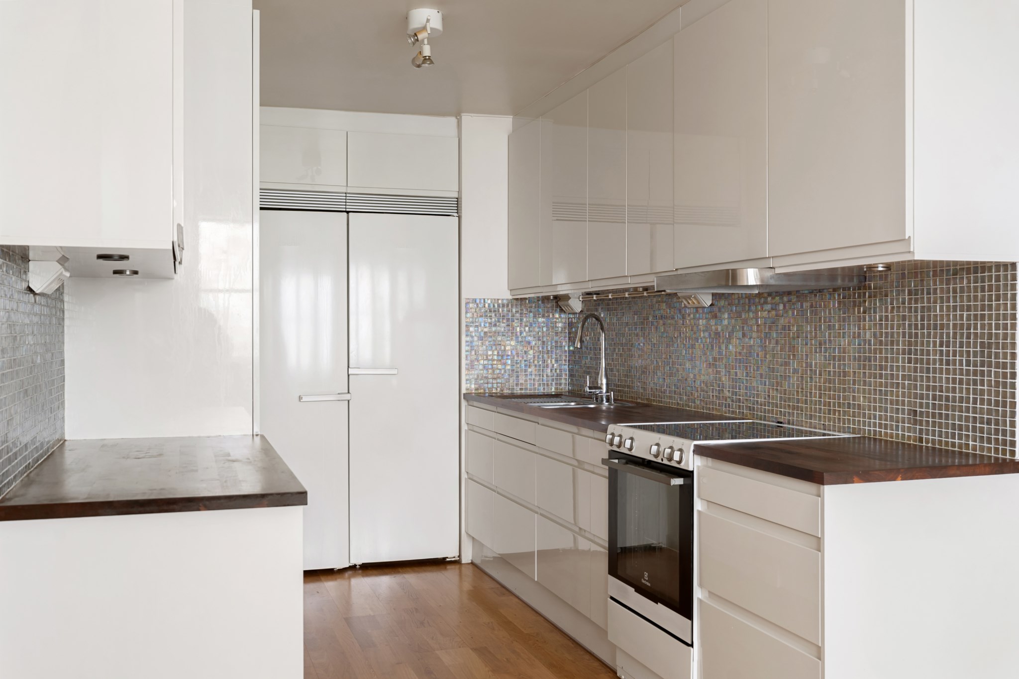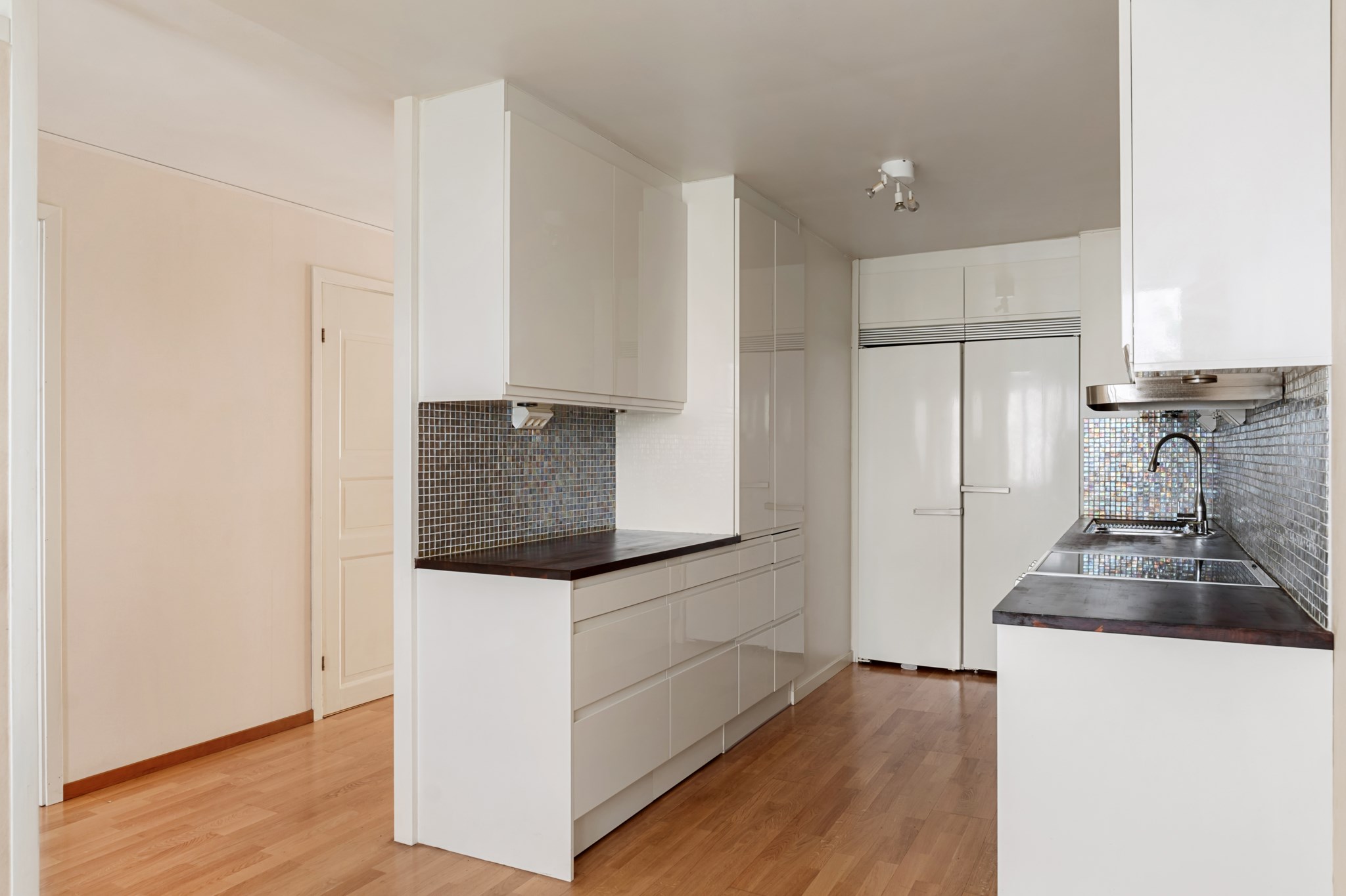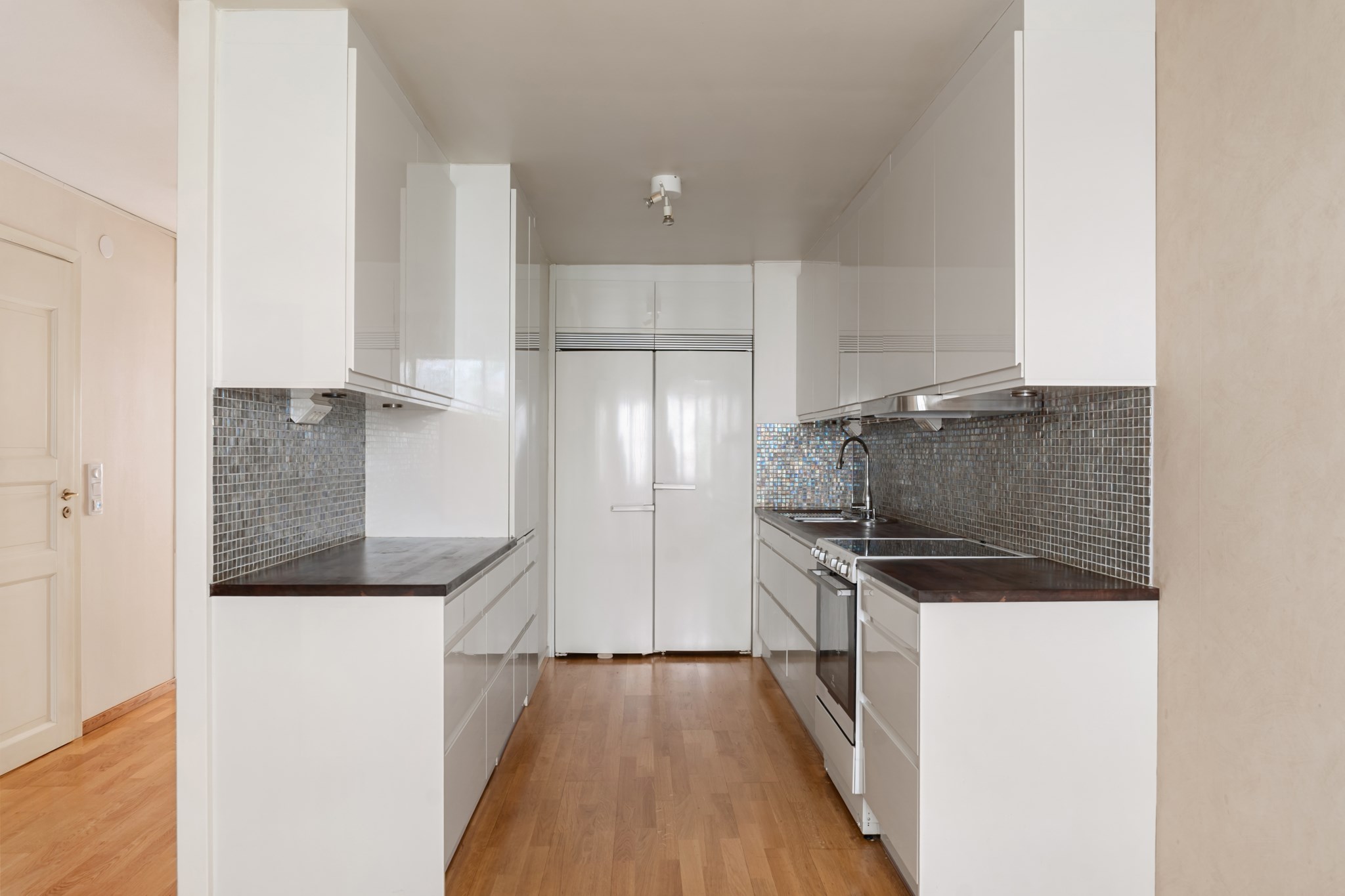 Rymligt och funktionellt kök med generöst fönsterparti som släpper in rikligt med dagsljus. Här finns god arbetsyta och en komplett maskinell utrustning bestående av kyl, frys, spis, ugn, fläkt, diskho och diskmaskin. Köket har ljusa luckor, mörk träbänkskiva samt ett stilfullt mosaikstänkskydd. De ljusa väggarna och trägolvet skapar en harmonisk helhet. Här finns gott om plats för matbord och stolar för fyra personer.