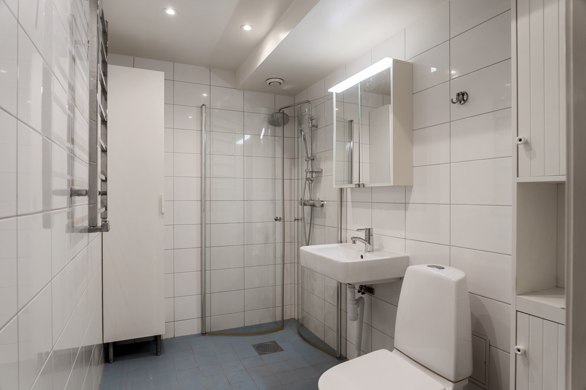 Rymligt badrum med dusch, WC och handfat med spegel och förvaring. Här finns dessutom två badrumsskåp, spottar i taket och handdukstork. Rummet har blått klinkergolv och vita kakelväggar.