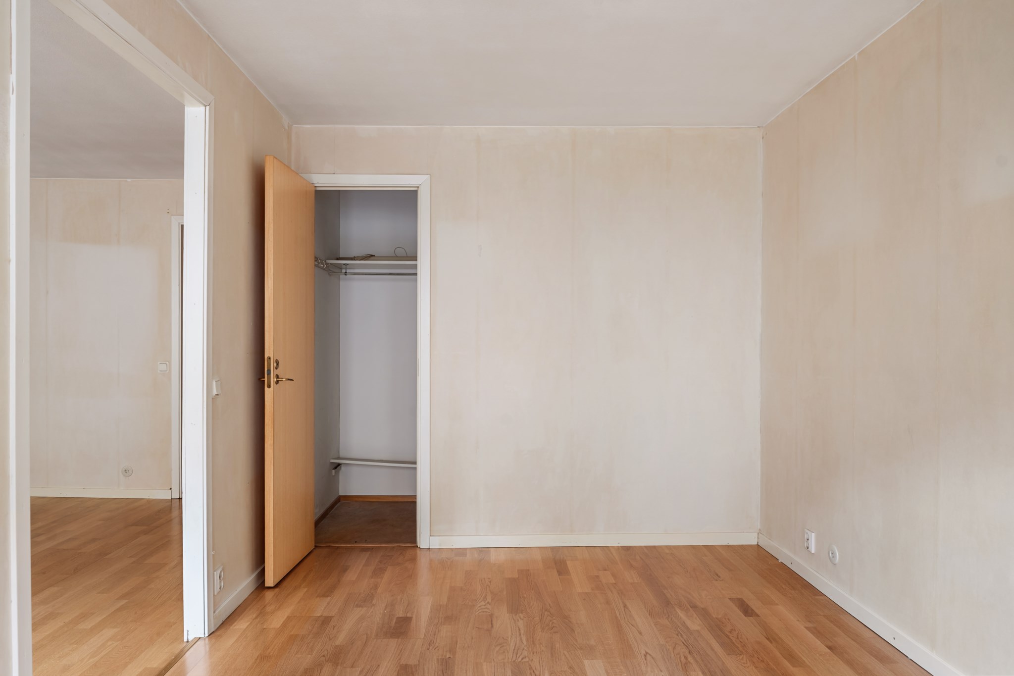 Ljust sovrum med beiga väggar och trägolv. Här finns både ett fönster och en glasdörr som leder ut till lägenhetens inglasade balkong. Rummet erbjuder plats för säng, sängbord och garderober. Från sovrummet nås även en klädkammare via en separat dörr.