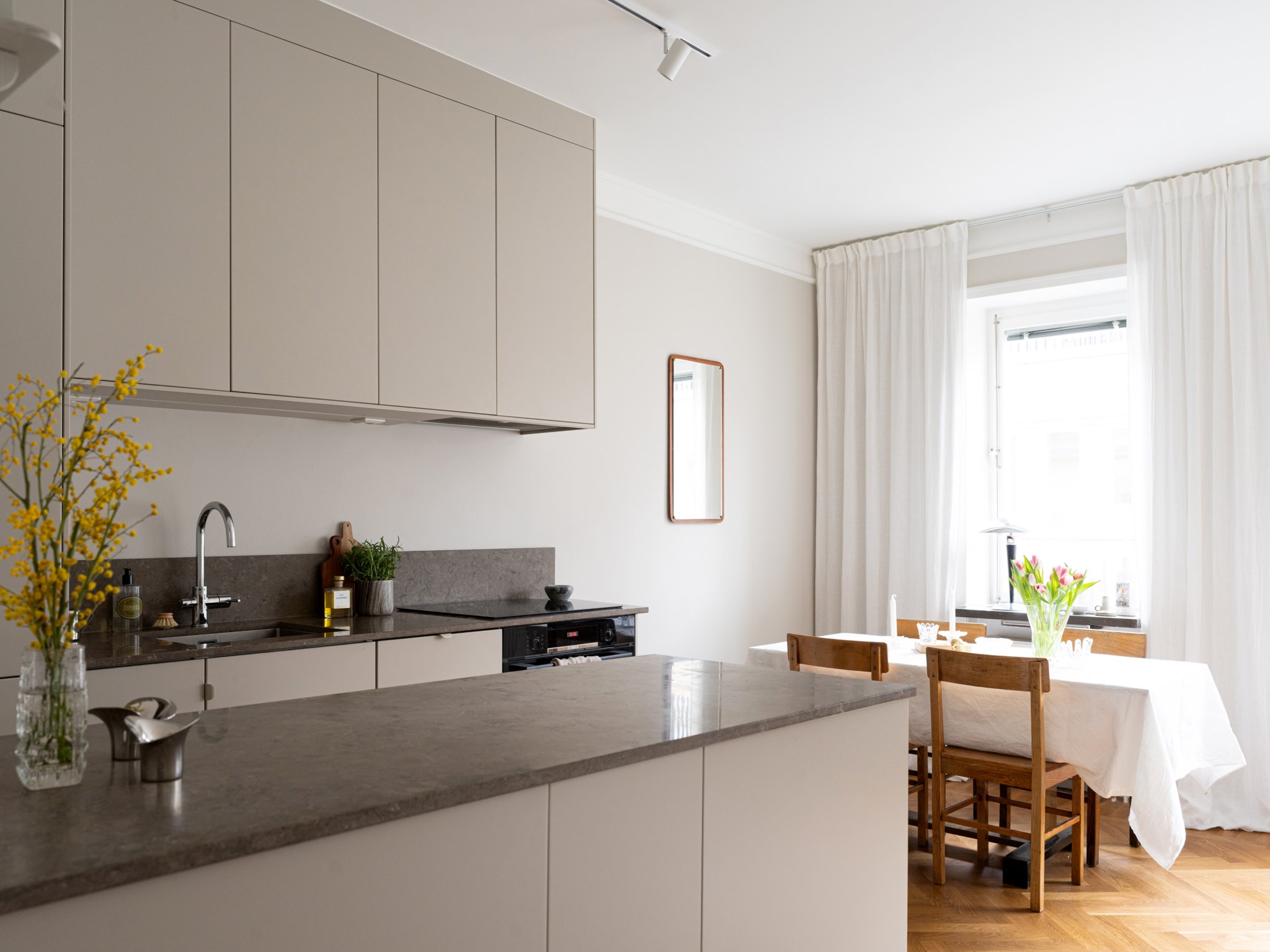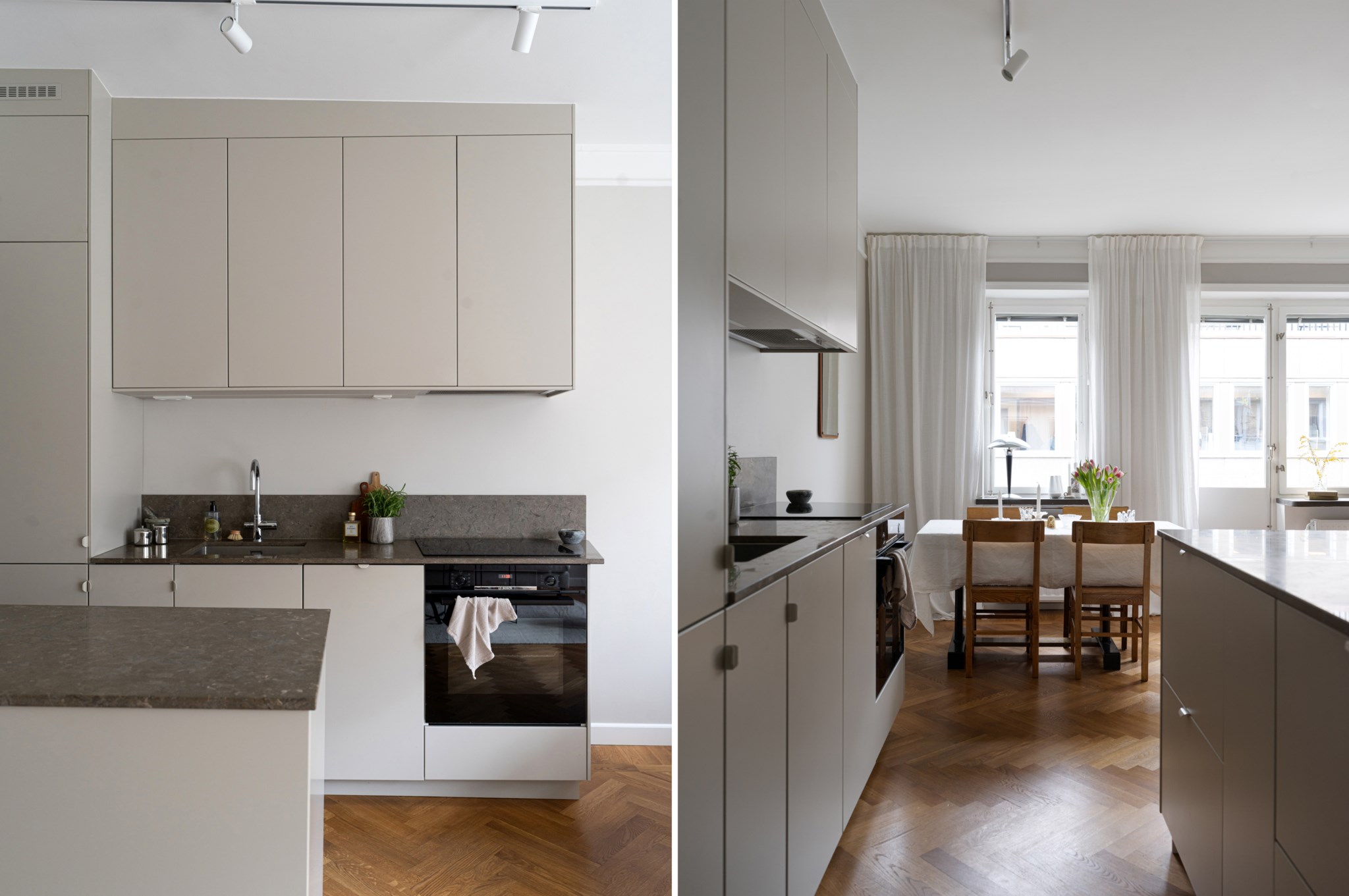 Stilfullt kök som går i gråa toner med bänkskiva och stänkskydd i smakfull