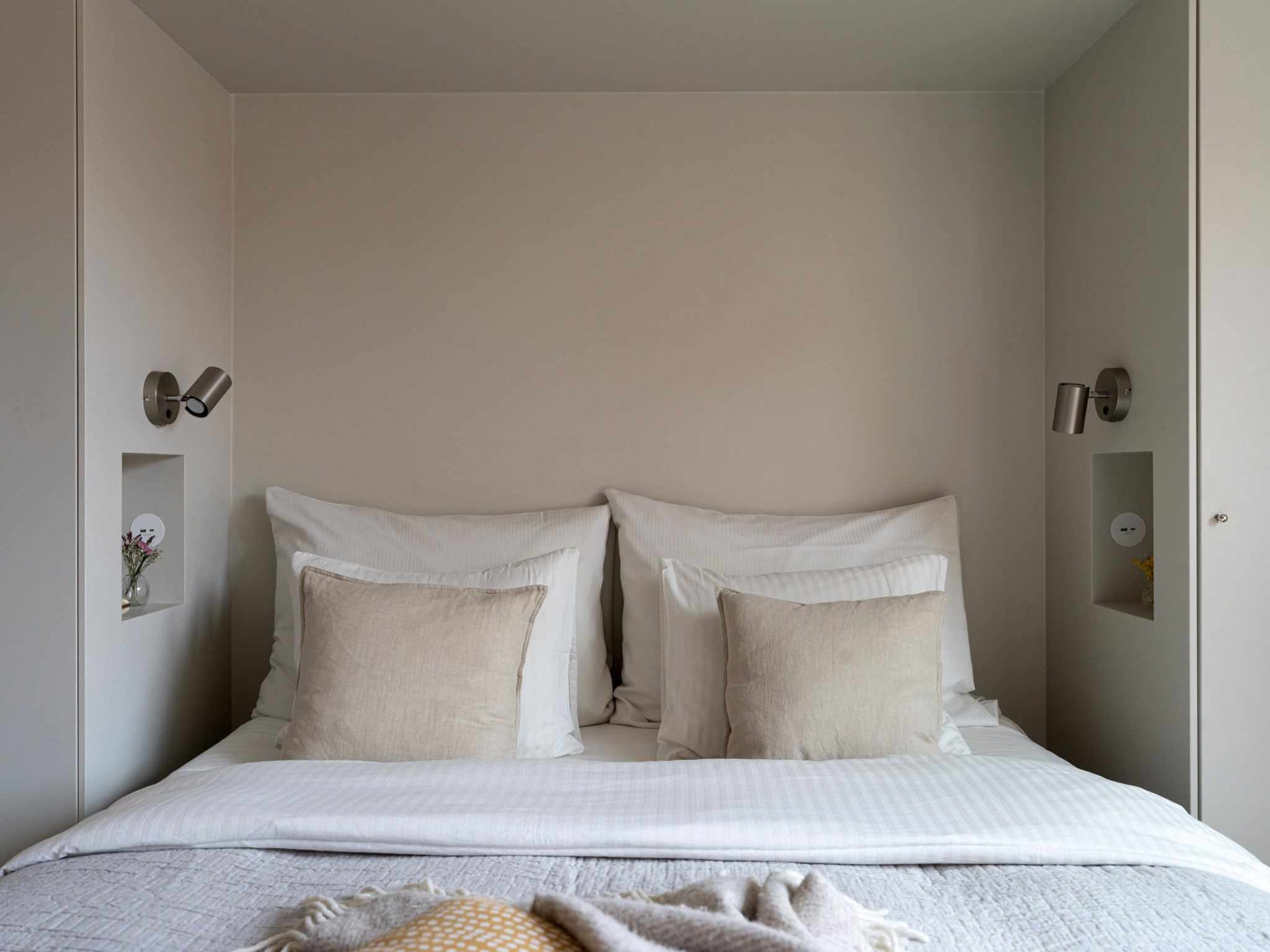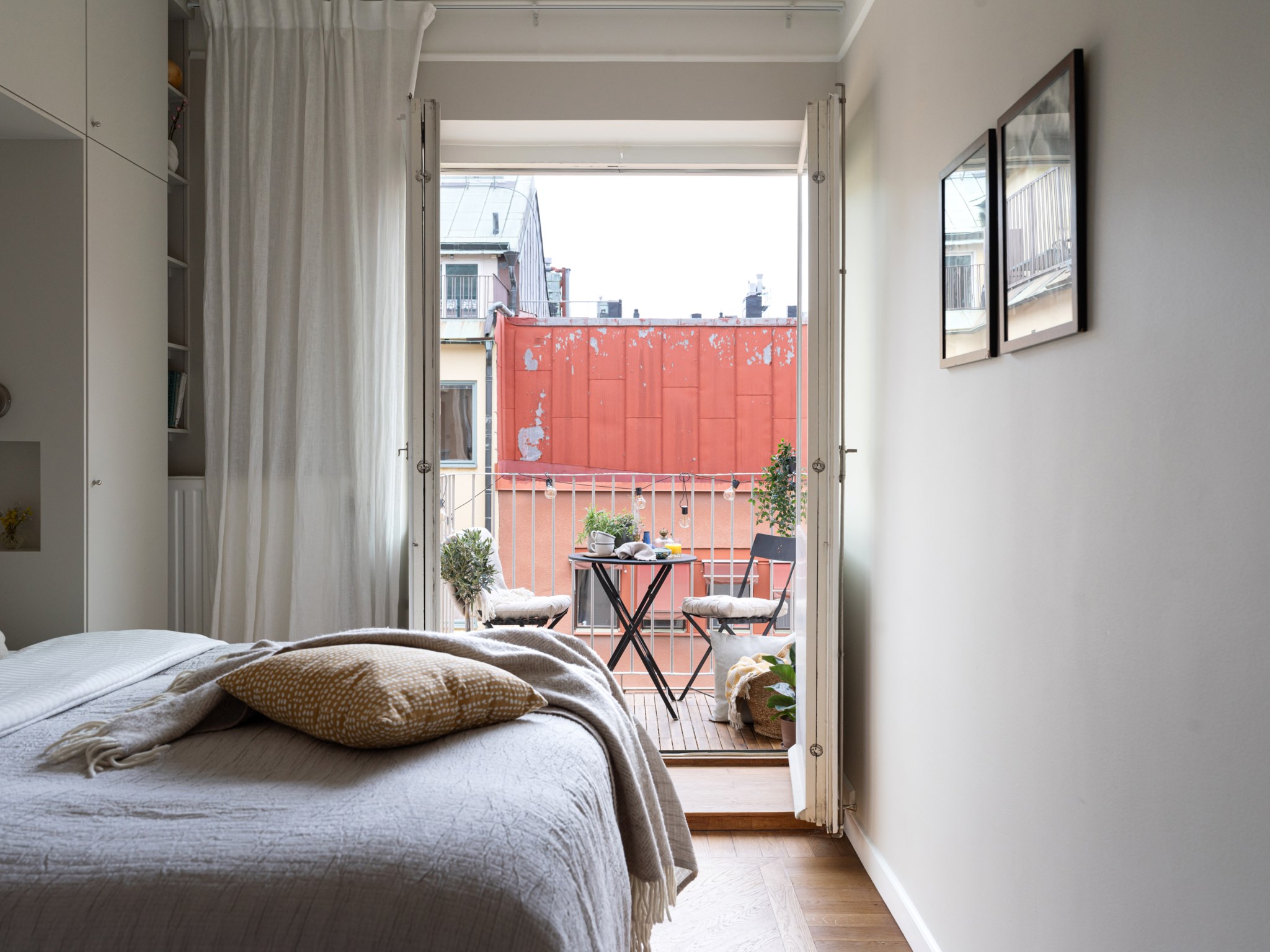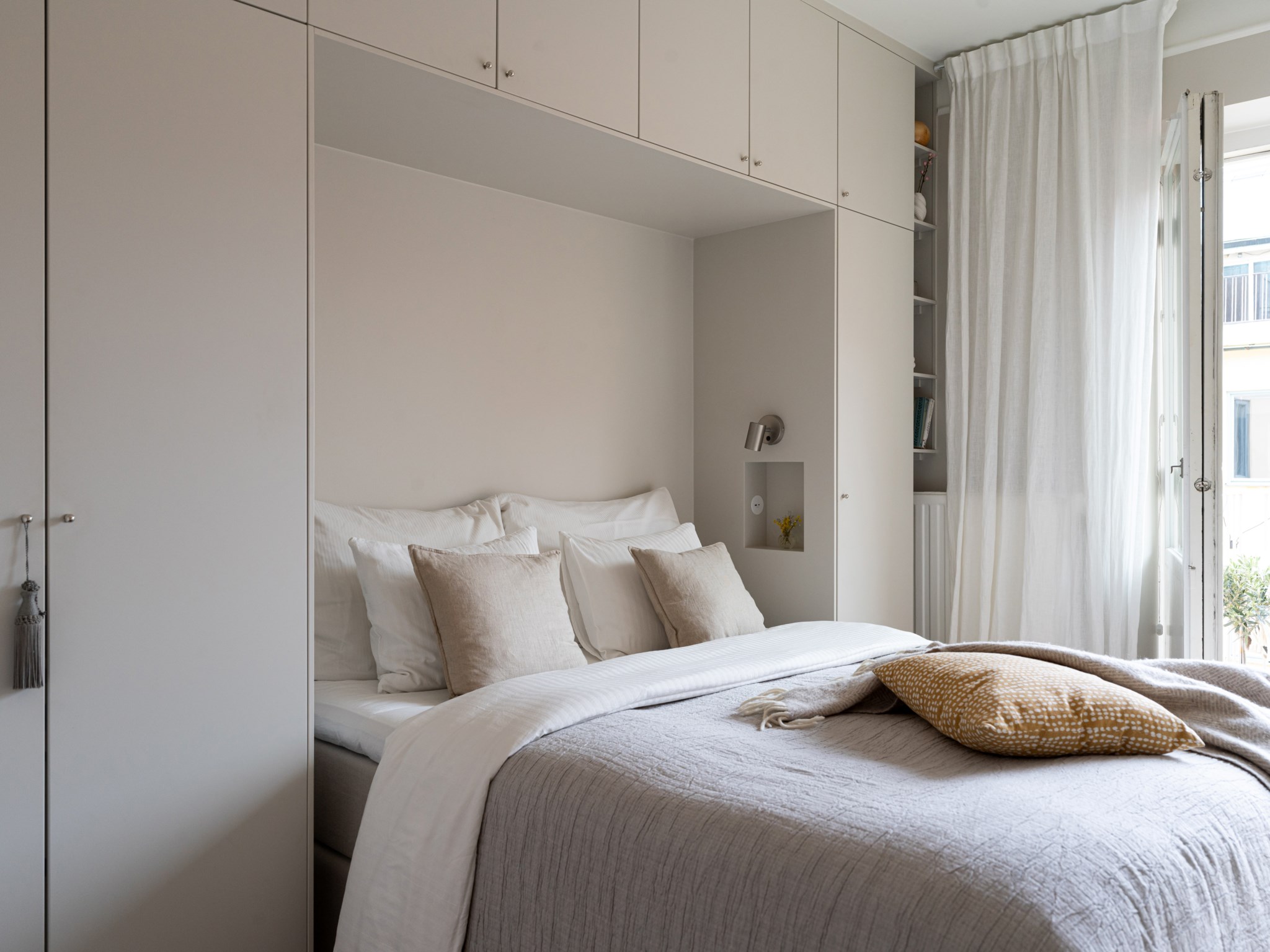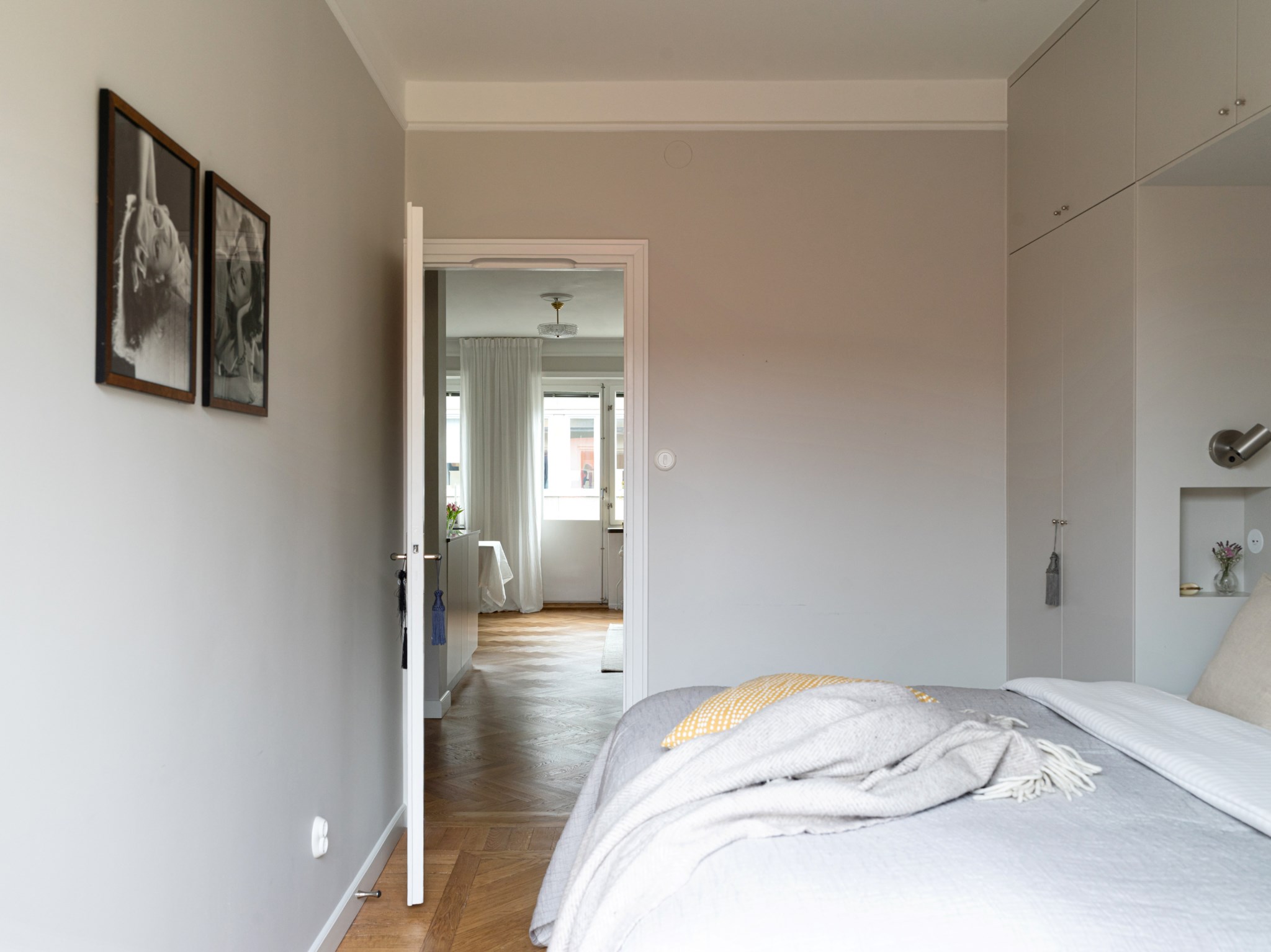 Smakfullt sovrum med plats för säng och annat möblemang efter smak och behov. Ytskikten består av ljusa väggar och ljus fiskbensparkett. Sovrummet erbjuder gott om förvaring via platsbyggd garderob runt säng. Från sovrummet nås även den mysiga balkongen via dubbeldörrar.