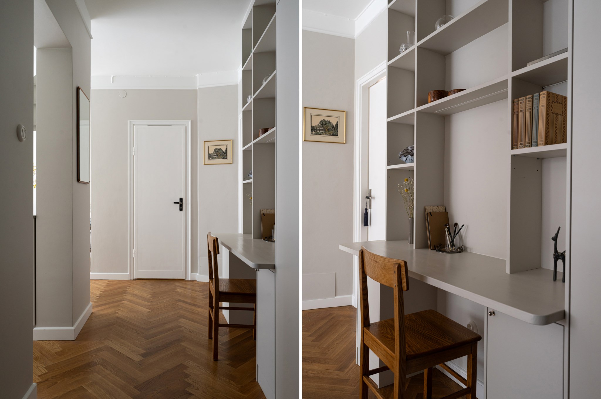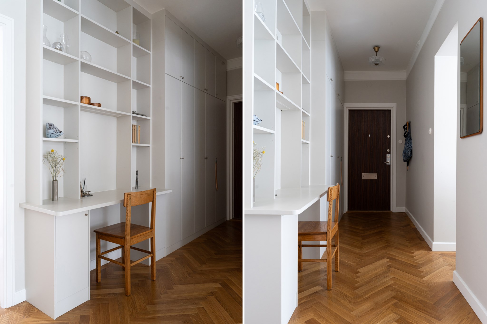 Välkomnande hall med ytskikt bestående av ljusa väggar och fiskbensparkett. Här finns gott om förvaring via platsbyggd garderob. Hallen har även en platsbyggd bokhylla med skrivbord.