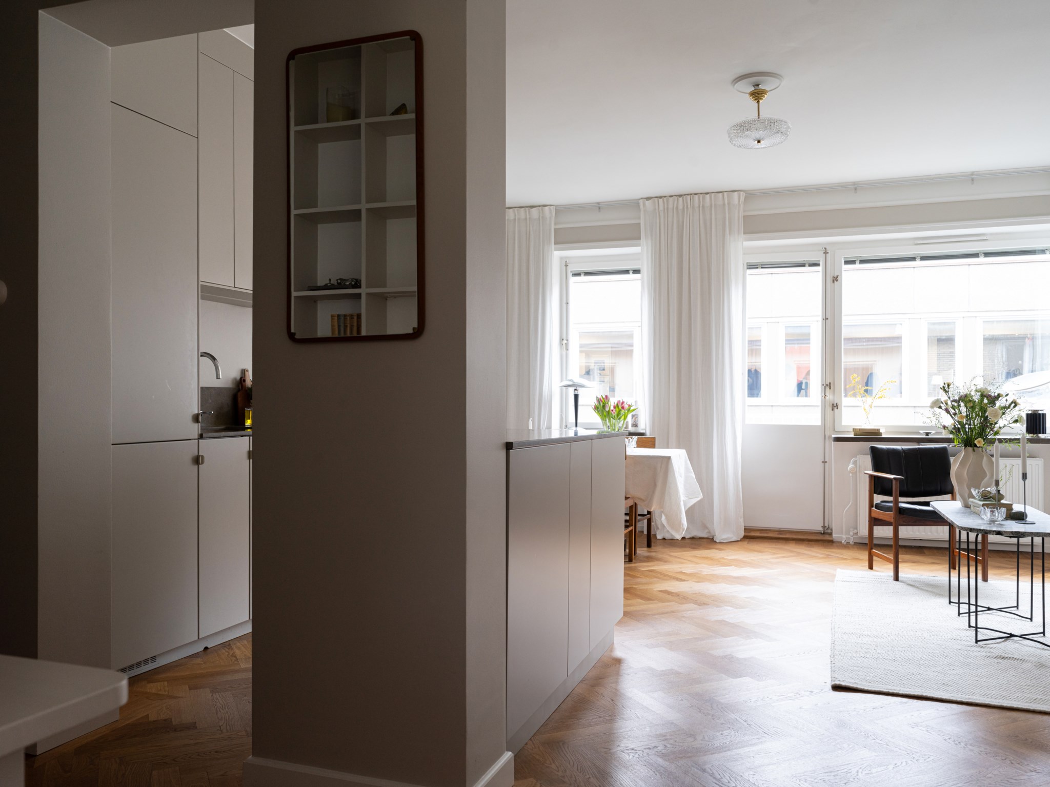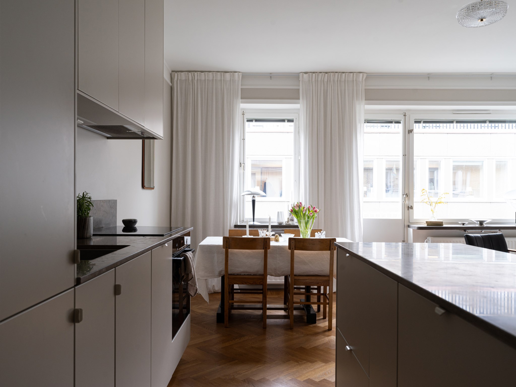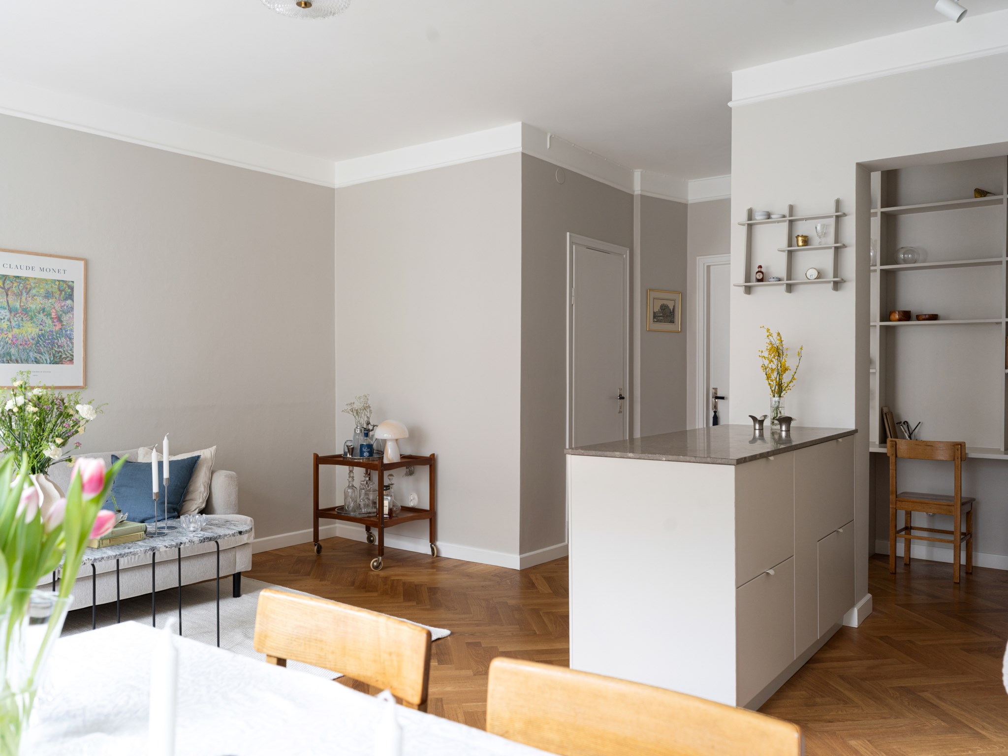 Det nyrenoverade köket är både funktionellt och påkostat, med bänkskivor i kalksten och god plats för både matlagning och umgänge. Det platsbyggda hemmakontoret ger ett personligt och inbjudande uttryck, perfekt för den som gillar att omge sig med sina favoritböcker och detaljer. I det luftiga sovrummet finns platsbyggda garderober med plats för en 180-säng. Det helkaklade badrummet håller hög standard med bänkskiva i granit och integrerad tvättmaskin. Lägenheten är verkligen ett drömboende för den som söker både funktion och stil.