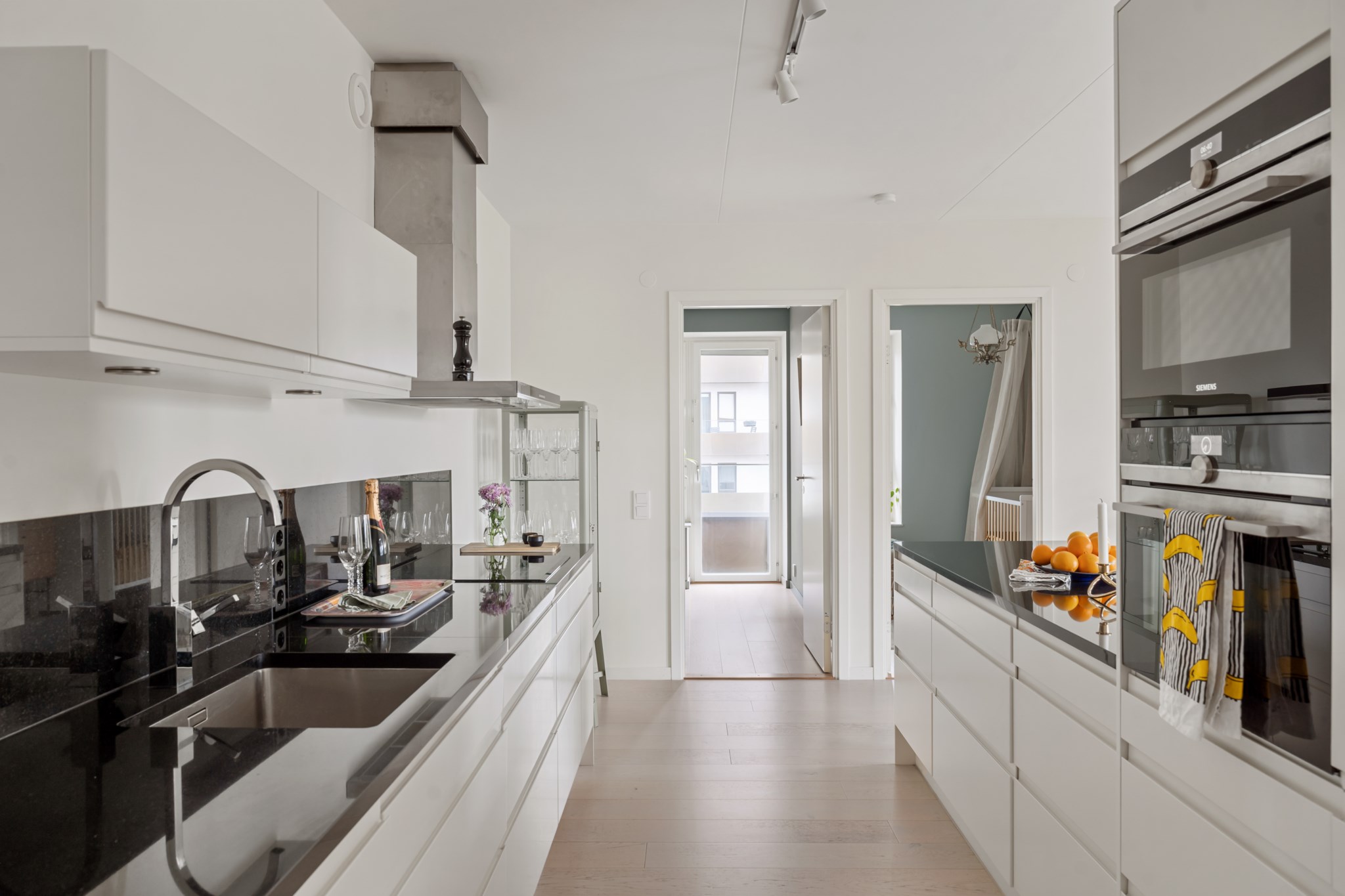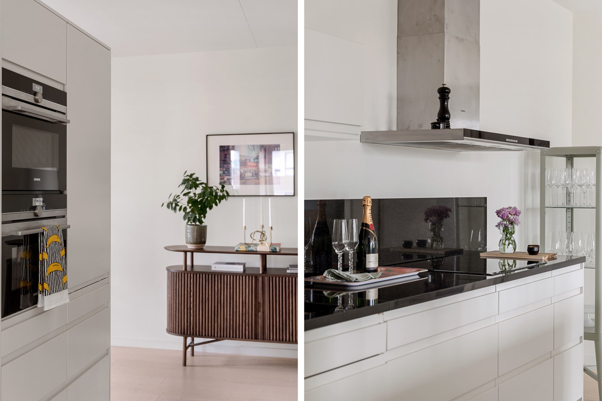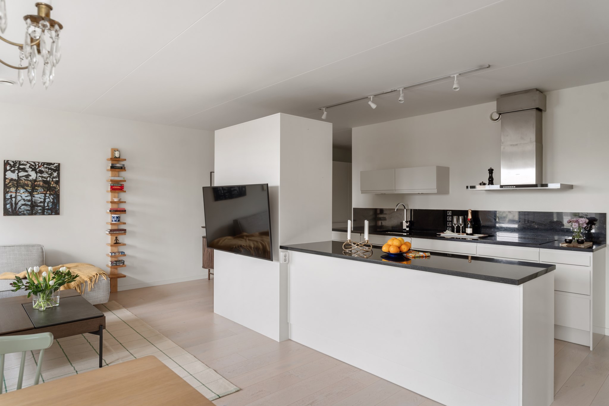 Från hallen nås det moderna och välutrustade köket. Köket erbjuder generöst med förvaring och arbetsyta tack vare en lång köksbänk längs väggen samt en praktisk köksö mittemot. Inredningen består av vita kökslådor och en stilfull svart bänkskiva som skapar en elegant kontrast. Här finns all utrustning som behövs, diskmaskin, spis, fläkt, ugn, mikro, kyl och frys. Köket är öppet mot vardagsrummet, vilket ger en social planlösning och ett fint ljusflöde genom hela rummet. Ljust trägolv och ljusa väggar förstärker den fräscha känslan.