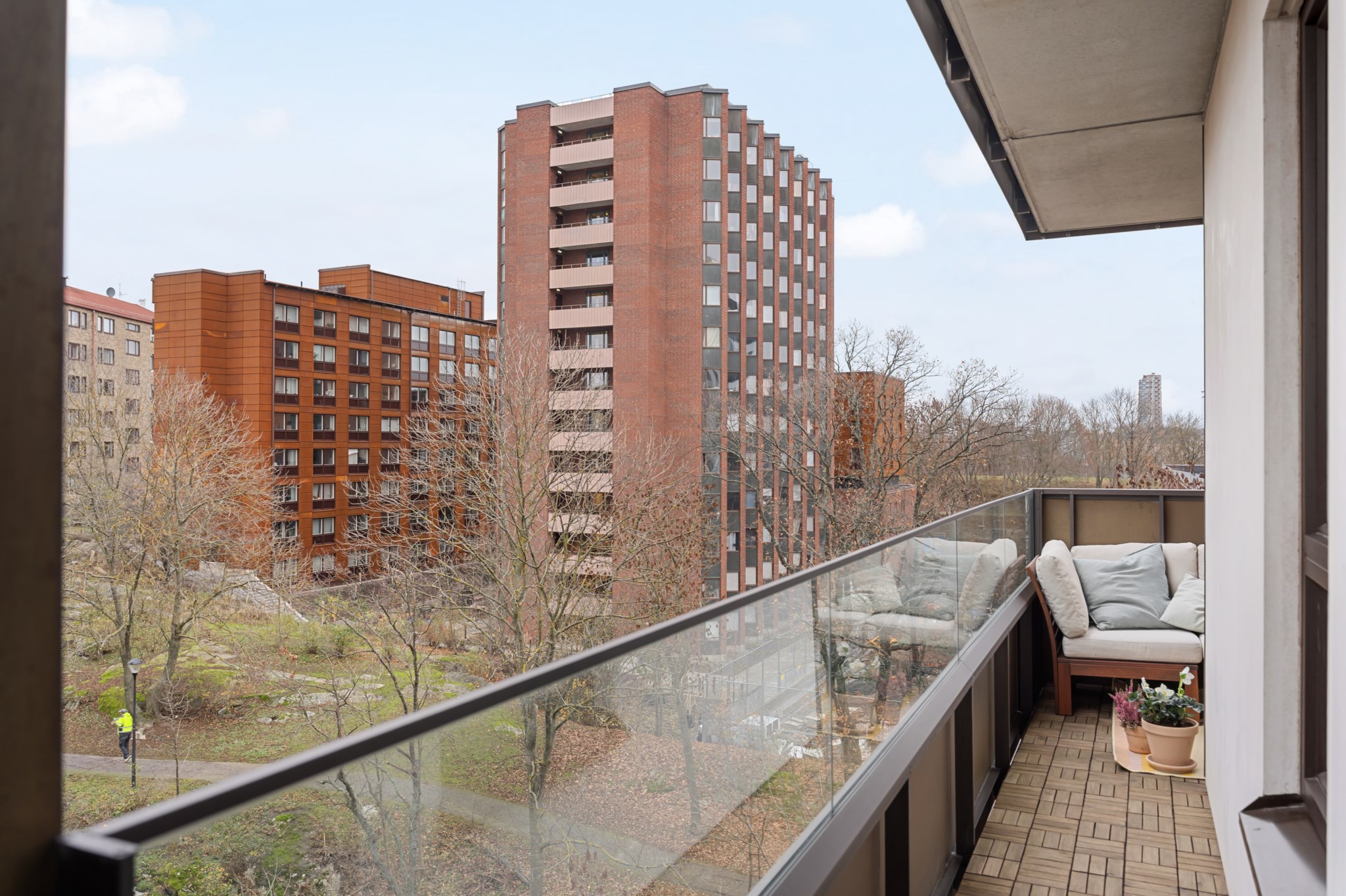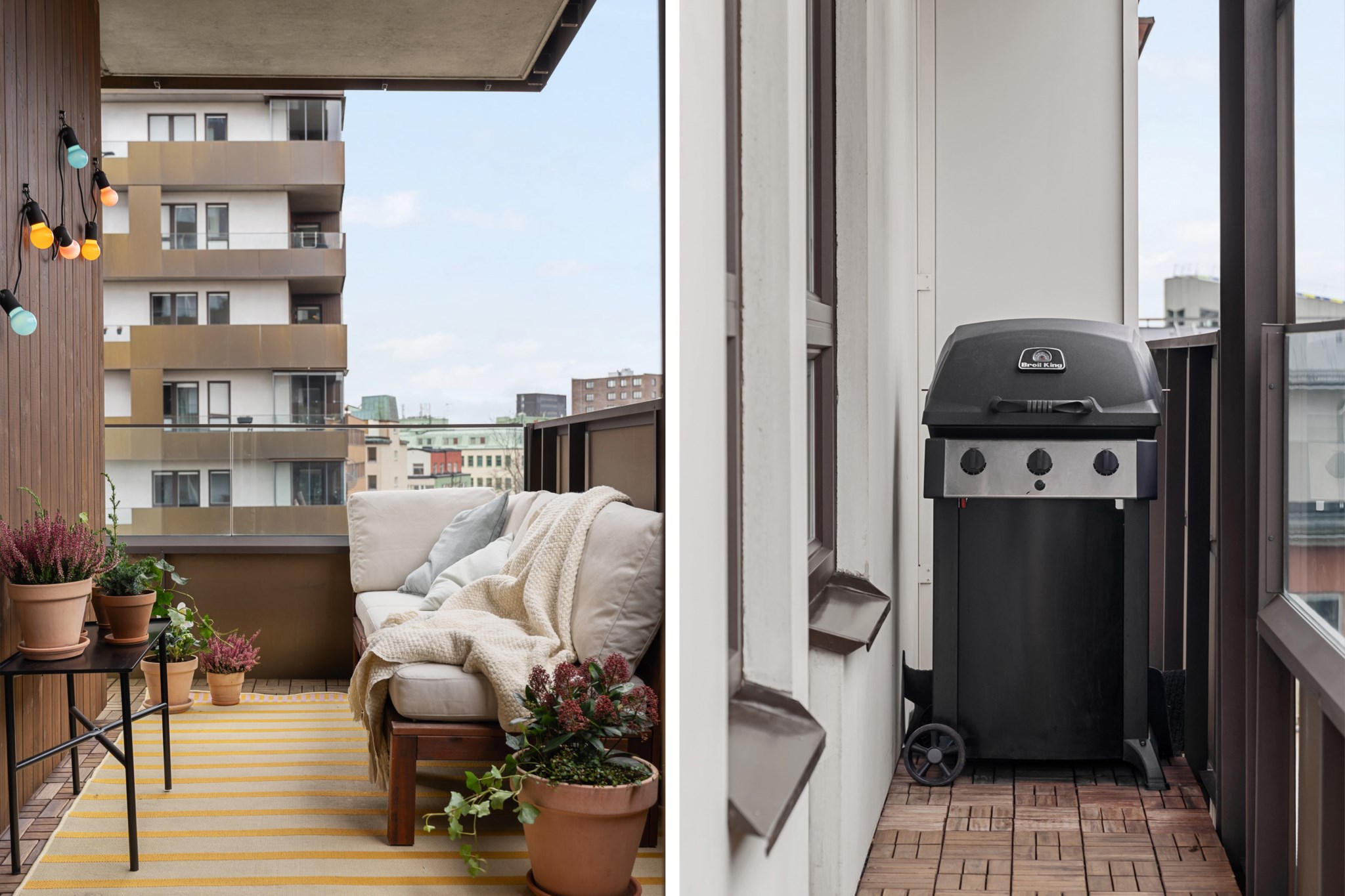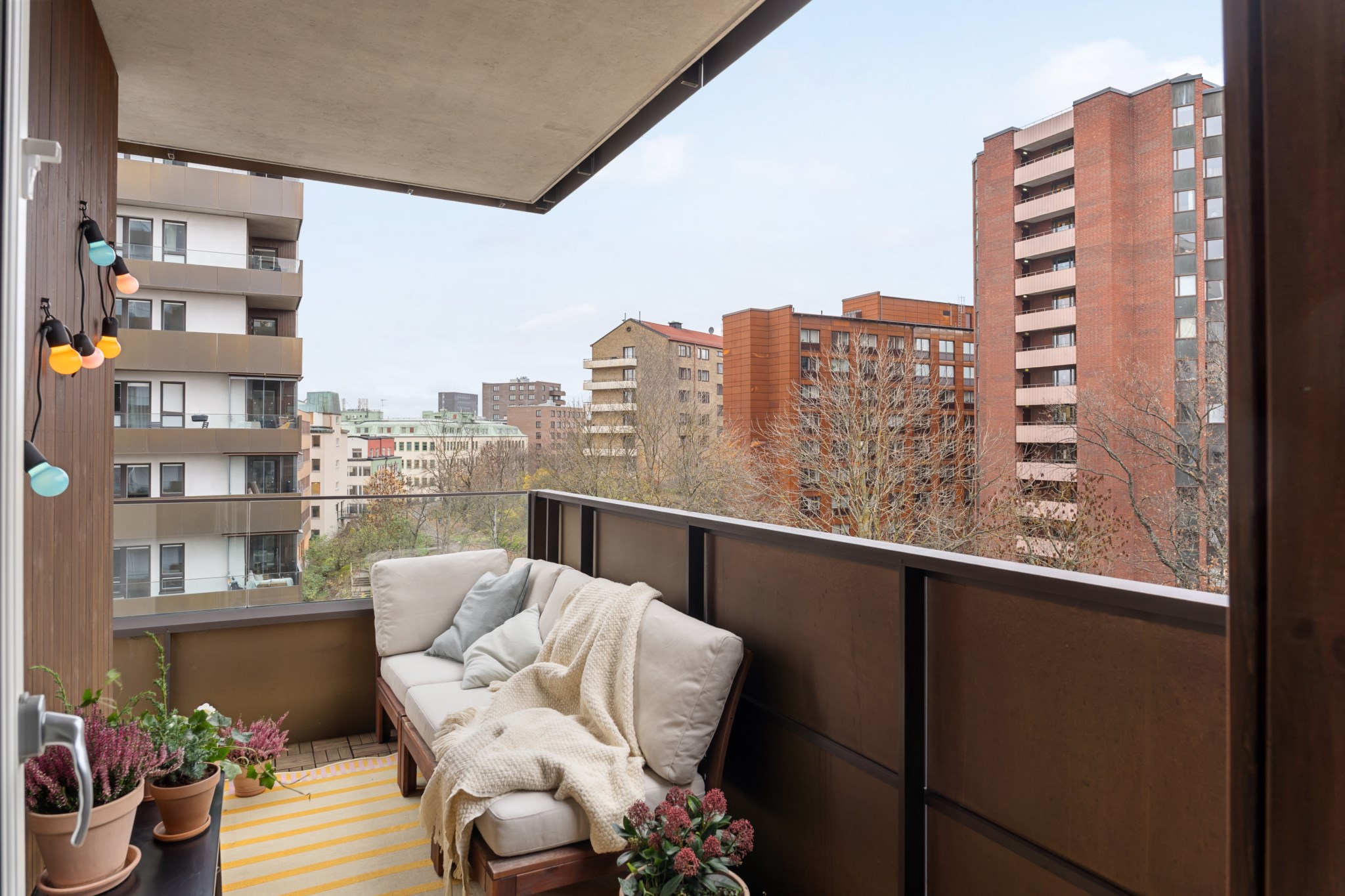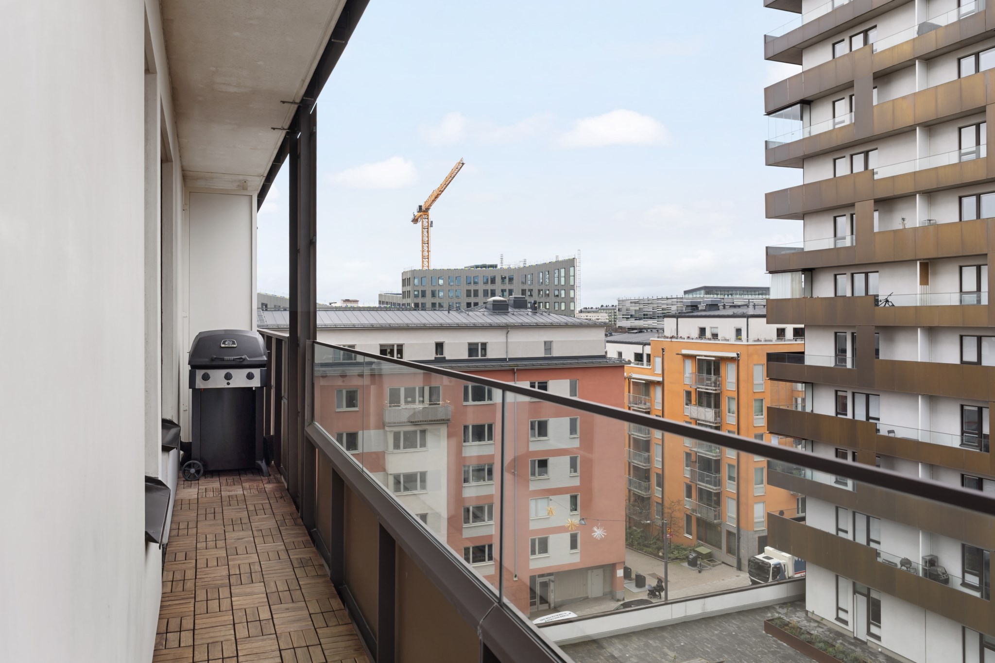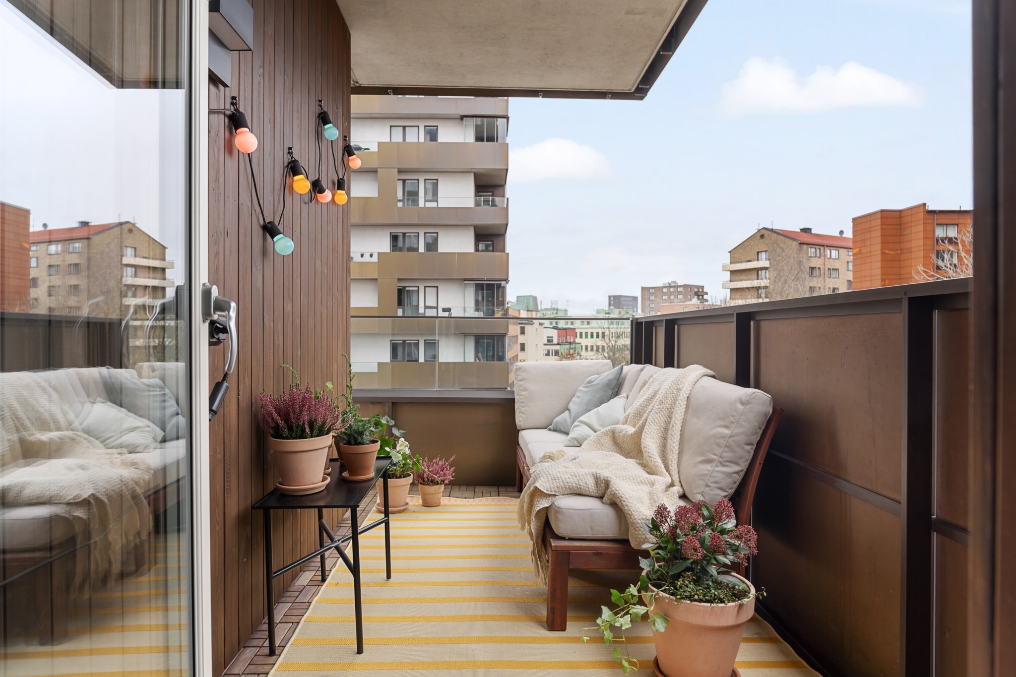En social balkong med plats för soffa, bord och växter, perfekt för avkoppling eller umgänge. Runt hörnet finns även utrymme för grill. Balkongen har trägolv och ett delvis glasat räcke som ger fri utsikt och ett modernt uttryck.