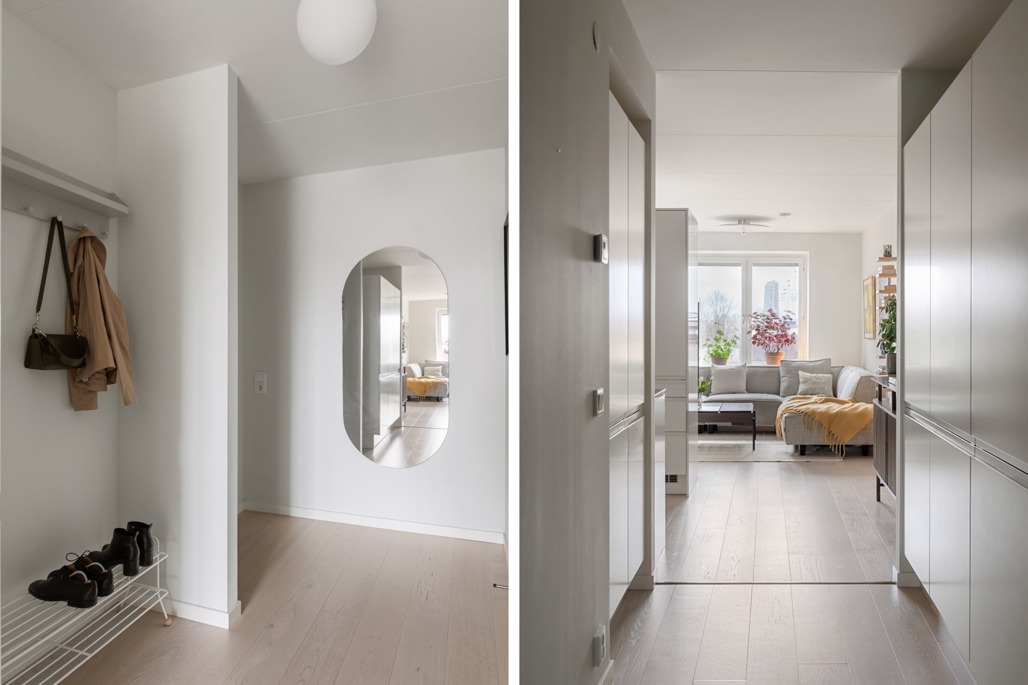 Välkomnande och öppen hall med ljusa väggar och ljust trägolv som ger ett luftigt första intryck. Här finns gott om plats för förvaring med flera garderober, skoställ och avhängningsmöjligheter. En praktisk och inbjudande entré.