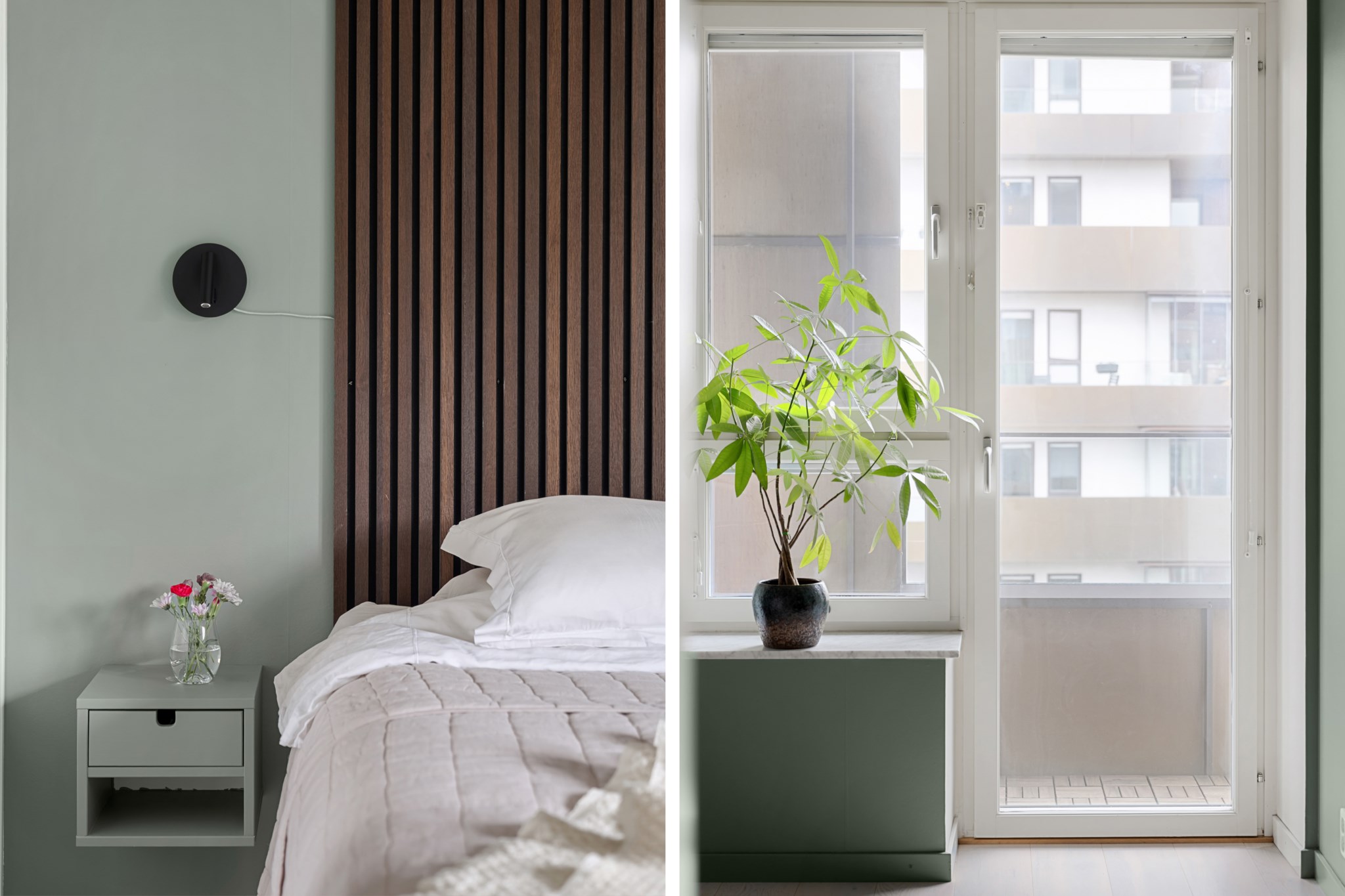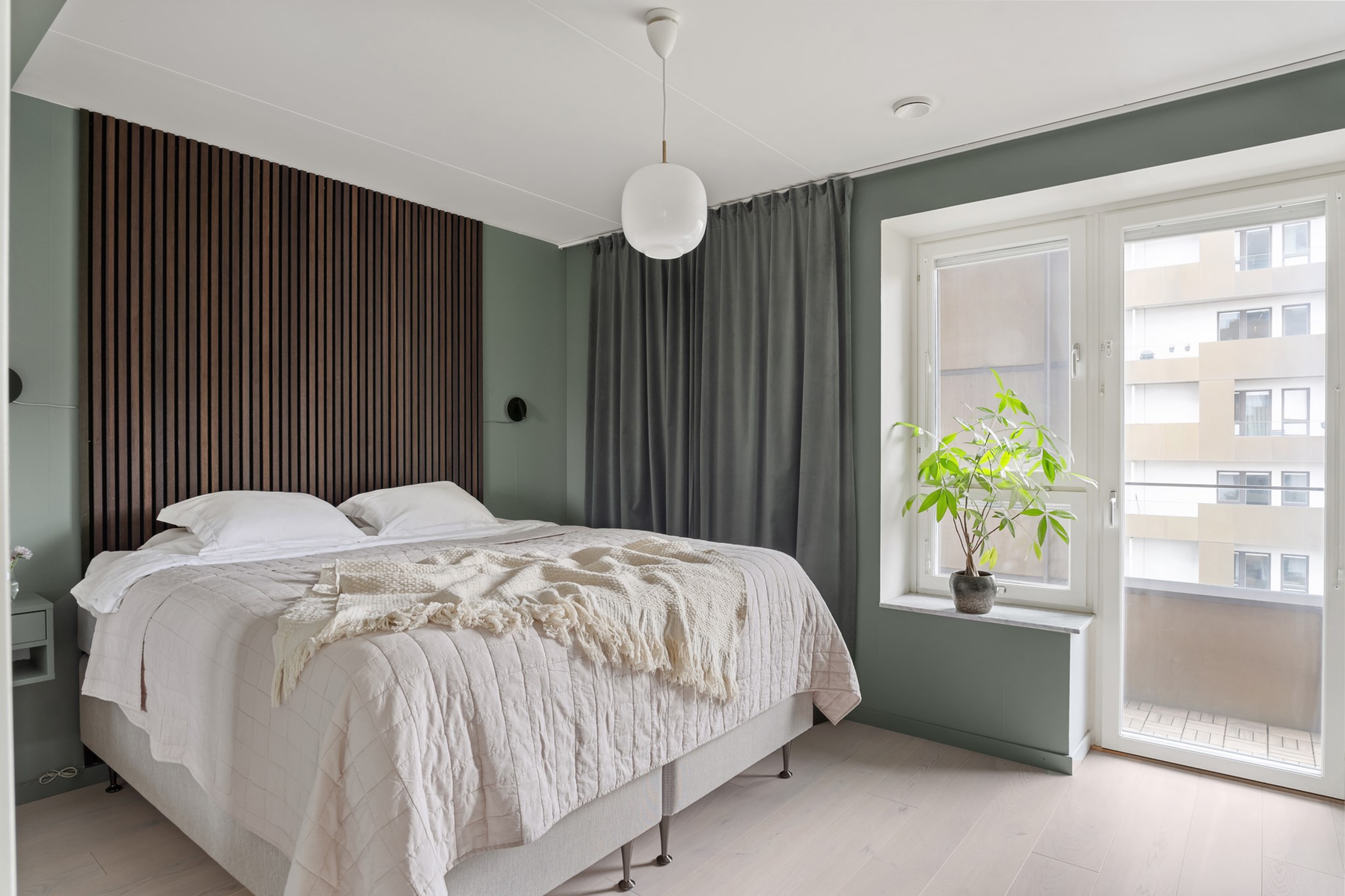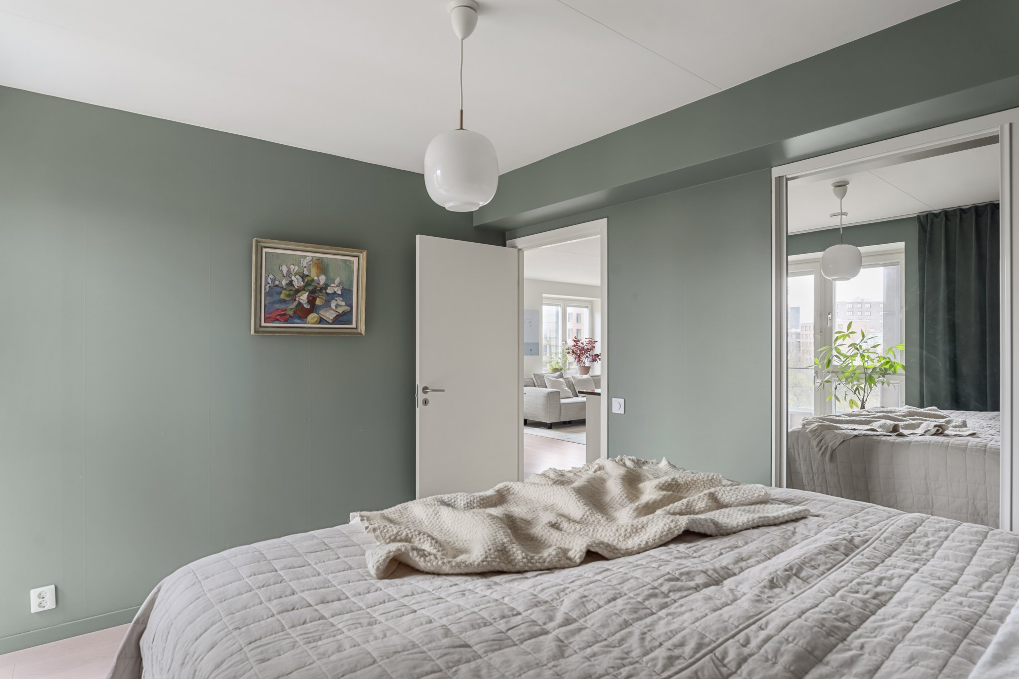 Större sovrum med mustigt gröna väggar och ljust trägolv som ger en varm och inbjudande känsla. Rummet har ett fönsterparti med balkongdörr som släpper in fint ljus. Här finns gott om plats för dubbelsäng, sängbord och ytterligare möblemang. En skjutdörr leder in till en rymlig klädkammare som ger utmärkt förvaringsmöjlighet.