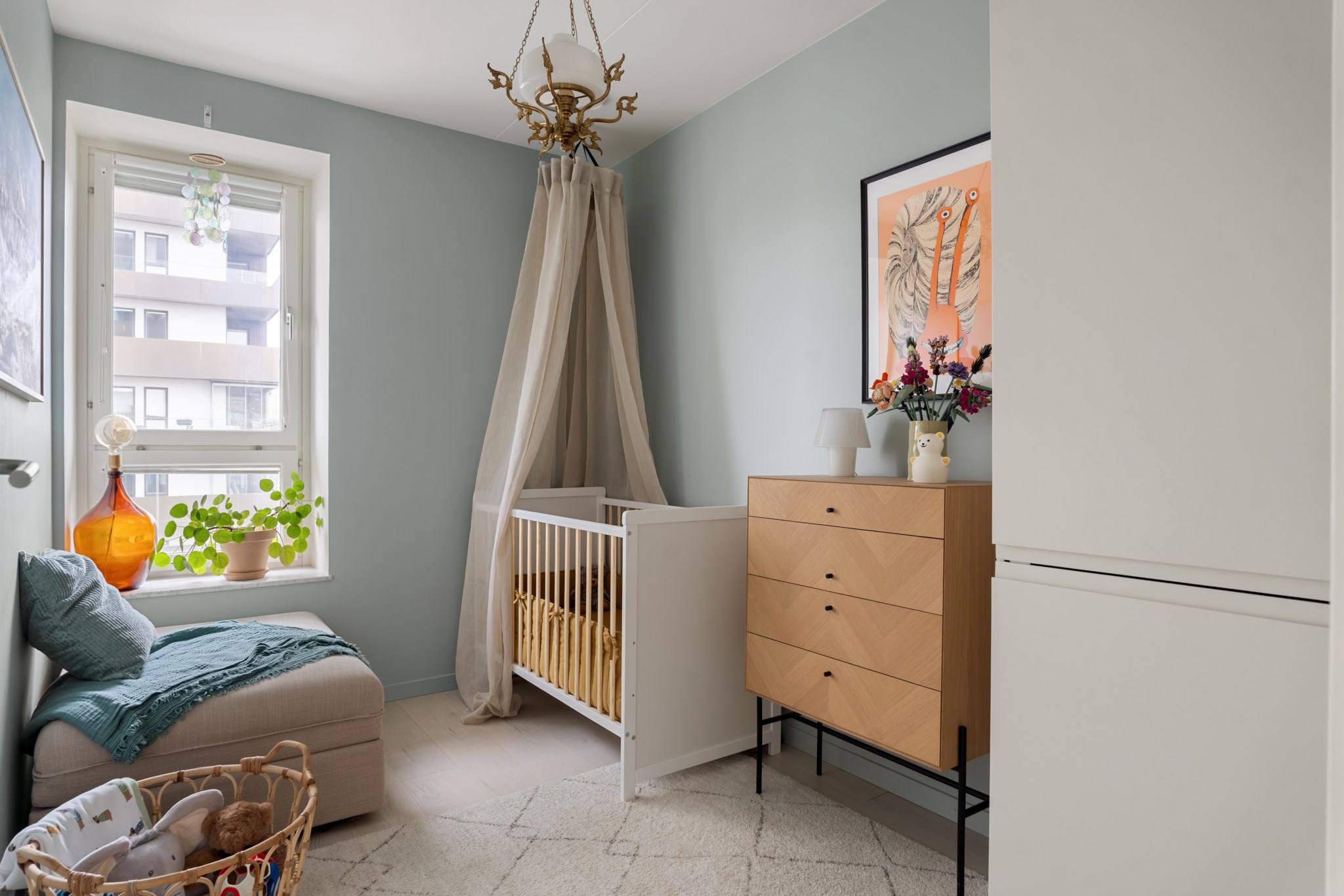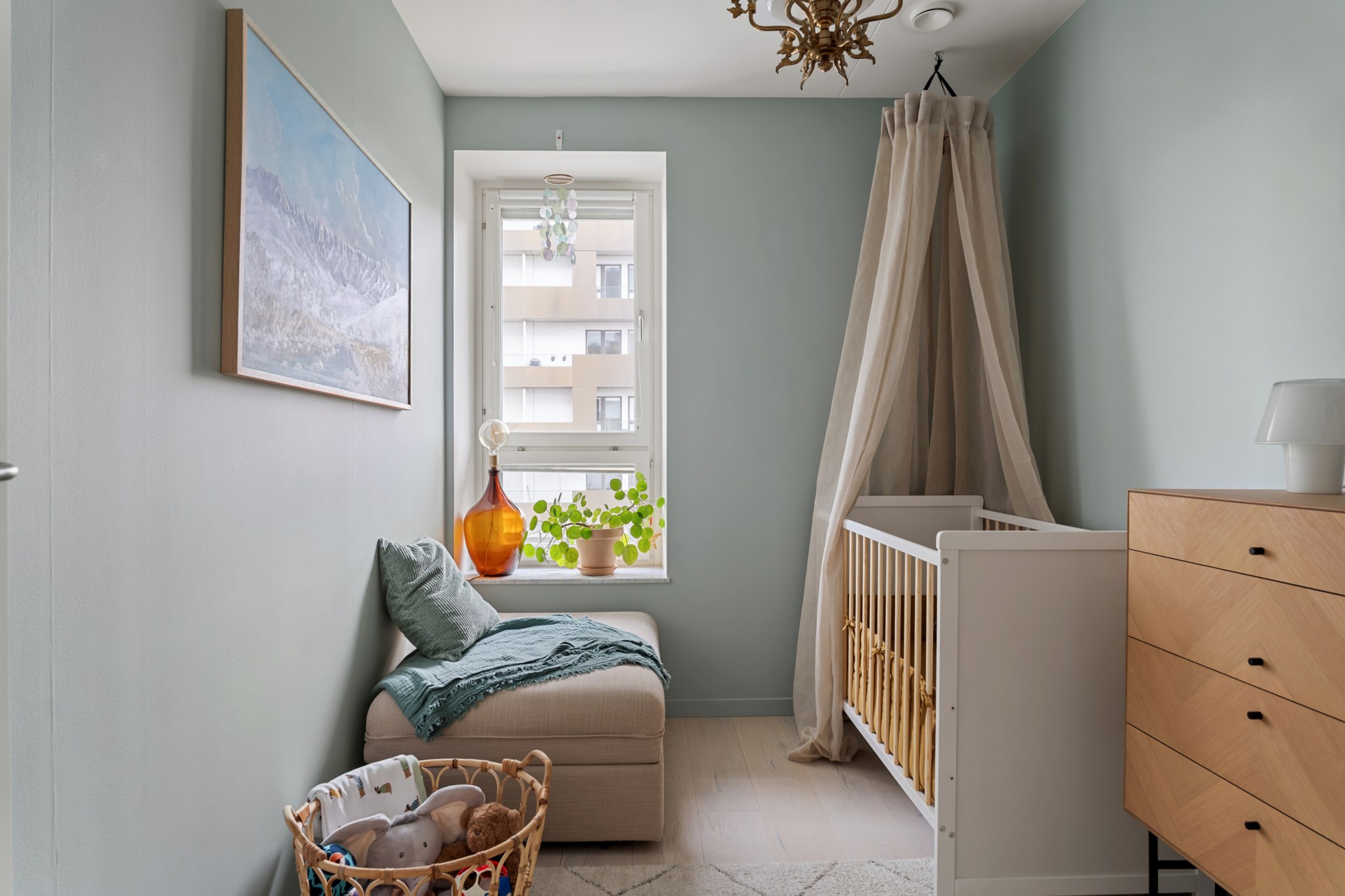 Mindre sovrum med ett fönster, ljust trägolv och ljusgröna väggar som skapar en rofylld atmosfär. Passar utmärkt som barnrum, gästrum eller arbetsrum. Här ryms barnsäng, byrå, sittyta och garderob.
