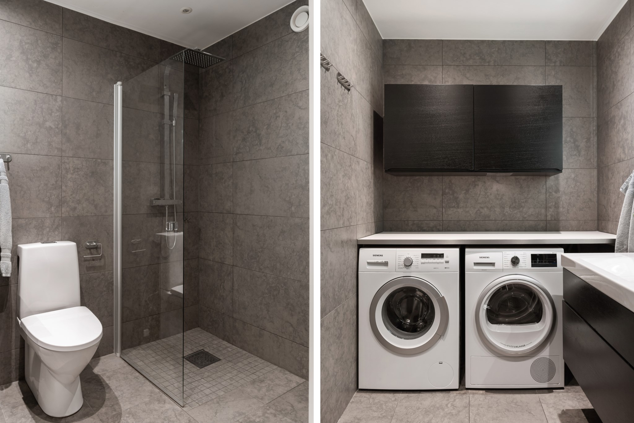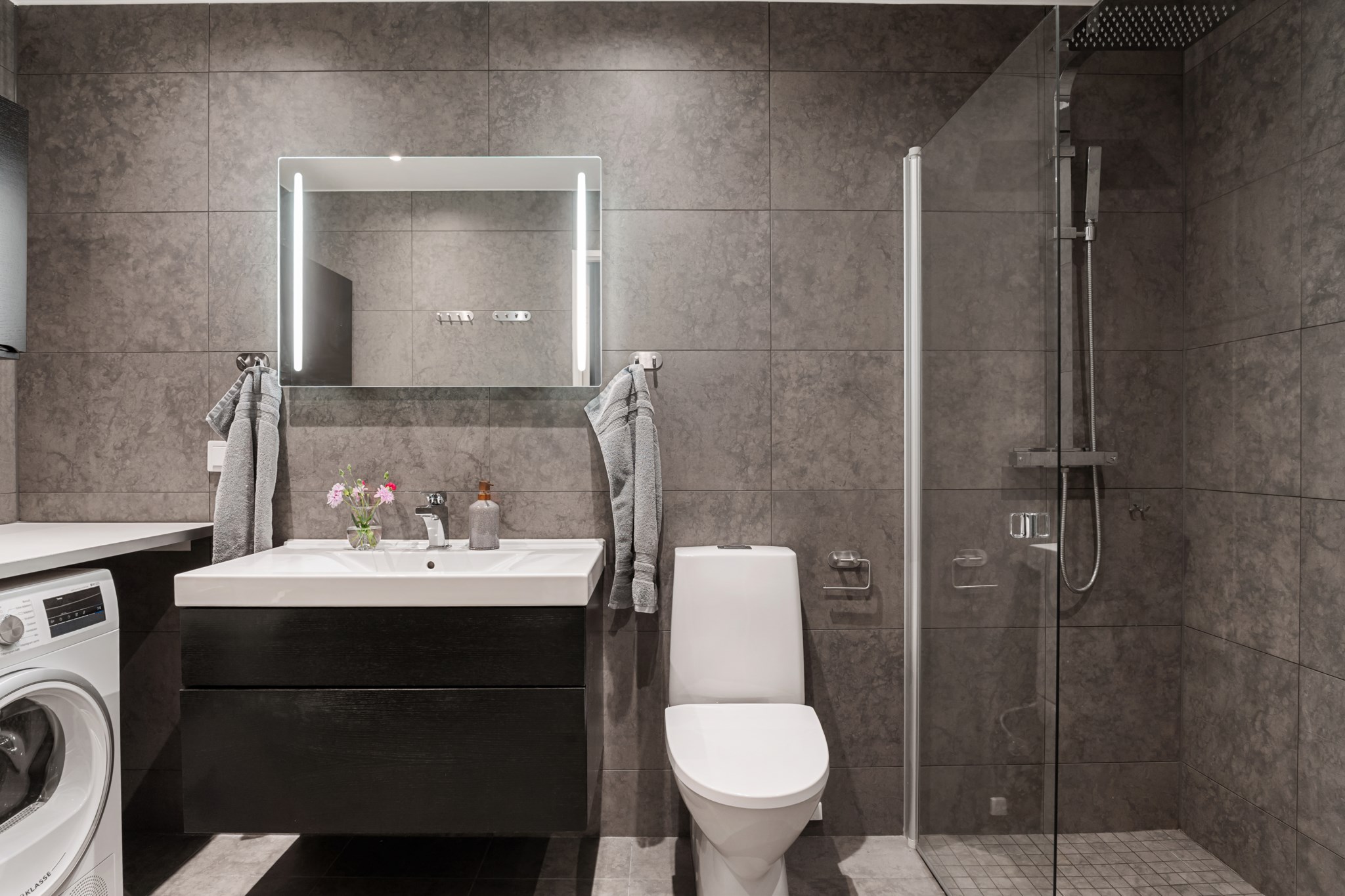 Fräscht och stilrent badrum med moderna materialval i grått kakel och klinker samt svarta och vita detaljer. Här finns dusch, WC, handfat med kommod, samt god förvaring. Badrummet rymmer även tvättmaskin och torktumlare. En trivsam och funktionell yta.