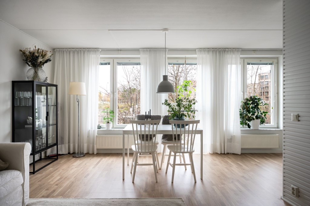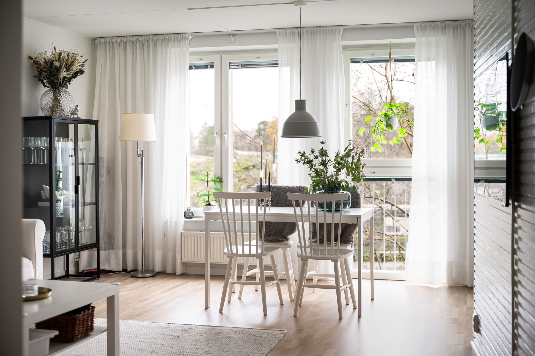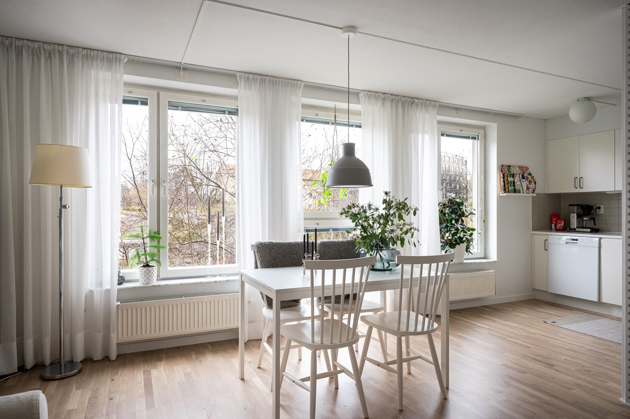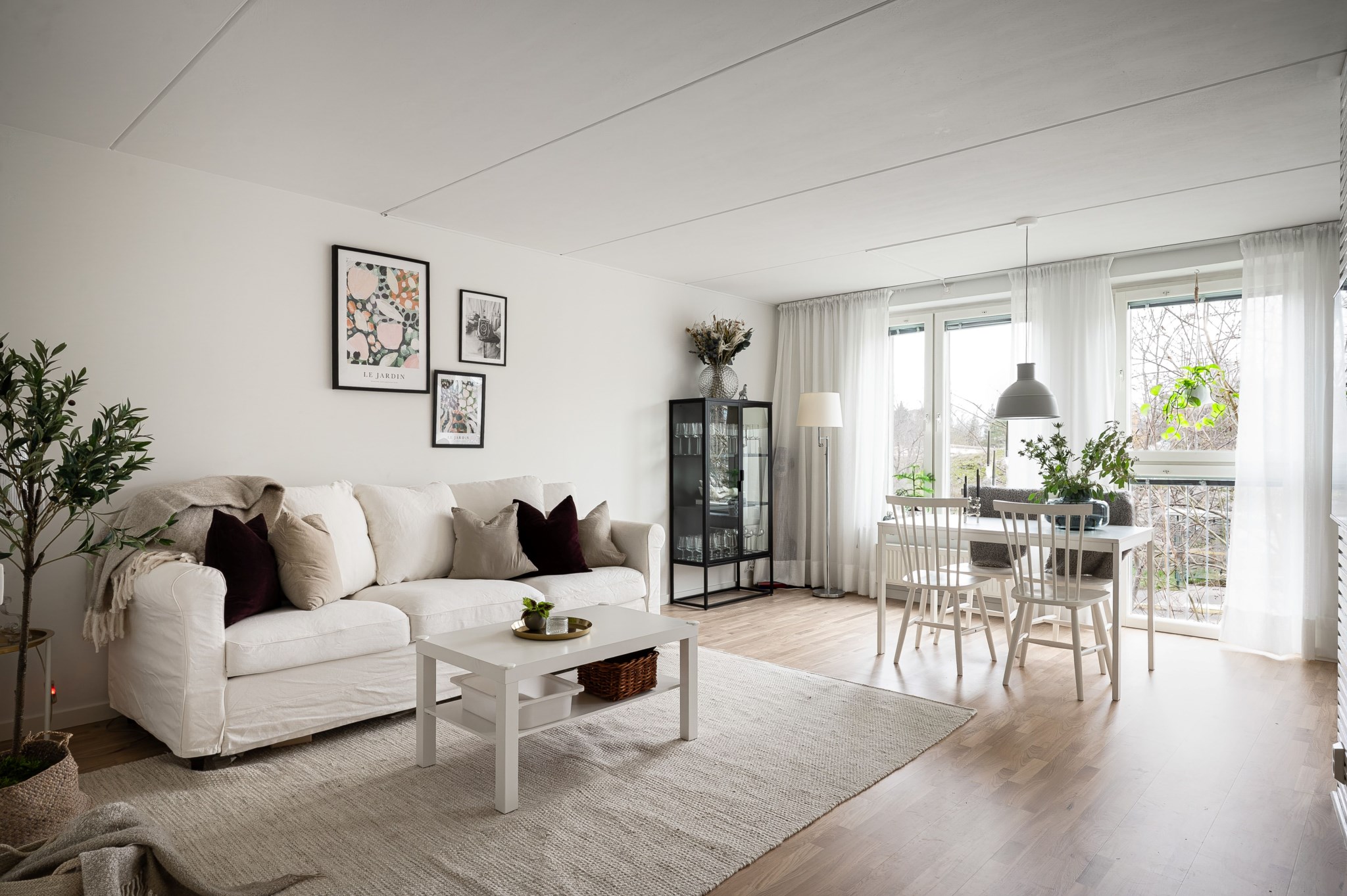Ljust och trivsamt vardagsrum där den öppna planlösningen mot köket skapar en naturligt social och inbjudande sällskapsyta. Här ryms både soffa, matbord och övrig personlig inredning på ett lättmöblerat sätt samtidigt som de stora fönsterpartierna släpper in rikligt med dagsljus. Ytskikten är målade i en ljus kulör och golvet belagt med parkett.