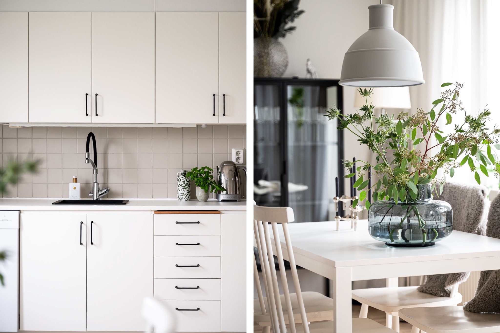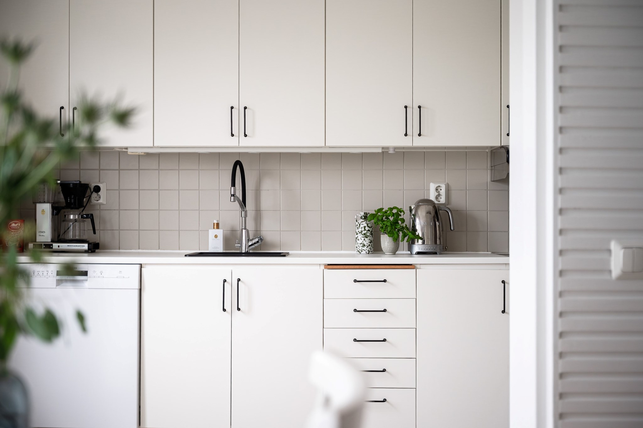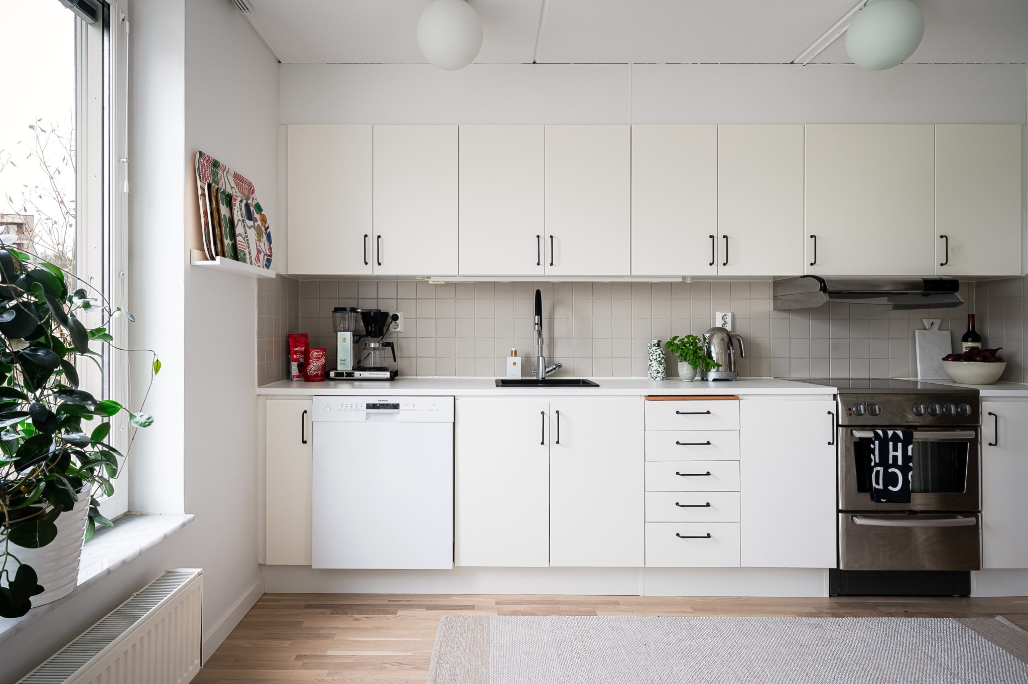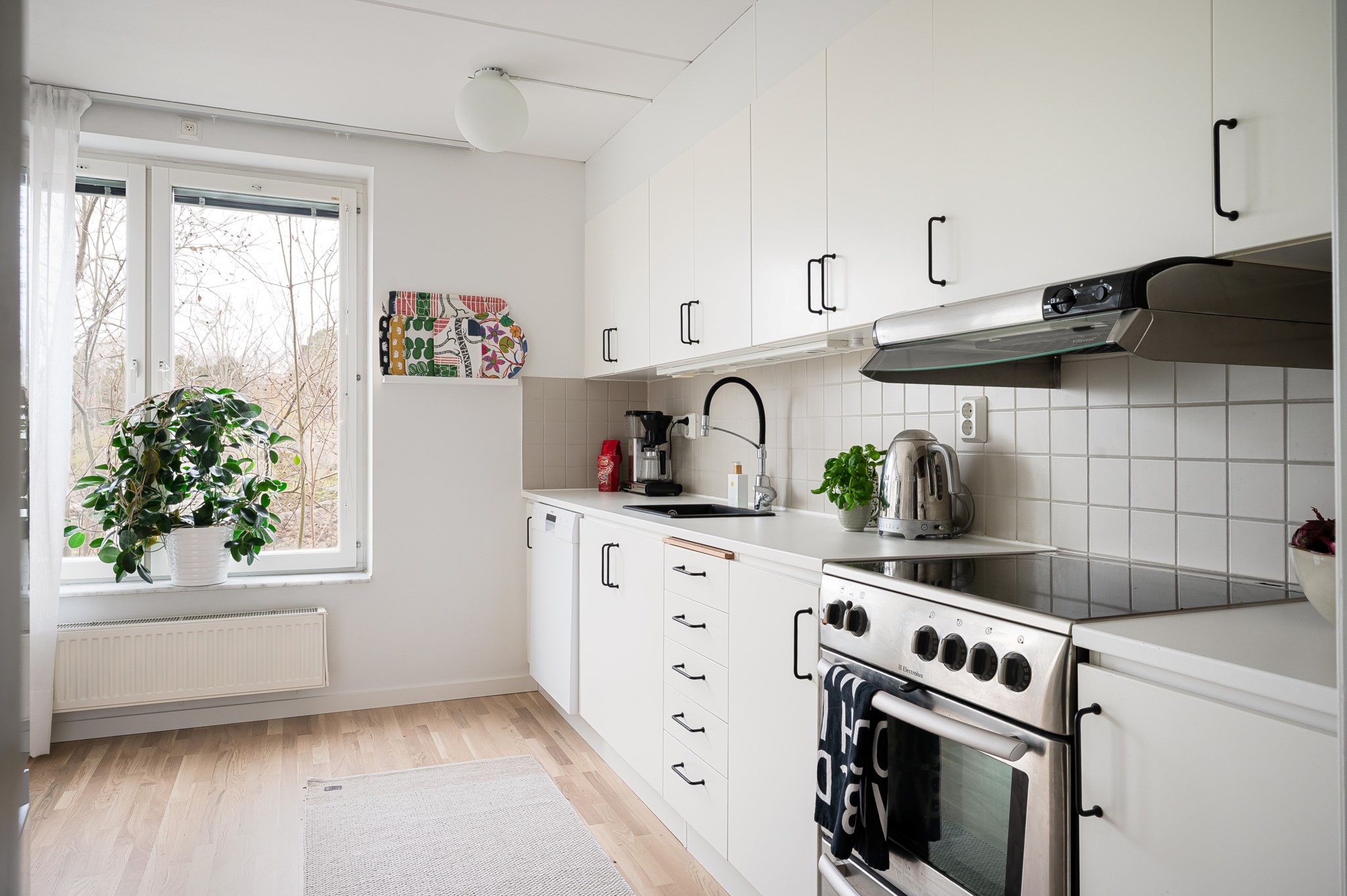Klassiskt och funktionellt kök med ljusa, släta skåpsluckor, ljust kaklad väggpanel och en matchande ljus bänkskiva. Här finns god arbetsyta och en välutrustad maskinpark bestående av kyl/frys, spis, ugn, fläkt och diskmaskin. Ytskikten är målade i en ljus kulör och golvet belagt med parkett.