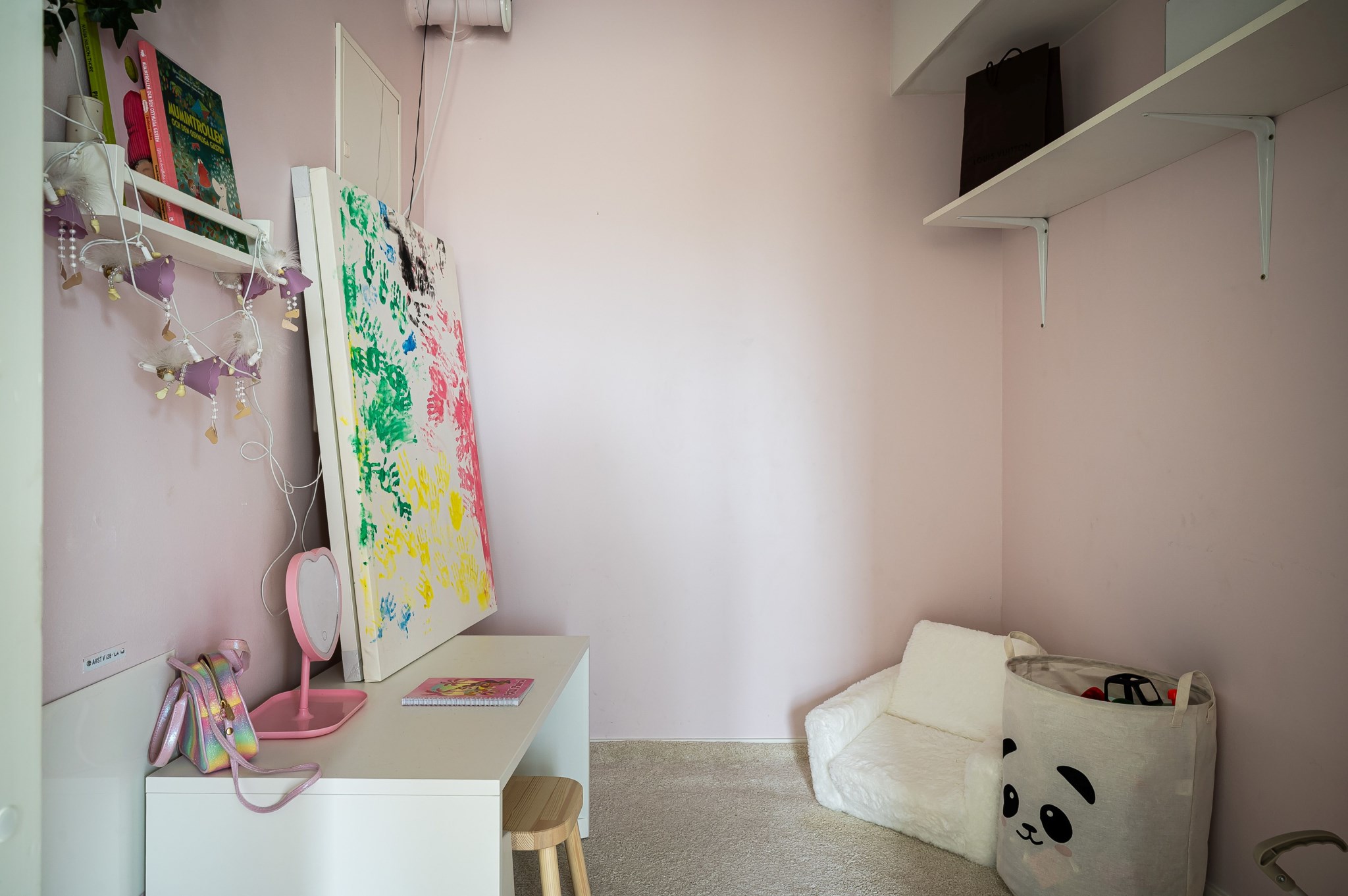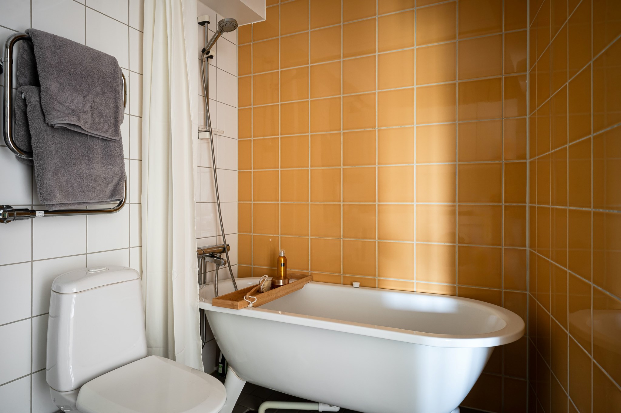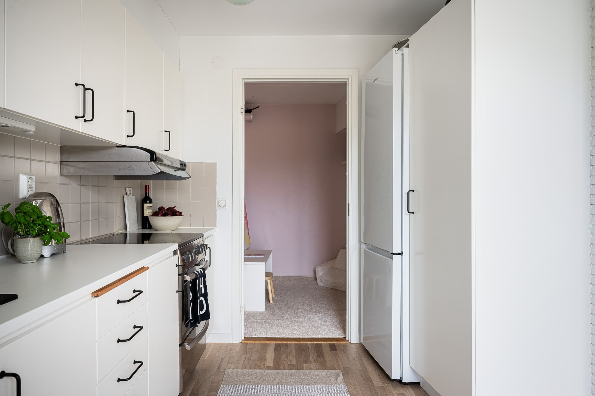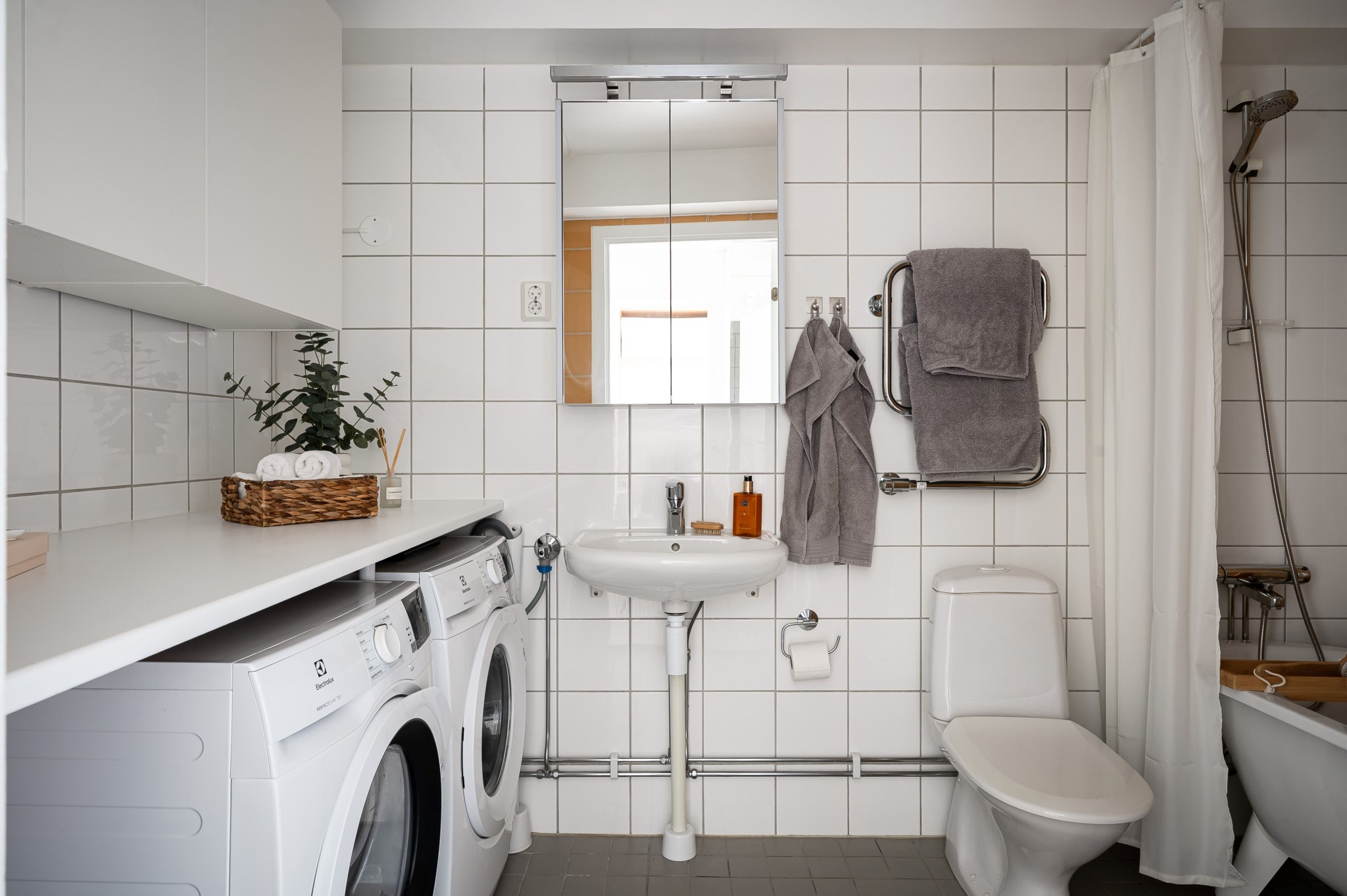 Här finns ett stort och fräscht badrum med både tvättmaskin, torktumlare och badkar – allt för att göra vardagen lite smidigare. Det rymliga sovrummet har gott om förvaring, och det extra rummet används idag som barnrum, men passar lika bra som hemmakontor eller walk-in closet.