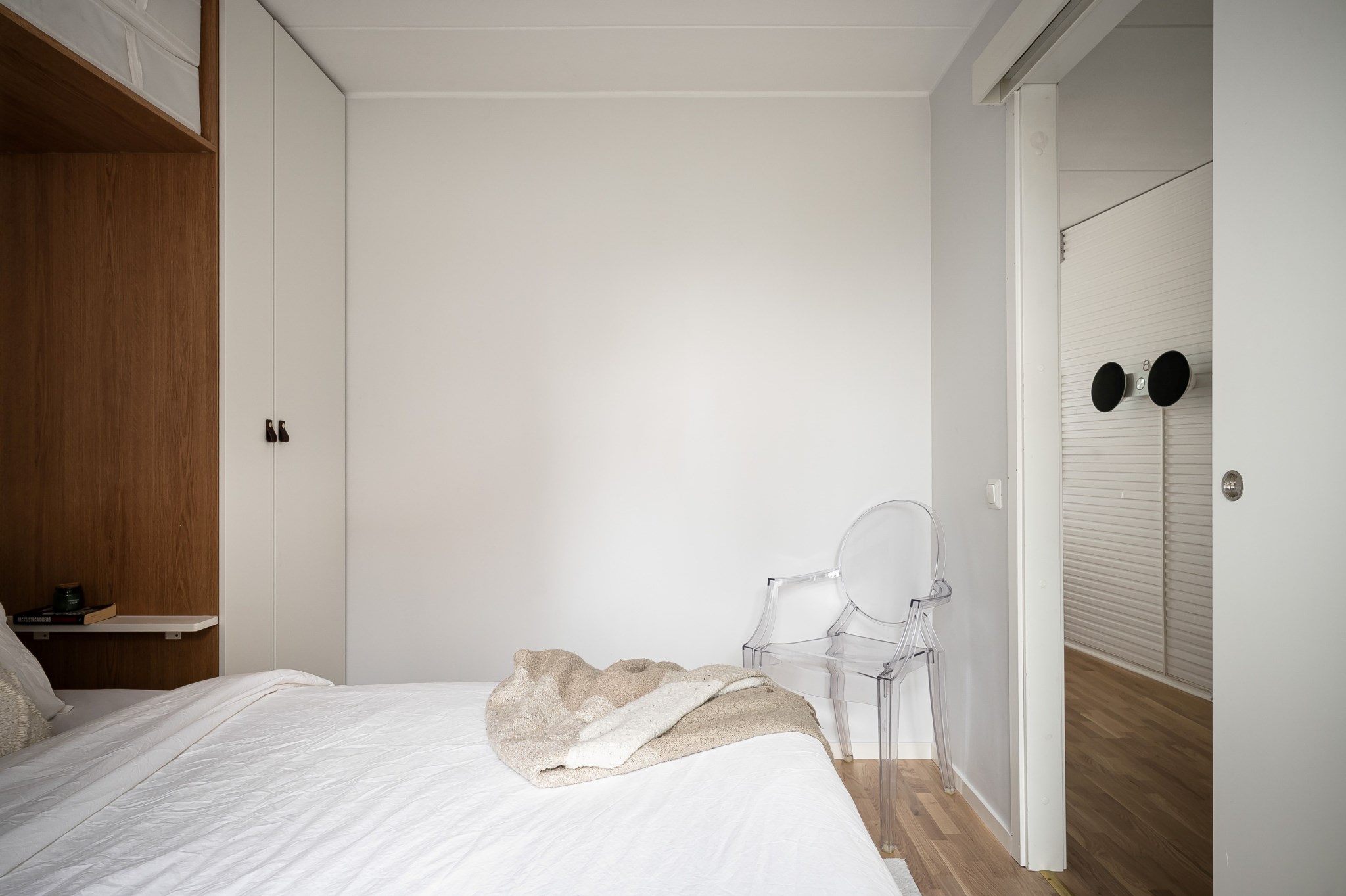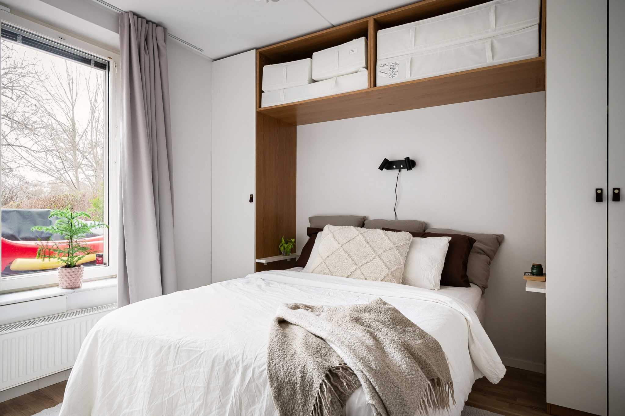 Rogivande sovrum med plats för dubbelsäng och ett generöst ljusinsläpp från det stora fönsterpartiet. Här finns även platsbyggd förvaring runt sängen vilket både ramar in rummet och skapar smarta, lättillgängliga förvaringslösningar. Ytskikten är målade i en ljus kulör och golvet belagt med parkett.