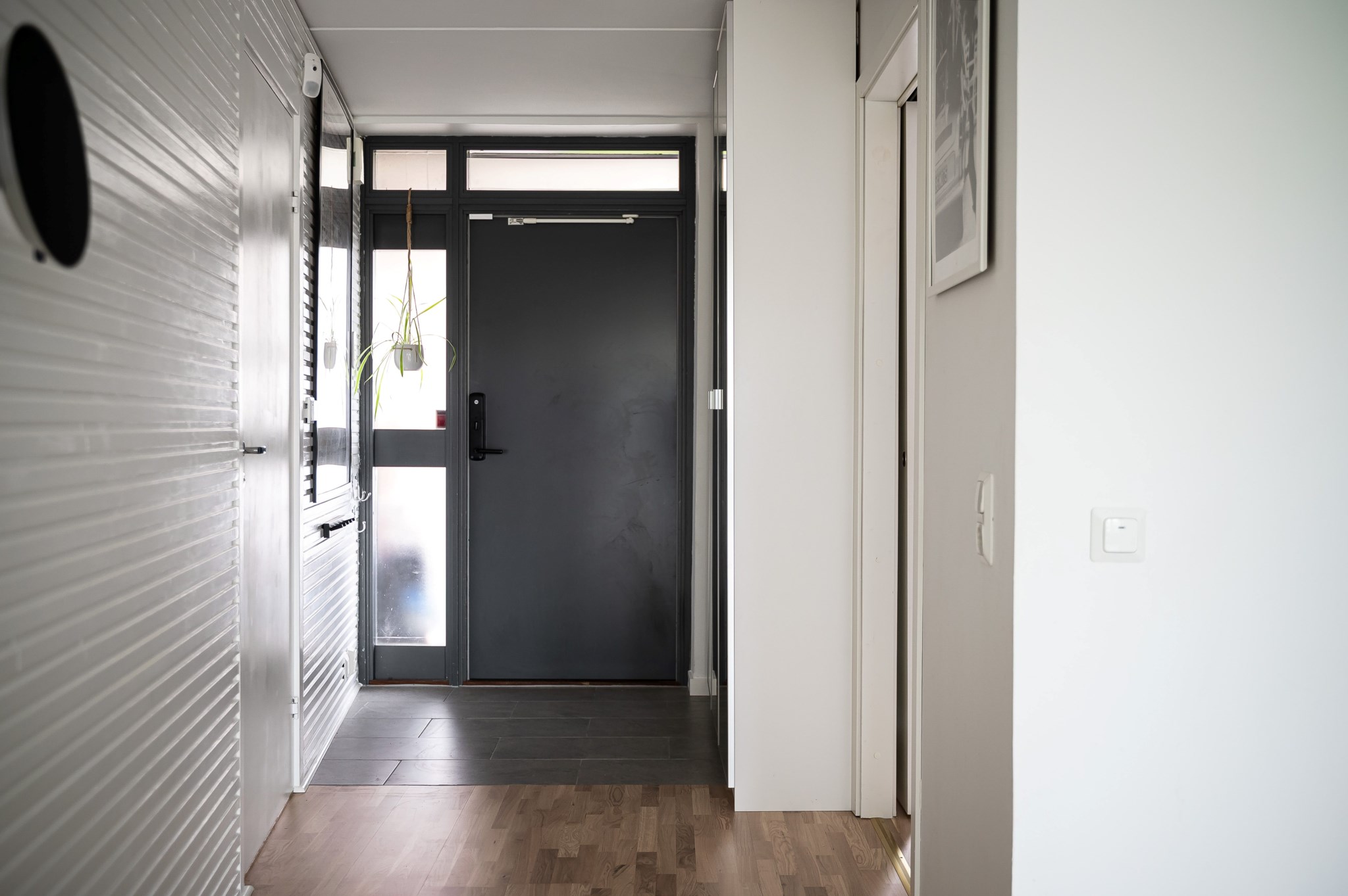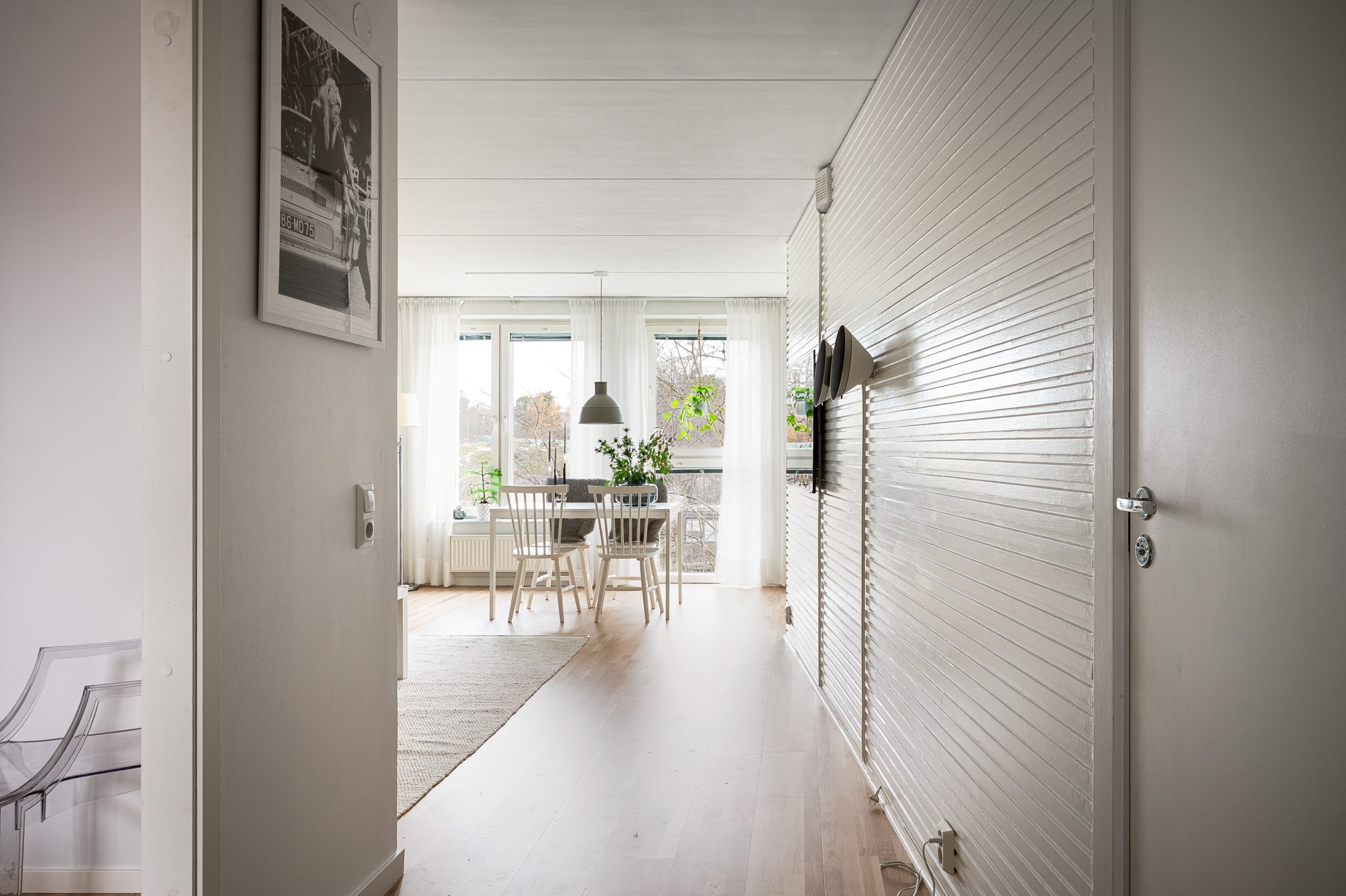 Välkomnande hall med ljust målade ytskikt och ett stilrent, mörkt klinkergolv som harmoniskt övergår i parkett längre in i bostaden. Här finns goda förvaringsmöjligheter i intilliggande garderober samt plats för hatthylla direkt intill ytterdörren om så önskas.